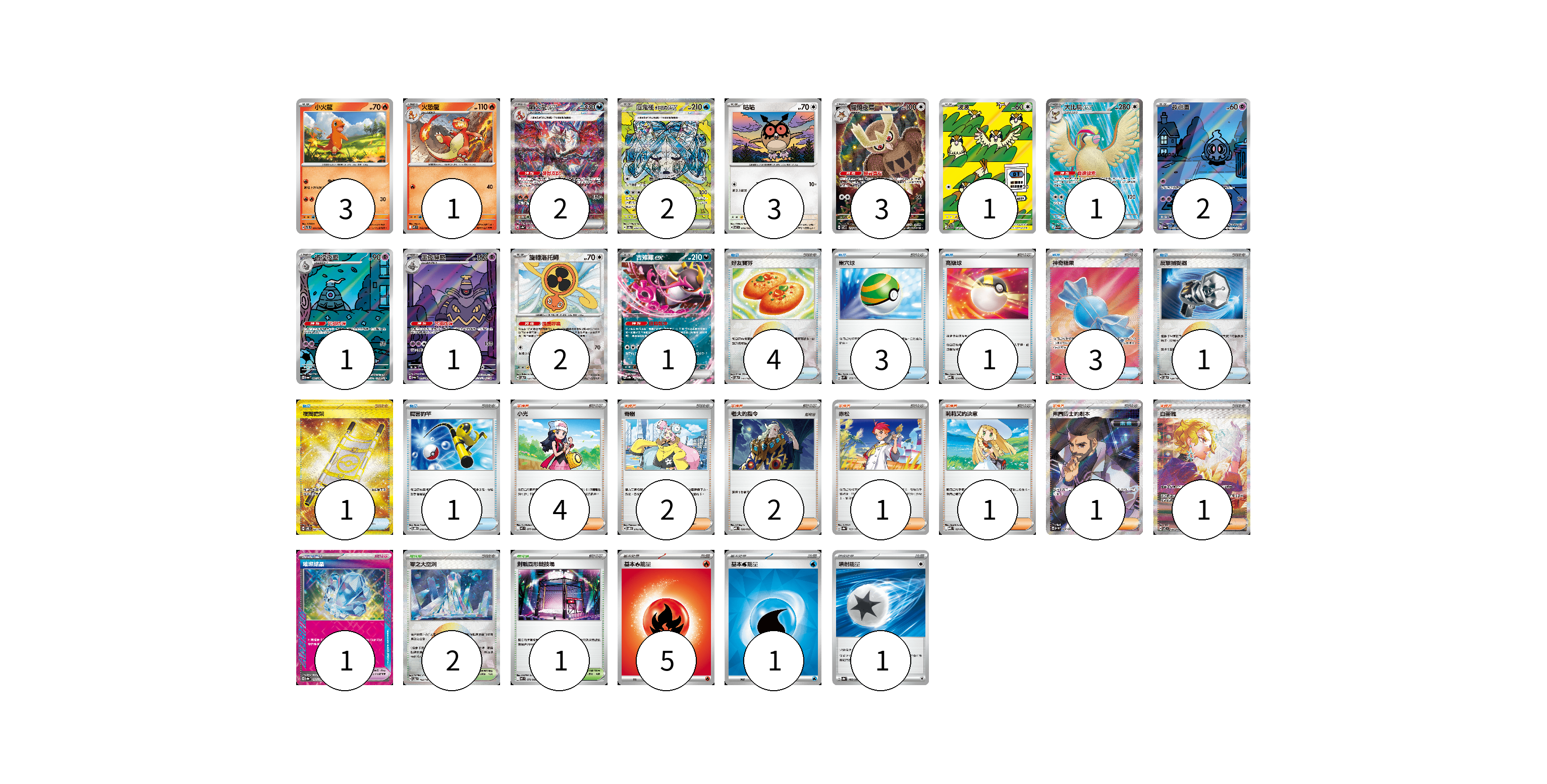 牌組構築方案 以此牌組為基礎新構築牌組 顯示卡面 顯示列表 寶可夢卡(23) 3 1 2 2 3 3 1 1 2 1 1 2 1 寶可夢道具(1) 1 物品卡(14) 4 3 1 3 1 1 1 支援者卡(12) 4 2 2 1 1 1 1 競技場卡(3) 2 1 能量卡(7) 5 1 1 寶可夢卡(23) 卡牌名稱 張數 卡牌名稱 張數 小火龍 SVTL 001/021 03 火恐龍 M2 012/080 01 噴火龍ex SV4a 349/190 02 厄鬼椪 水井面具ex SV8a 208/187 02 咕咕 SV7 076/102 03 貓頭夜鷹 SV7 114/102 03 波波 SV3 118/108 01 大比鳥ex SV3 128/108 01 夜巡靈 SV6a 068/064 02 彷徨夜靈 SV6a 069/064 01 黑夜魔靈 SV6a 070/064 01 旋轉洛托姆 SV8a 131/187 02 吉雉雞ex SV8a 104/187 01 寶可夢道具(1) 卡牌名稱 張數 卡牌名稱 張數 璀璨結晶 SV8a 152/187 01 物品卡(14) 卡牌名稱 張數 卡牌名稱 張數 好友寶芬 SV8a 147/187 04 巢穴球 SVM 133/175 03 高級球 MBD 014/022 01 神奇糖果 M1S 082/063 03 反擊捕捉器 SV8a 139/187 01 夜間擔架 SV8 137/106 01 厲害釣竿 SVOD 010/020 01 支援者卡(12) 卡牌名稱 張數 卡牌名稱 張數 小光 M2 077/080 04 奇樹 SVOD 016/020 02 老大的指令 MBD 020/022 02 赤松 SV8a 163/187 01 莉莉艾的決意 MBD 021/022 01 弗圖博士的劇本 SV4M 086/066 01 白蕾雅 SV7 132/102 01 競技場卡(3) 卡牌名稱 張數 卡牌名稱 張數 零之大空洞 SV8a 182/187 02 對戰圓形競技場 M2 079/080 01 能量卡(7) 卡牌名稱 張數 卡牌名稱 張數 基本【火】能量 M-P FIR 05 基本【水】能量 SVM WAT 01 噴射能量 SV8a 185/187 01 以此牌組為基礎新構築牌組 牌組編碼 eoMsba-jlAgob-GajKlb copy 列印牌組單 牌組編碼已複製 分享至SNS