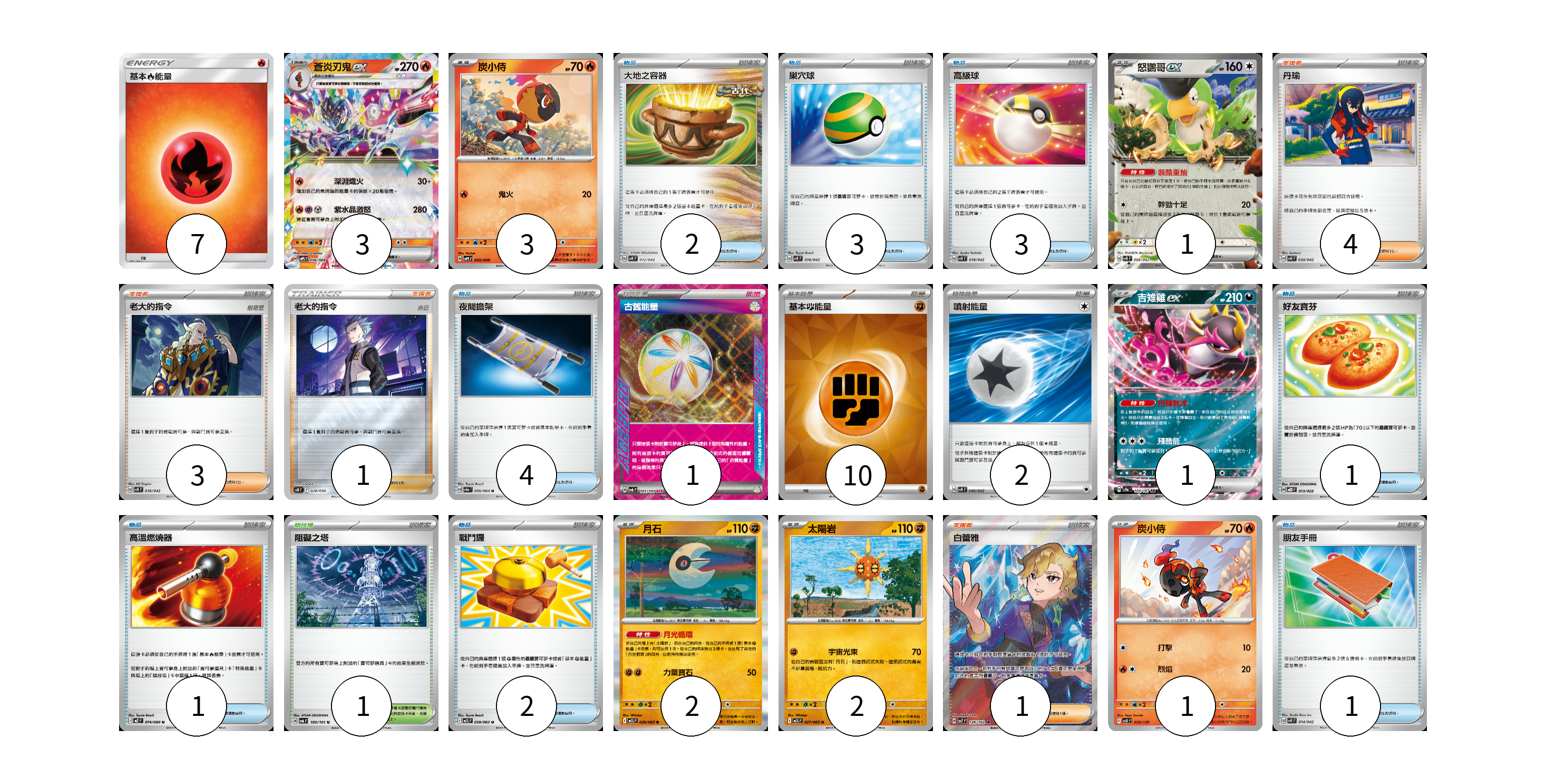 牌組構築方案 以此牌組為基礎新構築牌組 顯示卡面 顯示列表 寶可夢卡(13) 3 3 1 1 2 2 1 物品卡(17) 2 3 3 4 1 1 2 1 支援者卡(9) 4 3 1 1 競技場卡(1) 1 能量卡(20) 7 1 10 2 寶可夢卡(13) 卡牌名稱 張數 卡牌名稱 張數 蒼炎刃鬼ex SVPS 006/008 03 炭小侍 SVPS 005/008 03 怒鸚哥ex SVK 006/042 01 吉雉雞ex SV8a 104/187 01 月石 M1L 026/063 02 太陽岩 M1L 027/063 02 炭小侍 SVD 020/139 01 物品卡(17) 卡牌名稱 張數 卡牌名稱 張數 大地之容器 SVK 012/042 02 巢穴球 SVK 016/042 03 高級球 SVK 018/042 03 夜間擔架 SV6a 056/064 04 好友寶芬 MBD 013/022 01 高溫燃燒器 M2 074/080 01 戰鬥鑼 M1L 059/063 02 朋友手冊 SVK 014/042 01 支援者卡(9) 卡牌名稱 張數 卡牌名稱 張數 丹瑜 SVK 030/042 04 老大的指令 SVK 036/042 03 老大的指令(赤日) SO 028/030 01 白蕾雅 SV7 126/102 01 競技場卡(1) 卡牌名稱 張數 卡牌名稱 張數 阻礙之塔 SV6 100/101 01 能量卡(20) 卡牌名稱 張數 卡牌名稱 張數 基本火能量 AS6D FIR 07 古舊能量 SV6 101/101 01 基本【鬥】能量 SVM FIG 10 噴射能量 SVK 040/042 02 以此牌組為基礎新構築牌組 牌組編碼 eoiOwq-EejPho-hTjQNb copy 列印牌組單 牌組編碼已複製 分享至SNS