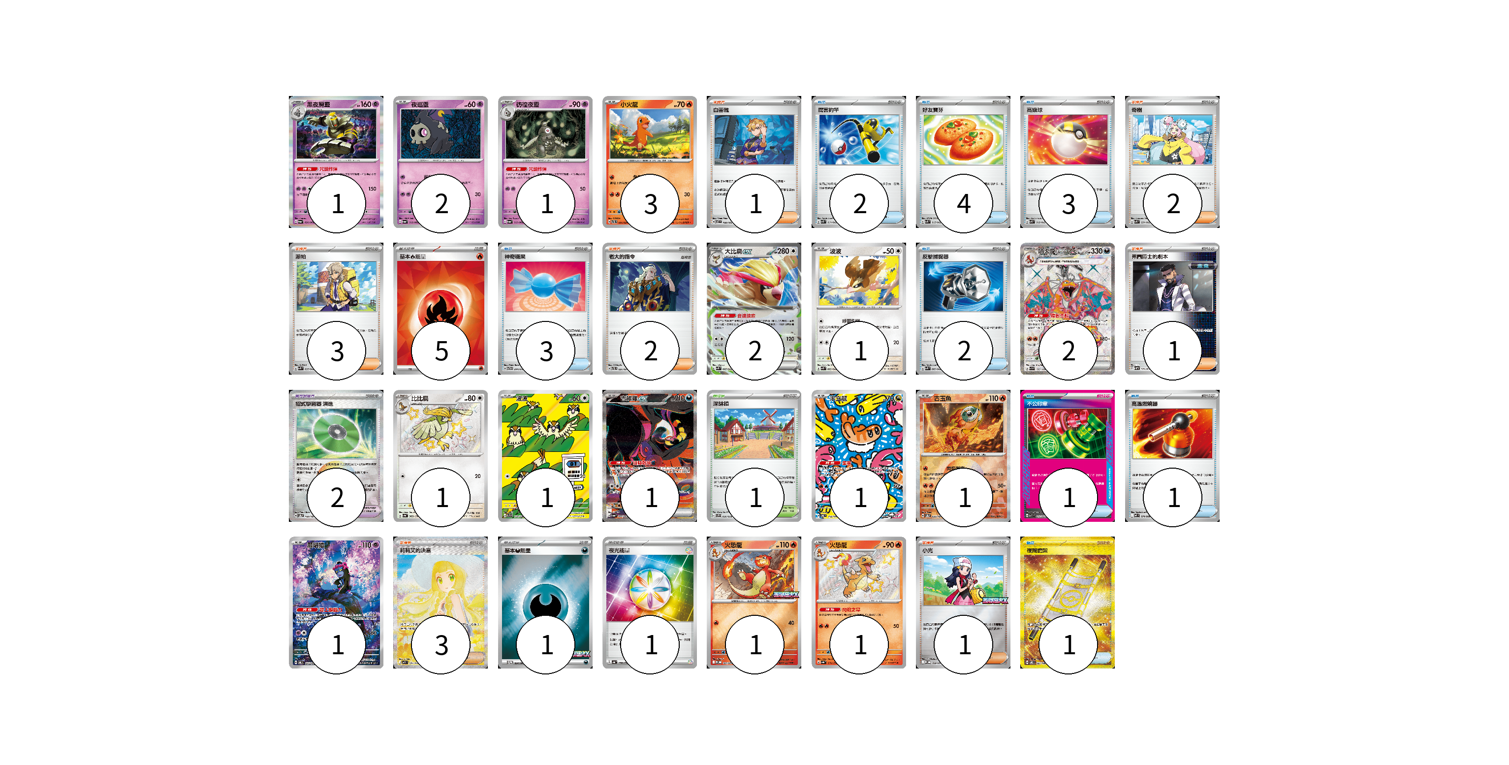 牌組構築方案 以此牌組為基礎新構築牌組 顯示卡面 顯示列表 寶可夢卡(20) 1 2 1 3 2 1 2 1 1 1 1 1 1 1 1 寶可夢道具(2) 2 物品卡(17) 2 4 3 3 2 1 1 1 支援者卡(13) 1 2 3 2 1 3 1 競技場卡(1) 1 能量卡(7) 5 1 1 寶可夢卡(20) 卡牌名稱 張數 卡牌名稱 張數 黑夜魔靈 SV6a 020/064 01 夜巡靈 SV6a 018/064 02 彷徨夜靈 SV6a 019/064 01 小火龍 SVTL 001/021 03 大比鳥ex SVK 005/042 02 波波 SVK 003/042 01 噴火龍ex SV3 125/108 02 比比鳥 SV4a 305/190 01 波波 SV3 118/108 01 吉雉雞ex SV6a 089/064 01 米立龍 SV6 112/101 01 古玉魚 SV8a 025/187 01 願增猿 SV6 107/101 01 火恐龍 M-P 021/M-P 01 火恐龍 SV4a 211/190 01 寶可夢道具(2) 卡牌名稱 張數 卡牌名稱 張數 招式學習器 演進 SV8a 160/187 02 物品卡(17) 卡牌名稱 張數 卡牌名稱 張數 厲害釣竿 SVK 011/042 02 好友寶芬 SVK 015/042 04 高級球 SVK 018/042 03 神奇糖果 SVTG 014/019 03 反擊捕捉器 SVK 009/042 02 不公印章 MBD 011/022 01 高溫燃燒器 M2 074/080 01 夜間擔架 SV8 137/106 01 支援者卡(13) 卡牌名稱 張數 卡牌名稱 張數 白蕾雅 SV7 100/102 01 奇樹 SVK 031/042 02 派帕 SVK 035/042 03 老大的指令 SVTL 021/021 02 弗圖博士的劇本 SVHM 021/022 01 莉莉艾的決意 M1L 091/063 03 小光 M-P 028/M-P 01 競技場卡(1) 卡牌名稱 張數 卡牌名稱 張數 深缽鎮 SVF 036/038 01 能量卡(7) 卡牌名稱 張數 卡牌名稱 張數 基本【火】能量 SVK FIR 05 基本【惡】能量 M-P 034/M-P 01 夜光能量 SV4a 190/190 01 以此牌組為基礎新構築牌組 牌組編碼 epMbXf-WCKnFC-xaELvA copy 列印牌組單 牌組編碼已複製 分享至SNS
