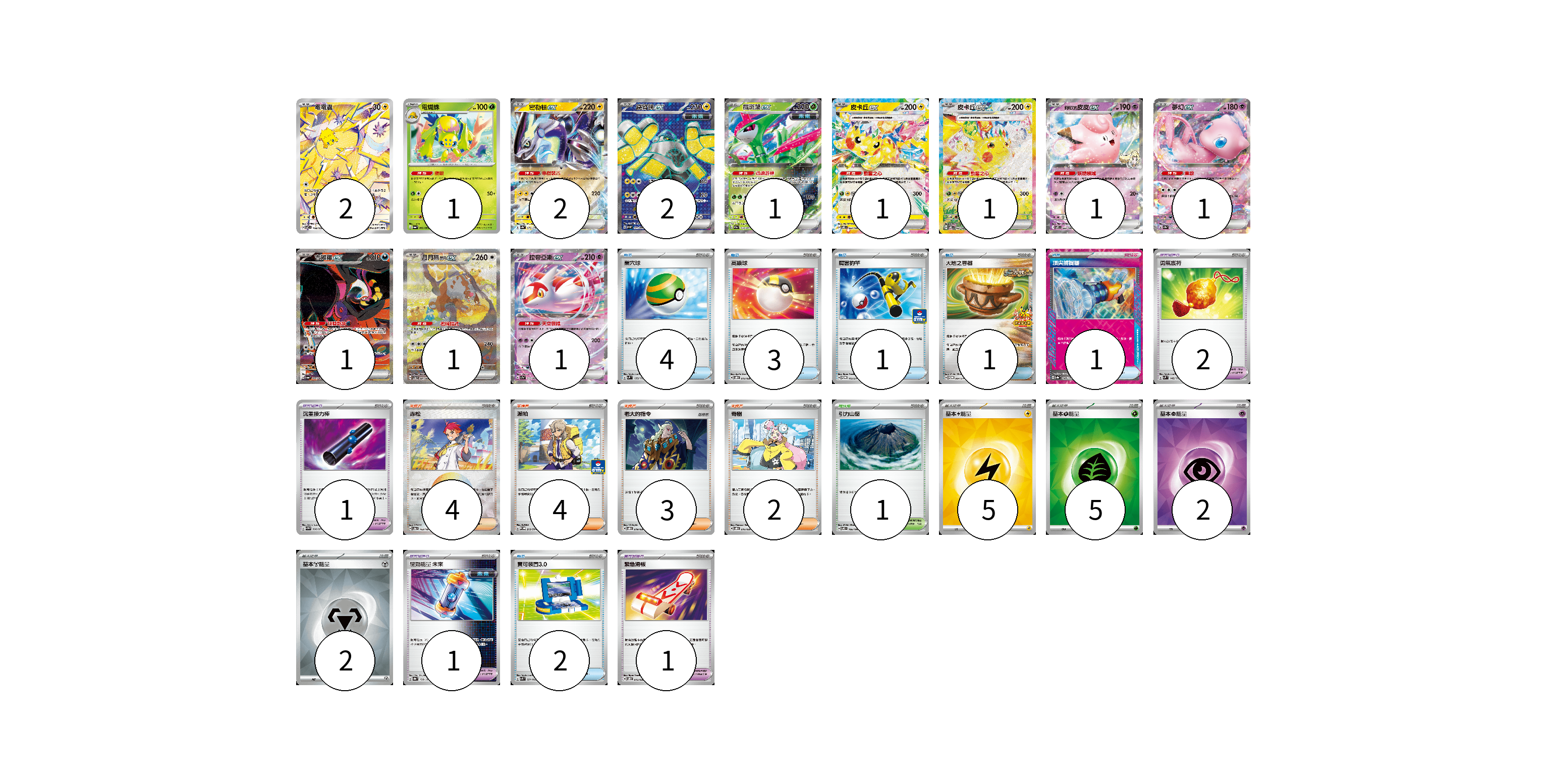 牌組構築方案 以此牌組為基礎新構築牌組 顯示卡面 顯示列表 寶可夢卡(15) 2 1 2 2 1 1 1 1 1 1 1 1 寶可夢道具(5) 2 1 1 1 物品卡(12) 4 3 1 1 1 2 支援者卡(13) 4 4 3 2 競技場卡(1) 1 能量卡(14) 5 5 2 2 寶可夢卡(15) 卡牌名稱 張數 卡牌名稱 張數 電電蟲 SV7 108/102 02 電蜘蛛 SV6a 002/064 01 密勒頓ex SV4a 071/190 02 鐵臂膀ex SV4M 079/066 02 鐵斑葉ex SV5M 016/071 01 皮卡丘ex SV8 033/106 01 皮卡丘ex SV8 132/106 01 莉莉艾的皮皮ex SV9 033/100 01 夢幻ex SV2a 151/165 01 吉雉雞ex SV6a 089/064 01 月月熊 赫月 ex SV5a 091/066 01 拉帝亞斯ex SV7a 019/064 01 寶可夢道具(5) 卡牌名稱 張數 卡牌名稱 張數 勇氣護符 SVM 142/175 02 沉重接力棒 SV5M 066/071 01 驅勁能量 未來 SV8a 158/187 01 緊急滑板 SVOD 015/020 01 物品卡(12) 卡牌名稱 張數 卡牌名稱 張數 巢穴球 SVM 133/175 04 高級球 SVOD 012/020 03 厲害釣竿 SV-P 112/SV-P 01 大地之容器 SV-P 084/SV-P 01 頂尖捕捉器 SV8a 148/187 01 寶可裝置3.0 SVK 021/042 02 支援者卡(13) 卡牌名稱 張數 卡牌名稱 張數 赤松 SV8a 163/187 04 派帕 SV-P 213/SV-P 04 老大的指令 SVOD 019/020 03 奇樹 SVOD 016/020 02 競技場卡(1) 卡牌名稱 張數 卡牌名稱 張數 引力山岳 SV8 106/106 01 能量卡(14) 卡牌名稱 張數 卡牌名稱 張數 基本【雷】能量 SVM LIG 05 基本【草】能量 SVM GRA 05 基本【超】能量 SVM PSY 02 基本【鋼】能量 SVM MET 02 以此牌組為基礎新構築牌組 牌組編碼 eqLgCa-pyKHVz-iuEJRM copy 列印牌組單 牌組編碼已複製 分享至SNS