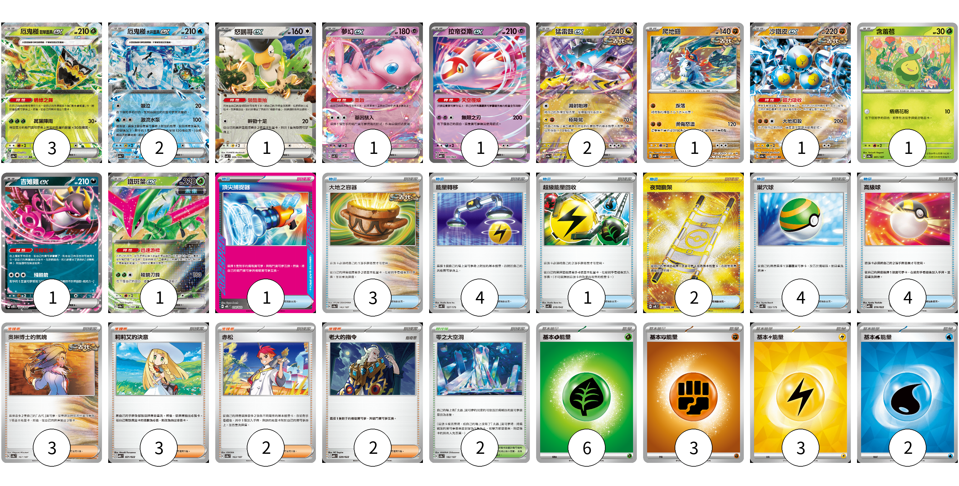 牌組構築方案 以此牌組為基礎新構築牌組 顯示卡面 顯示列表 寶可夢卡(15) 3 2 1 1 1 2 1 1 1 1 1 物品卡(19) 1 3 4 1 2 4 4 支援者卡(10) 3 3 2 2 競技場卡(2) 2 能量卡(14) 6 3 3 2 寶可夢卡(15) 卡牌名稱 張數 卡牌名稱 張數 厄鬼椪 碧草面具ex SV8a 020/187 03 厄鬼椪 水井面具ex SV8a 050/187 02 怒鸚哥ex SVK 006/042 01 夢幻ex SVK 001/042 01 拉帝亞斯ex MBD 003/022 01 猛雷鼓ex SV8a 124/187 02 爬地翅 SV4K 041/066 01 沙鐵皮ex SV8a 088/187 01 含羞苞 SV8a 001/187 01 吉雉雞ex SVOD 004/020 01 鐵斑葉ex SV8a 016/187 01 物品卡(19) 卡牌名稱 張數 卡牌名稱 張數 頂尖捕捉器 MBG 014/022 01 大地之容器 SV8a 143/187 03 能量轉移 SVM 127/175 04 超級能量回收 SVK 010/042 01 夜間擔架 SV8 137/106 02 巢穴球 SVM 133/175 04 高級球 MBD 014/022 04 支援者卡(10) 卡牌名稱 張數 卡牌名稱 張數 奧琳博士的氣魄 SV8a 167/187 03 莉莉艾的決意 MBD 021/022 03 赤松 SV8a 163/187 02 老大的指令 MBD 020/022 02 競技場卡(2) 卡牌名稱 張數 卡牌名稱 張數 零之大空洞 SV8a 182/187 02 能量卡(14) 卡牌名稱 張數 卡牌名稱 張數 基本【草】能量 M-P GRA 06 基本【鬥】能量 M-P FIG 03 基本【雷】能量 SVQP LIG 03 基本【水】能量 SVK WAT 02 以此牌組為基礎新構築牌組 牌組編碼 erCJhn-CWhXRd-XWuaNf copy 列印牌組單 牌組編碼已複製 分享至SNS