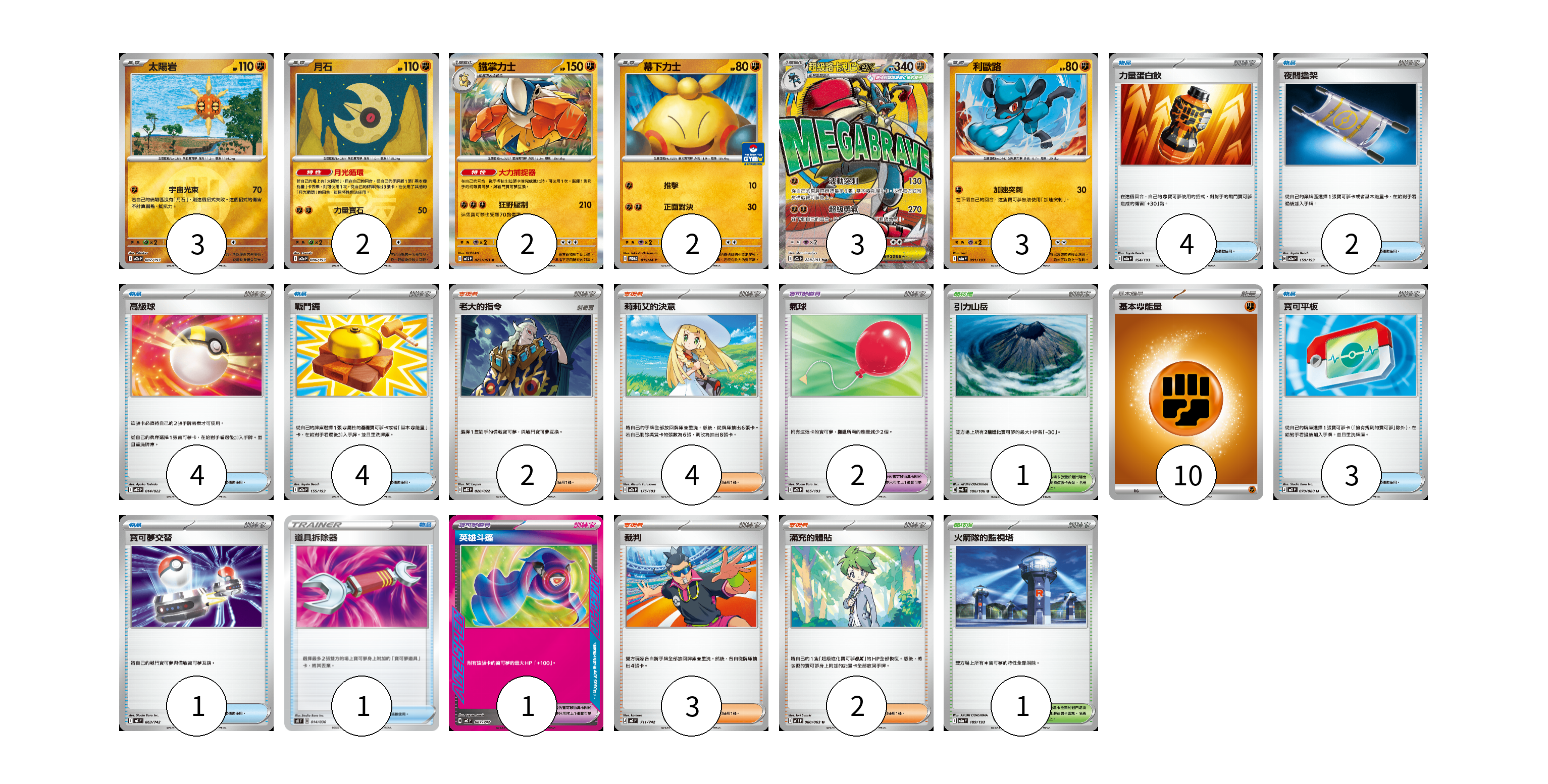 牌組構築方案 以此牌組為基礎新構築牌組 顯示卡面 顯示列表 寶可夢卡(15) 3 2 2 2 3 3 寶可夢道具(3) 2 1 物品卡(19) 4 2 4 4 3 1 1 支援者卡(11) 2 4 3 2 競技場卡(2) 1 1 能量卡(10) 10 寶可夢卡(15) 卡牌名稱 張數 卡牌名稱 張數 太陽岩 M2a 087/193 03 月石 M2a 086/193 02 鐵掌力士 M1L 025/063 02 幕下力士 M-P 015/M-P 02 超級路卡利歐ex M2a 228/193 03 利歐路 M2a 091/193 03 寶可夢道具(3) 卡牌名稱 張數 卡牌名稱 張數 氣球 M2a 165/193 02 英雄斗篷 MC 687/742 01 物品卡(19) 卡牌名稱 張數 卡牌名稱 張數 力量蛋白飲 M2a 154/193 04 夜間擔架 M2a 159/193 02 高級球 MBD 014/022 04 戰鬥鑼 M2a 155/193 04 寶可平板 M3 070/080 03 寶可夢交替 MC 663/742 01 道具拆除器 SK 014/030 01 支援者卡(11) 卡牌名稱 張數 卡牌名稱 張數 老大的指令 MBD 020/022 02 莉莉艾的決意 M2a 175/193 04 裁判 MC 711/742 03 滿充的體貼 M1S 060/063 02 競技場卡(2) 卡牌名稱 張數 卡牌名稱 張數 引力山岳 SV8 106/106 01 火箭隊的監視塔 M2a 189/193 01 能量卡(10) 卡牌名稱 張數 卡牌名稱 張數 基本【鬥】能量 M-P FIG 10 以此牌組為基礎新構築牌組 牌組編碼 erPKBl-wYPpgK-njEVde copy 列印牌組單 牌組編碼已複製 分享至SNS