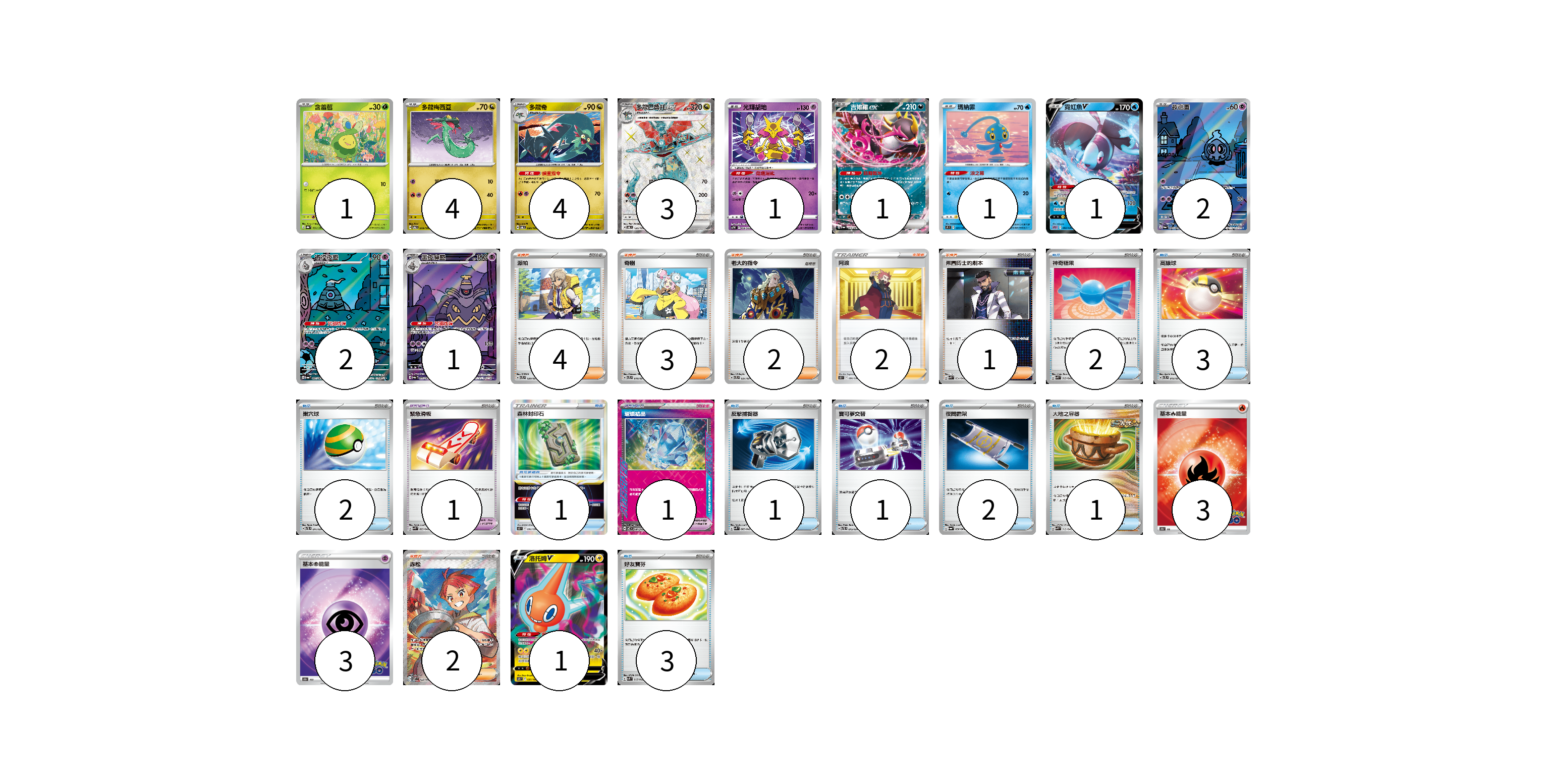 牌組構築方案 以此牌組為基礎新構築牌組 顯示卡面 顯示列表 寶可夢卡(22) 1 4 4 3 1 1 1 1 2 2 1 1 寶可夢道具(6) 3 1 1 1 物品卡(15) 2 3 2 1 1 2 1 3 支援者卡(11) 4 2 2 1 2 能量卡(6) 3 3 寶可夢卡(22) 卡牌名稱 張數 卡牌名稱 張數 含羞苞 SV8a 001/187 01 多龍梅西亞 SV6 079/101 04 多龍奇 SV6 080/101 04 多龍巴魯托ex SV6 120/101 03 光輝胡地 SVTM 006/022 01 吉雉雞ex SV6a 038/064 01 瑪納霏 S9 031/100 01 霓虹魚V SPD 002/020 01 夜巡靈 SV6a 068/064 02 彷徨夜靈 SV6a 069/064 02 黑夜魔靈 SV6a 070/064 01 洛托姆V S11 037/100 01 寶可夢道具(6) 卡牌名稱 張數 卡牌名稱 張數 奇樹 SVTL 018/021 03 緊急滑板 SVK 023/042 01 森林封印石 S12 092/098 01 璀璨結晶 SV7 094/102 01 物品卡(15) 卡牌名稱 張數 卡牌名稱 張數 神奇糖果 SVK 019/042 02 高級球 SVTL 012/021 03 巢穴球 SVTL 011/021 02 反擊捕捉器 SVK 009/042 01 寶可夢交替 SVTL 015/021 01 夜間擔架 SV6a 056/064 02 大地之容器 SVK 012/042 01 好友寶芬 SVK 015/042 03 支援者卡(11) 卡牌名稱 張數 卡牌名稱 張數 派帕 SVTL 020/021 04 老大的指令 SVTL 021/021 02 阿渡 S12 096/098 02 弗圖博士的劇本 SVK 034/042 01 赤松 SV7 123/102 02 能量卡(6) 卡牌名稱 張數 卡牌名稱 張數 基本火能量 S10b FIR 03 基本超能量 S10b PSY 03 以此牌組為基礎新構築牌組 牌組編碼 erSxjZ-pvJkVG-GuRANZ copy 列印牌組單 牌組編碼已複製 分享至SNS