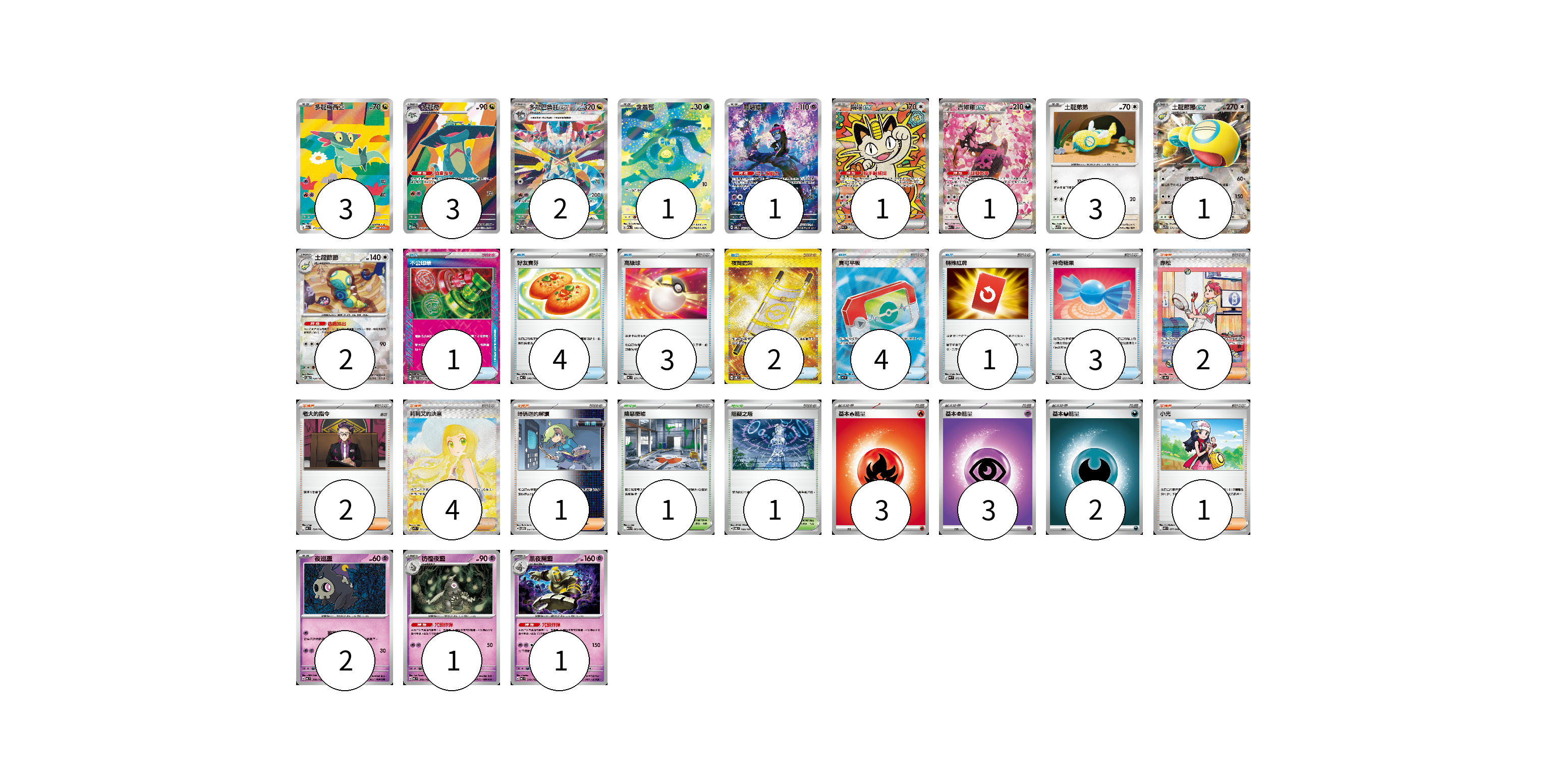 牌組構築方案 以此牌組為基礎新構築牌組 顯示卡面 顯示列表 寶可夢卡(22) 3 3 2 1 1 1 1 3 1 2 2 1 1 物品卡(18) 1 4 3 2 4 1 3 支援者卡(10) 2 2 4 1 1 競技場卡(2) 1 1 能量卡(8) 3 3 2 寶可夢卡(22) 卡牌名稱 張數 卡牌名稱 張數 多龍梅西亞 M2a 211/193 03 多龍奇 M2a 212/193 03 多龍巴魯托ex SV8a 221/187 02 含羞苞 M2a 196/193 01 願增猿 SV6 107/101 01 喵喵ex M3 114/080 01 吉雉雞ex M2a 244/193 01 土龍弟弟 SV9 078/100 03 土龍節節ex SV9 079/100 01 土龍節節 SV8a 130/187 02 夜巡靈 MC 308/742 02 彷徨夜靈 MC 309/742 01 黑夜魔靈 MC 310/742 01 物品卡(18) 卡牌名稱 張數 卡牌名稱 張數 不公印章 SV5a 053/066 01 好友寶芬 MC 648/742 04 高級球 MC 651/742 03 夜間擔架 SV8 137/106 02 寶可平板 M3 103/080 04 特殊紅牌 M4 072/083 01 神奇糖果 MC 655/742 03 支援者卡(10) 卡牌名稱 張數 卡牌名稱 張數 赤松 SV8a 227/187 02 老大的指令 MC 724/742 02 莉莉艾的決意 M1L 091/063 04 暗碼迷的解讀 SV5M 067/071 01 小光 M2 077/080 01 競技場卡(2) 卡牌名稱 張數 卡牌名稱 張數 險惡廢墟 M1L 063/063 01 阻礙之塔 SV6 100/101 01 能量卡(8) 卡牌名稱 張數 卡牌名稱 張數 基本【火】能量 MC FIR 03 基本【超】能量 MC PSY 03 基本【惡】能量 MC DAR 02 以此牌組為基礎新構築牌組 牌組編碼 erlmXI-czsnfV-YIeYSf copy 列印牌組單 牌組編碼已複製 分享至SNS