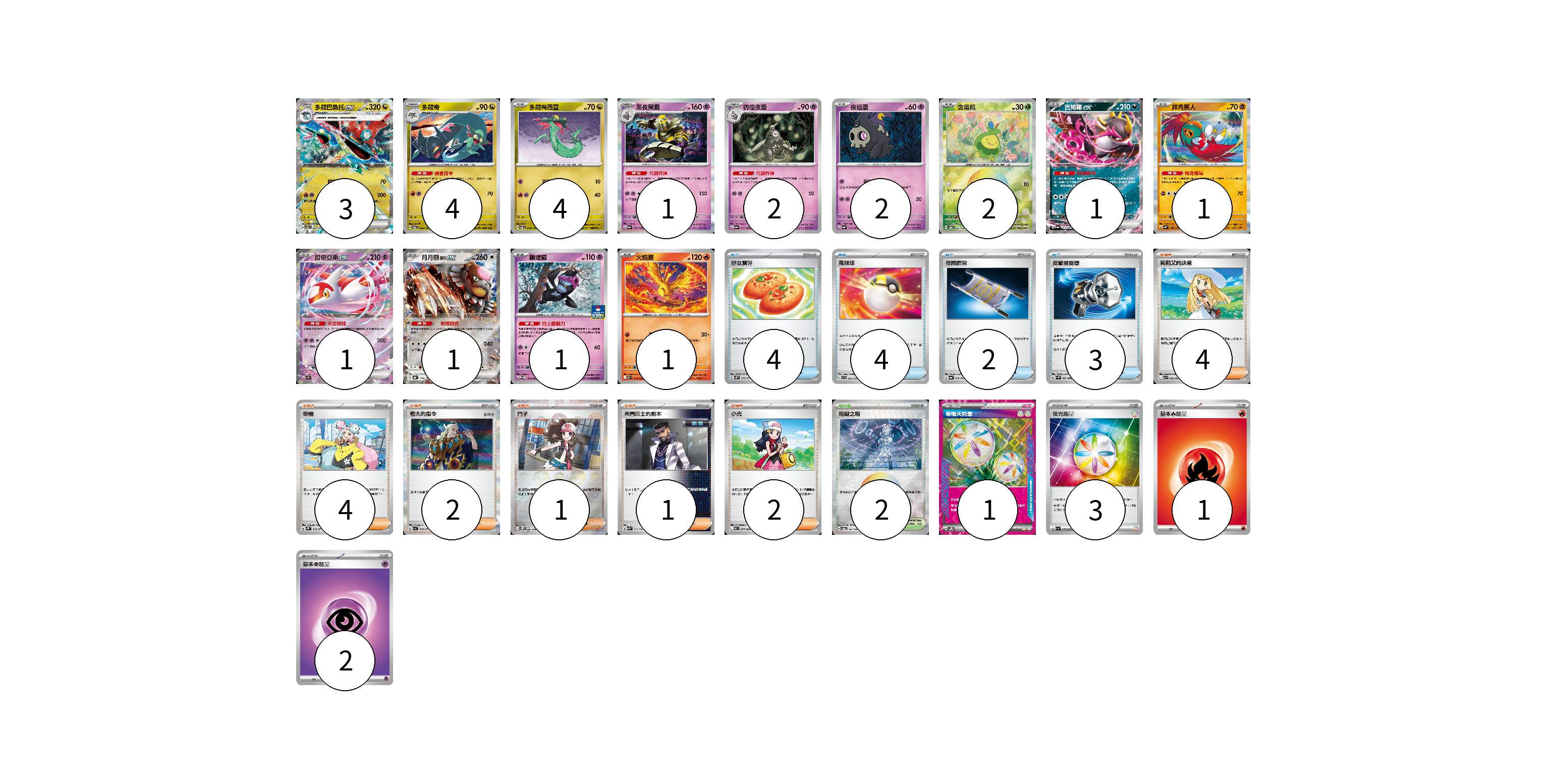 牌組構築方案 以此牌組為基礎新構築牌組 顯示卡面 顯示列表 寶可夢卡(24) 3 4 4 1 2 2 2 1 1 1 1 1 1 物品卡(13) 4 4 2 3 支援者卡(14) 4 4 2 1 1 2 競技場卡(2) 2 能量卡(7) 1 3 1 2 寶可夢卡(24) 卡牌名稱 張數 卡牌名稱 張數 多龍巴魯托ex SV6 081/101 03 多龍奇 SV6 080/101 04 多龍梅西亞 SV6 079/101 04 黑夜魔靈 SV6a 020/064 01 彷徨夜靈 SV6a 019/064 02 夜巡靈 SV6a 018/064 02 含羞苞 SV8a 001/187 02 吉雉雞ex SV6a 038/064 01 摔角鷹人 SV4a 106/190 01 拉帝亞斯ex SV7a 019/064 01 月月熊 赫月ex SV8a 134/187 01 願增猿 M-P 014/M-P 01 火焰鳥 M2 014/080 01 物品卡(13) 卡牌名稱 張數 卡牌名稱 張數 好友寶芬 SV5K 063/071 04 高級球 SVB 002/028 04 夜間擔架 SV6a 056/064 02 反擊捕捉器 SV4M 059/066 03 支援者卡(14) 卡牌名稱 張數 卡牌名稱 張數 莉莉艾的決意 M1L 062/063 04 奇樹 SV2D 069/071 04 老大的指令 SV1a 069/073 02 鬥子 SV11W 085/086 01 弗圖博士的劇本 SVK 034/042 01 小光 M2 077/080 02 競技場卡(2) 卡牌名稱 張數 卡牌名稱 張數 阻礙之塔 SV8a 181/187 02 能量卡(7) 卡牌名稱 張數 卡牌名稱 張數 新衝天能量 SV5K 071/071 01 夜光能量 SV1a 073/073 03 基本火能量 sv-p FIR 01 基本超能量 sv-p PSY 02 以此牌組為基礎新構築牌組 牌組編碼 esUayW-yTiXfQ-NTpnDK copy 列印牌組單 牌組編碼已複製 分享至SNS