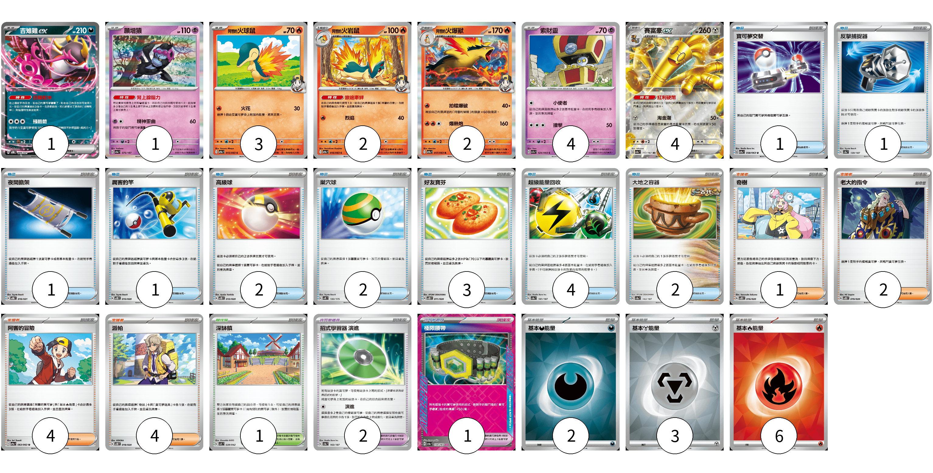 牌組構築方案 以此牌組為基礎新構築牌組 顯示卡面 顯示列表 寶可夢卡(17) 1 1 3 2 2 4 4 寶可夢道具(3) 2 1 物品卡(17) 1 1 1 1 2 2 3 4 2 支援者卡(11) 1 2 4 4 競技場卡(1) 1 能量卡(11) 2 3 6 寶可夢卡(17) 卡牌名稱 張數 卡牌名稱 張數 吉雉雞ex SVOM 009/021 01 願增猿 SV8a 075/187 01 <阿響的>火球鼠 SV9a 015/063 03 <阿響的>火岩鼠 SV9a 016/063 02 <阿響的>火爆獸 SV9a 017/063 02 索財靈 SV7a 024/064 04 賽富豪ex SV8a 117/187 04 寶可夢道具(3) 卡牌名稱 張數 卡牌名稱 張數 招式學習器 演進 SV8a 160/187 02 極限腰帶 SV8a 159/187 01 物品卡(17) 卡牌名稱 張數 卡牌名稱 張數 寶可夢交替 SV9a 058/063 01 反擊捕捉器 SV8a 139/187 01 夜間擔架 SVOM 016/021 01 厲害釣竿 SVOD 010/020 01 高級球 SVOD 012/020 02 巢穴球 SVM 133/175 02 好友寶芬 SVOD 011/020 03 超級能量回收 SV8a 141/187 04 大地之容器 SV8a 143/187 02 支援者卡(11) 卡牌名稱 張數 卡牌名稱 張數 奇樹 SVOD 016/020 01 老大的指令 SVOD 019/020 02 阿響的冒險 SV9a 063/063 04 派帕 SVOD 018/020 04 競技場卡(1) 卡牌名稱 張數 卡牌名稱 張數 深缽鎮 SVK 039/042 01 能量卡(11) 卡牌名稱 張數 卡牌名稱 張數 基本【惡】能量 SVOM DAR 02 基本【鋼】能量 SVOD MET 03 基本【火】能量 SVK FIR 06 以此牌組為基礎新構築牌組 牌組編碼 etdnkk-RQBIbq-qflPnZ copy 列印牌組單 牌組編碼已複製 分享至SNS