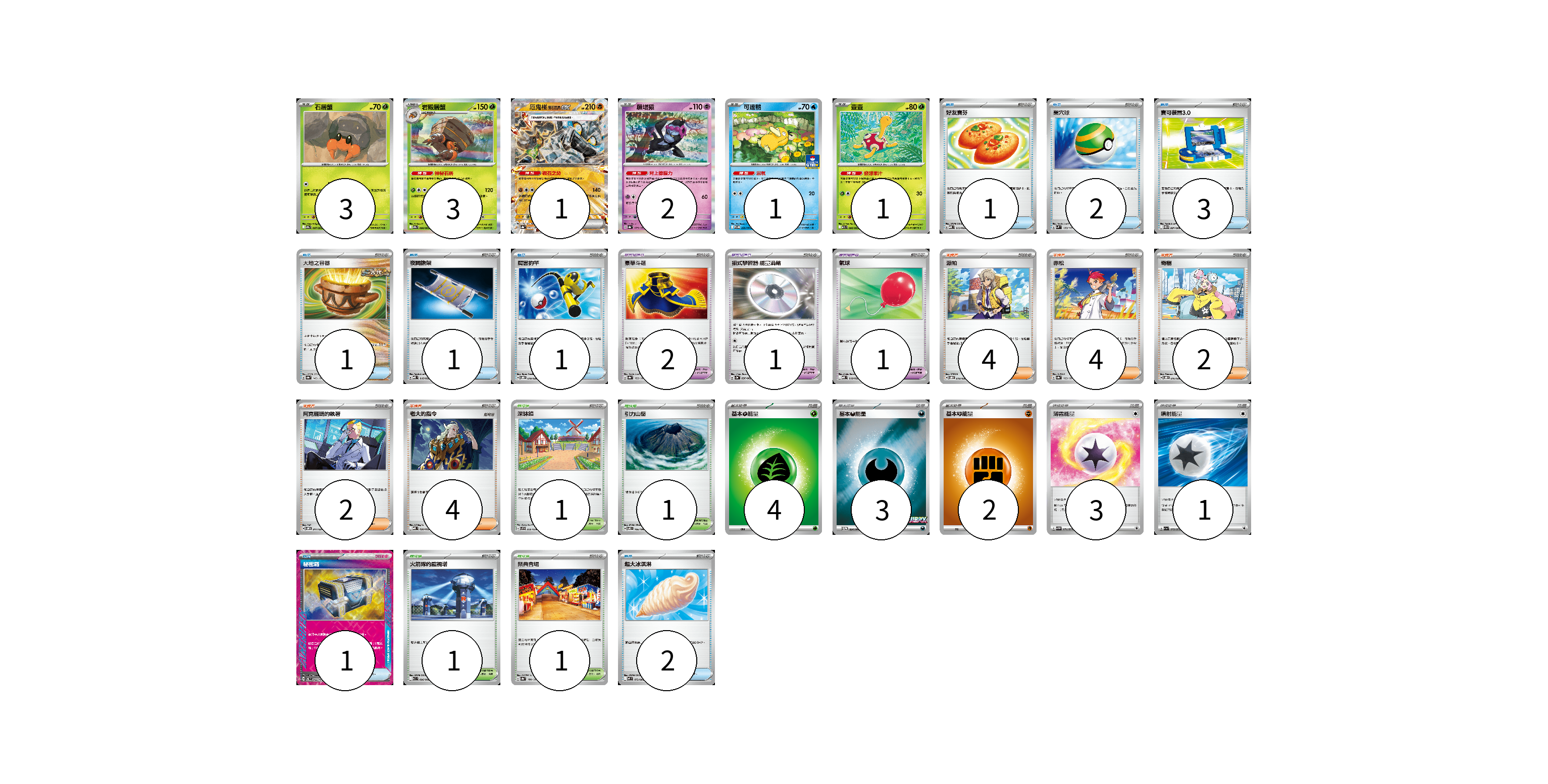 牌組構築方案 以此牌組為基礎新構築牌組 顯示卡面 顯示列表 寶可夢卡(11) 3 3 1 2 1 1 寶可夢道具(4) 2 1 1 物品卡(12) 1 2 3 1 1 1 1 2 支援者卡(16) 4 4 2 2 4 競技場卡(4) 1 1 1 1 能量卡(13) 4 3 2 3 1 寶可夢卡(11) 卡牌名稱 張數 卡牌名稱 張數 石居蟹 SV9a 007/063 03 岩殿居蟹 SV9a 008/063 03 厄鬼椪 礎石面具ex SV8a 091/187 01 願增猿 SV8a 075/187 02 可達鴨 SV-P 220/SV-P 01 壺壺 M1S 006/063 01 寶可夢道具(4) 卡牌名稱 張數 卡牌名稱 張數 豪華斗篷 SV8a 155/187 02 招式學習器 能量渦輪 SV3a 056/062 01 氣球 MBD 018/022 01 物品卡(12) 卡牌名稱 張數 卡牌名稱 張數 好友寶芬 MBD 013/022 01 巢穴球 SVM 133/175 02 寶可裝置3.0 SV11B 081/086 03 大地之容器 SV8a 143/187 01 夜間擔架 MBD 016/022 01 厲害釣竿 SVOD 010/020 01 秘密箱 SV6 092/101 01 超大冰淇淋 M2 073/080 02 支援者卡(16) 卡牌名稱 張數 卡牌名稱 張數 派帕 SVOD 018/020 04 赤松 SV8a 163/187 04 奇樹 SVOD 016/020 02 阿克羅瑪的執著 SVOM 017/021 02 老大的指令 MBD 020/022 04 競技場卡(4) 卡牌名稱 張數 卡牌名稱 張數 深缽鎮 SVF 036/038 01 引力山岳 SV8 106/106 01 火箭隊的監視塔 SV10 096/098 01 祭典會場 SV8a 180/187 01 能量卡(13) 卡牌名稱 張數 卡牌名稱 張數 基本【草】能量 M-P GRA 04 基本【惡】能量 M-P 034/M-P 03 基本【鬥】能量 M-P FIG 02 薄霧能量 SV5M 071/071 03 噴射能量 SV1a 072/073 01 以此牌組為基礎新構築牌組 牌組編碼 evVUjk-rpHuQa-mBjzGr copy 列印牌組單 牌組編碼已複製 分享至SNS