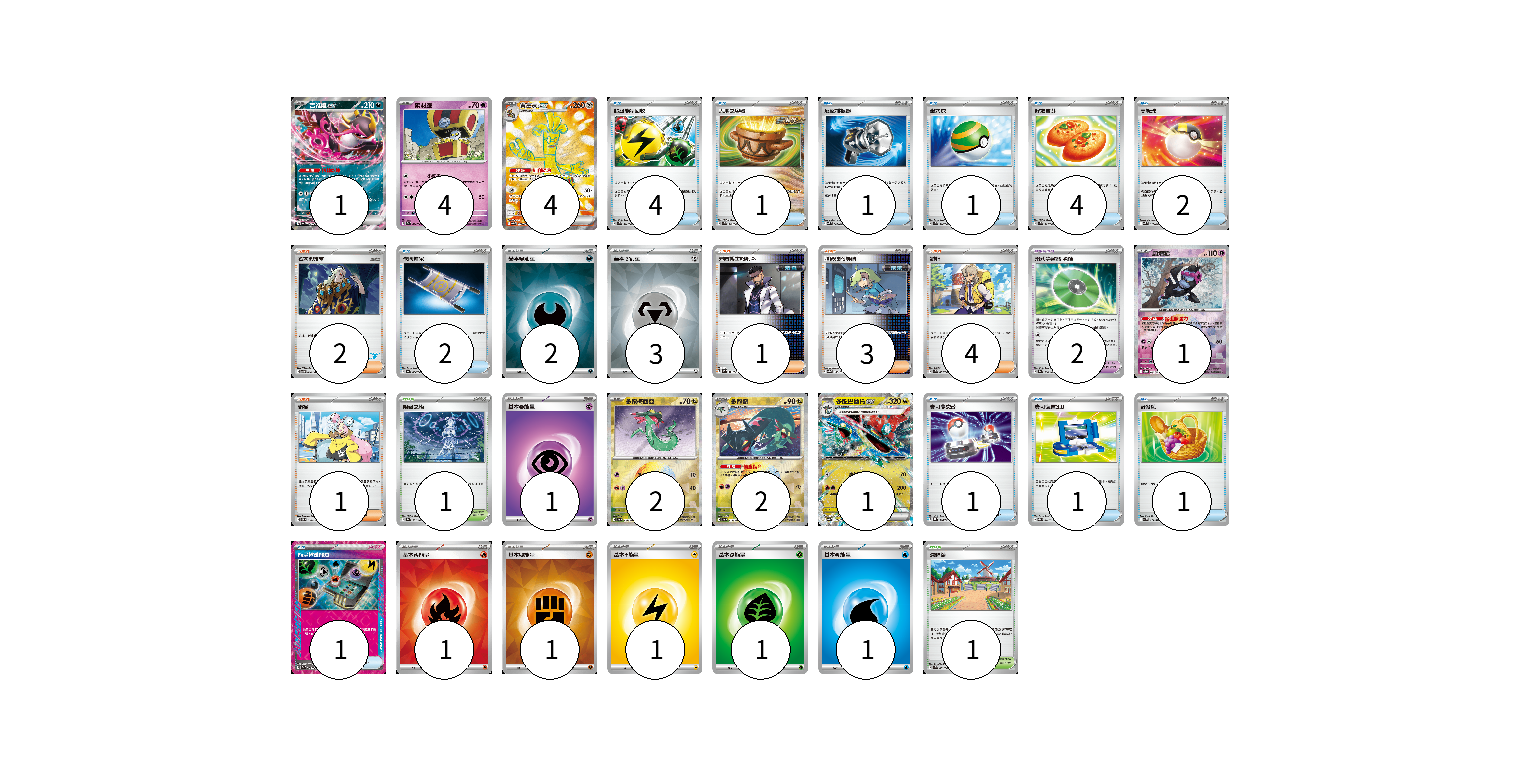 牌組構築方案 以此牌組為基礎新構築牌組 顯示卡面 顯示列表 寶可夢卡(15) 1 4 4 1 2 2 1 寶可夢道具(2) 2 物品卡(19) 4 1 1 1 4 2 2 1 1 1 1 支援者卡(11) 2 1 3 4 1 競技場卡(2) 1 1 能量卡(11) 2 3 1 1 1 1 1 1 寶可夢卡(15) 卡牌名稱 張數 卡牌名稱 張數 吉雉雞ex SV6a 038/064 01 索財靈 SV7a 024/064 04 賽富豪ex SV3a 079/062 04 願增猿 SV8a 075/187 01 多龍梅西亞 SV8a 118/187 02 多龍奇 SV8a 119/187 02 多龍巴魯托ex SV8a 120/187 01 寶可夢道具(2) 卡牌名稱 張數 卡牌名稱 張數 招式學習器 演進 SV8a 160/187 02 物品卡(19) 卡牌名稱 張數 卡牌名稱 張數 超級能量回收 SVK 010/042 04 大地之容器 SVK 012/042 01 反擊捕捉器 SVK 009/042 01 巢穴球 SVK 016/042 01 好友寶芬 SVK 015/042 04 高級球 SVK 018/042 02 夜間擔架 SV6a 056/064 02 寶可夢交替 SVHK 014/022 01 寶可裝置3.0 SVEM 014/020 01 野餐籃 SV1V 071/078 01 能量輸送PRO SV7a 052/064 01 支援者卡(11) 卡牌名稱 張數 卡牌名稱 張數 老大的指令 SVI 066/066 02 弗圖博士的劇本 SVHM 021/022 01 暗碼迷的解讀 SV8a 165/187 03 派帕 SVK 035/042 04 奇樹 SVOM 018/021 01 競技場卡(2) 卡牌名稱 張數 卡牌名稱 張數 阻礙之塔 SV8a 181/187 01 深缽鎮 SVK 039/042 01 能量卡(11) 卡牌名稱 張數 卡牌名稱 張數 基本【惡】能量 SVK DAR 02 基本【鋼】能量 SVK MET 03 基本【超】能量 SVEM PSY 01 基本【火】能量 SVK FIR 01 基本【鬥】能量 SVK FIG 01 基本【雷】能量 SVF LIG 01 基本【草】能量 SVF GRA 01 基本【水】能量 SVF WAT 01 以此牌組為基礎新構築牌組 牌組編碼 ewbWpD-dvFuUi-egOxGB copy 列印牌組單 牌組編碼已複製 分享至SNS