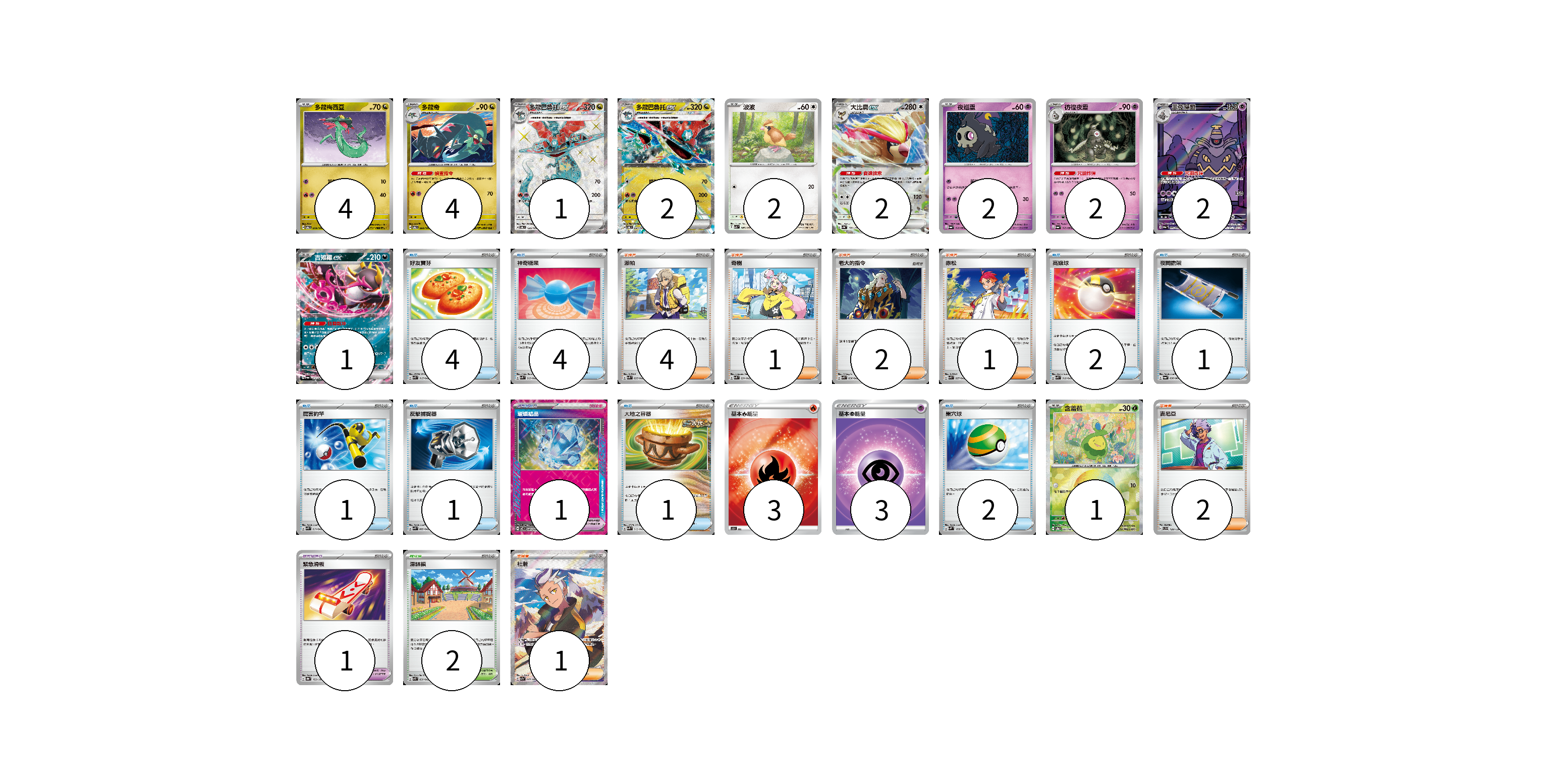 牌組構築方案 以此牌組為基礎新構築牌組 顯示卡面 顯示列表 寶可夢卡(23) 4 4 1 2 2 2 2 2 2 1 1 寶可夢道具(2) 1 1 物品卡(16) 4 4 2 1 1 1 1 2 支援者卡(11) 4 1 2 1 2 1 競技場卡(2) 2 能量卡(6) 3 3 寶可夢卡(23) 卡牌名稱 張數 卡牌名稱 張數 多龍梅西亞 SV6 079/101 04 多龍奇 SV6 080/101 04 多龍巴魯托ex SV6 120/101 01 多龍巴魯托ex SV6 081/101 02 波波 SV3 087/108 02 大比鳥ex SV4a 139/190 02 夜巡靈 SV6a 018/064 02 彷徨夜靈 SV6a 019/064 02 黑夜魔靈 SV6a 070/064 02 吉雉雞ex SV6a 038/064 01 含羞苞 SV8a 001/187 01 寶可夢道具(2) 卡牌名稱 張數 卡牌名稱 張數 璀璨結晶 SV7 094/102 01 緊急滑板 SV8a 153/187 01 物品卡(16) 卡牌名稱 張數 卡牌名稱 張數 好友寶芬 SVK 015/042 04 神奇糖果 SVK 019/042 04 高級球 SVK 018/042 02 夜間擔架 SV6a 056/064 01 厲害釣竿 SVK 011/042 01 反擊捕捉器 SVK 009/042 01 大地之容器 SVK 012/042 01 巢穴球 SVM 133/175 02 支援者卡(11) 卡牌名稱 張數 卡牌名稱 張數 派帕 SVK 035/042 04 奇樹 SVK 031/042 01 老大的指令 SVK 036/042 02 赤松 SVK 027/042 01 吉尼亞 SVD 129/139 02 杜若 SV7a 083/064 01 競技場卡(2) 卡牌名稱 張數 卡牌名稱 張數 深缽鎮 SVK 039/042 02 能量卡(6) 卡牌名稱 張數 卡牌名稱 張數 基本【火】能量 SO FIR 03 基本【超】能量 SI PSY 03 以此牌組為基礎新構築牌組 牌組編碼 ezjCIm-RmqkiJ-IAcvws copy 列印牌組單 牌組編碼已複製 分享至SNS