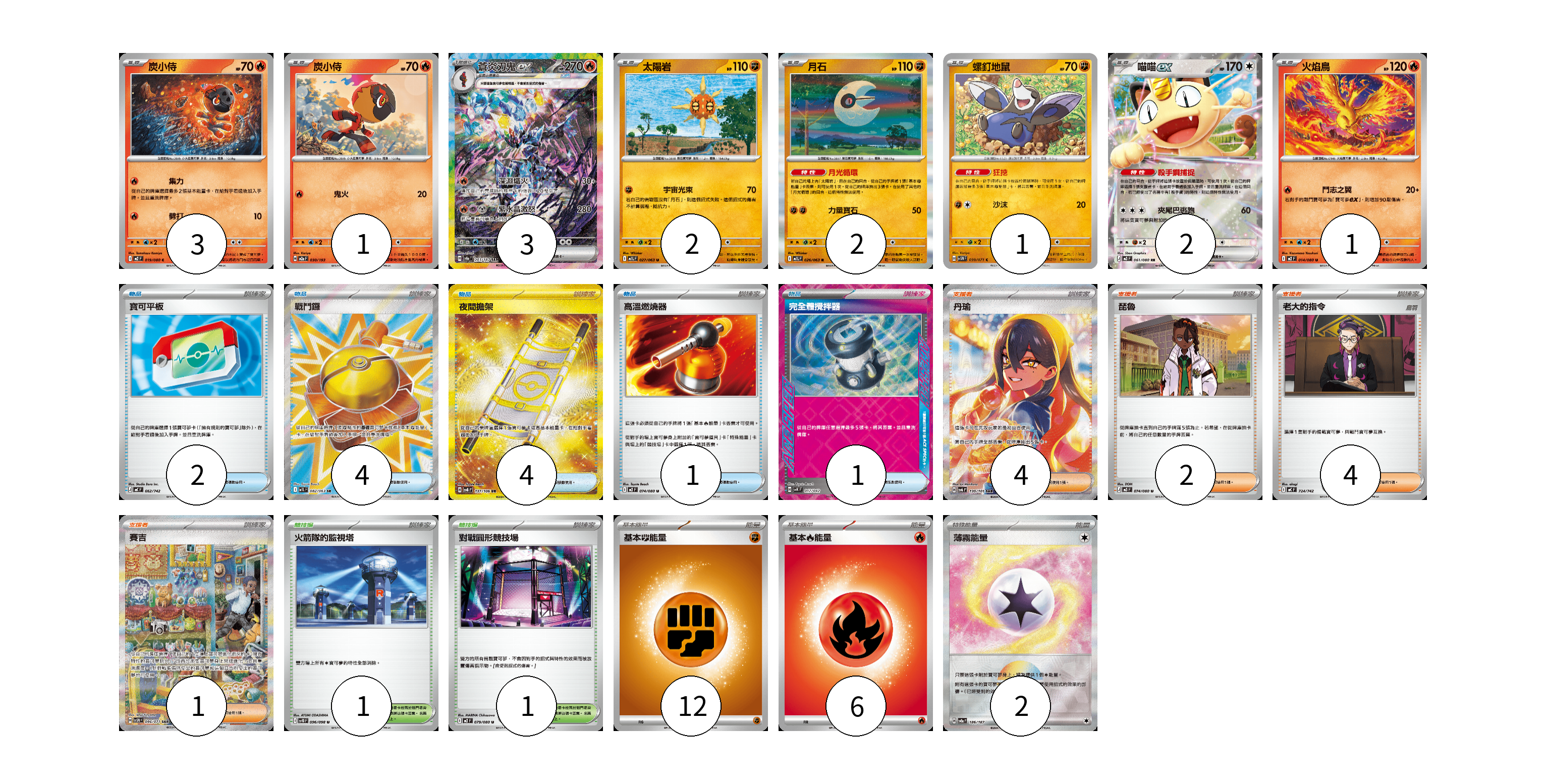 牌組構築方案 以此牌組為基礎新構築牌組 顯示卡面 顯示列表 寶可夢卡(15) 3 1 3 2 2 1 2 1 物品卡(12) 2 4 4 1 1 支援者卡(11) 4 2 4 1 競技場卡(2) 1 1 能量卡(20) 12 6 2 寶可夢卡(15) 卡牌名稱 張數 卡牌名稱 張數 炭小侍 M2 019/080 03 炭小侍 M2a 030/193 01 蒼炎刃鬼ex SV8a 203/187 03 太陽岩 M1L 027/063 02 月石 M1L 026/063 02 螺釘地鼠 SV5M 039/071 01 喵喵ex M3 061/080 02 火焰鳥 M2 014/080 01 物品卡(12) 卡牌名稱 張數 卡牌名稱 張數 寶可平板 MC 662/742 02 戰鬥鑼 M1L 082/063 04 夜間擔架 SV8 137/106 04 高溫燃燒器 M2 074/080 01 完全體攪拌器 SVK 017/042 01 支援者卡(11) 卡牌名稱 張數 卡牌名稱 張數 丹瑜 SV6 130/101 04 琵魯 M3 074/080 02 老大的指令 MC 724/742 04 賽吉 SV5M 096/071 01 競技場卡(2) 卡牌名稱 張數 卡牌名稱 張數 火箭隊的監視塔 SV10 096/098 01 對戰圓形競技場 M2 079/080 01 能量卡(20) 卡牌名稱 張數 卡牌名稱 張數 基本【鬥】能量 MC FIG 12 基本【火】能量 MC FIR 06 薄霧能量 SV8a 186/187 02 以此牌組為基礎新構築牌組 牌組編碼 fATBUr-wrlMoH-IXWpoR copy 列印牌組單 牌組編碼已複製 分享至SNS