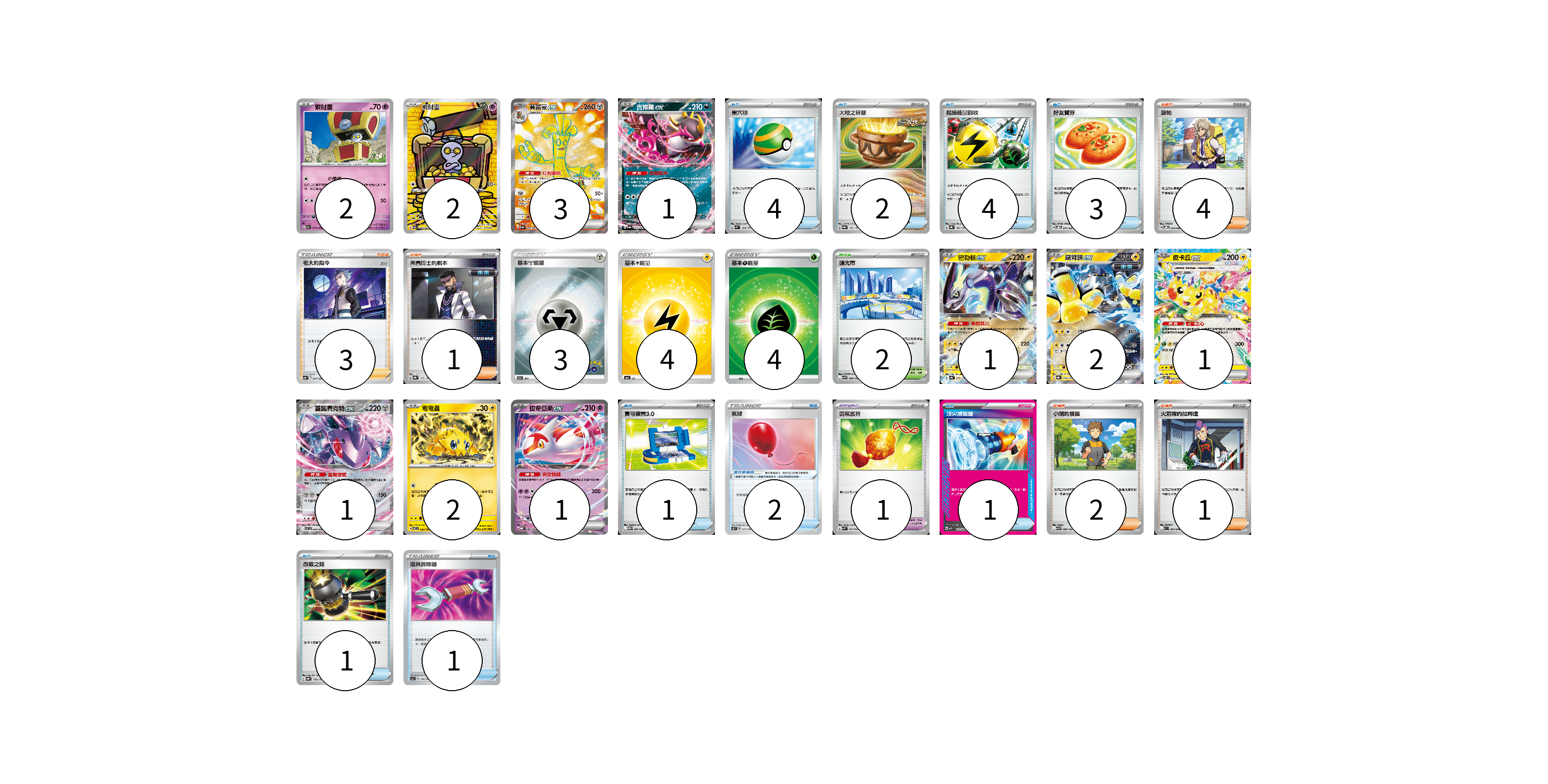牌組構築方案 以此牌組為基礎新構築牌組 顯示卡面 顯示列表 寶可夢卡(16) 2 2 3 1 1 2 1 1 2 1 寶可夢道具(3) 2 1 物品卡(17) 4 2 4 3 1 1 1 1 支援者卡(11) 4 3 1 2 1 競技場卡(2) 2 能量卡(11) 3 4 4 寶可夢卡(16) 卡牌名稱 張數 卡牌名稱 張數 索財靈 SV7a 024/064 02 索財靈 SV3a 068/062 02 賽富豪ex SV3a 079/062 03 吉雉雞ex SV6a 038/064 01 密勒頓ex SV4a 071/190 01 鐵臂膀ex SV8a 054/187 02 皮卡丘ex SV8 033/106 01 蓋諾賽克特ex SV11B 069/086 01 電電蟲 SV7 032/102 02 拉帝亞斯ex MBD 003/022 01 寶可夢道具(3) 卡牌名稱 張數 卡牌名稱 張數 氣球 SK 021/030 02 勇氣護符 SVK 024/042 01 物品卡(17) 卡牌名稱 張數 卡牌名稱 張數 巢穴球 SVM 133/175 04 大地之容器 SV8a 143/187 02 超級能量回收 SV8a 141/187 04 好友寶芬 SVOD 011/020 03 寶可裝置3.0 SV11B 081/086 01 頂尖捕捉器 MBG 014/022 01 改造之錘 SV8a 138/187 01 道具拆除器 SC1a 138/154 01 支援者卡(11) 卡牌名稱 張數 卡牌名稱 張數 派帕 SVOD 018/020 04 老大的指令(赤日) SVB 024/028 03 弗圖博士的劇本 SV8a 175/187 01 小剛的發掘 SV9 096/100 02 火箭隊的拉姆達 SV10 094/098 01 競技場卡(2) 卡牌名稱 張數 卡牌名稱 張數 釀光市 SV9 098/100 02 能量卡(11) 卡牌名稱 張數 卡牌名稱 張數 基本鋼能量 S10b MET 03 基本雷能量 SN LIG 04 基本【草】能量 SI GRA 04 以此牌組為基礎新構築牌組 牌組編碼 fBNveg-bOKaIn-hAHUnI copy 列印牌組單 牌組編碼已複製 分享至SNS
