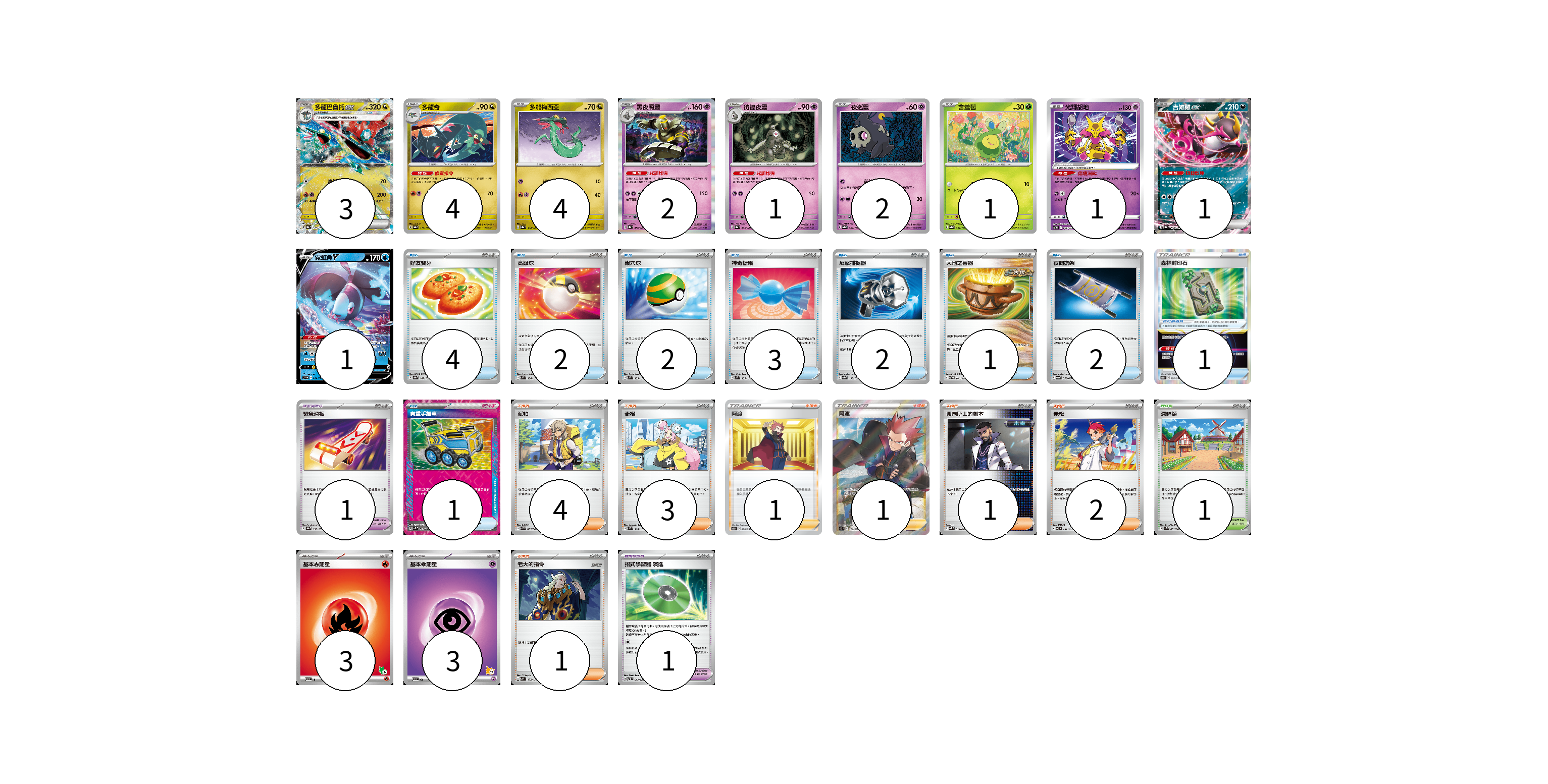 牌組構築方案 以此牌組為基礎新構築牌組 顯示卡面 顯示列表 寶可夢卡(20) 3 4 4 2 1 2 1 1 1 1 寶可夢道具(3) 1 1 1 物品卡(17) 4 2 2 3 2 1 2 1 支援者卡(13) 4 3 1 1 1 2 1 競技場卡(1) 1 能量卡(6) 3 3 寶可夢卡(20) 卡牌名稱 張數 卡牌名稱 張數 多龍巴魯托ex SV8a 120/187 03 多龍奇 SV8a 119/187 04 多龍梅西亞 SV8a 118/187 04 黑夜魔靈 SV8a 066/187 02 彷徨夜靈 SV8a 065/187 01 夜巡靈 SV8a 064/187 02 含羞苞 SV8a 001/187 01 光輝胡地 SVTM 006/022 01 吉雉雞ex SV8a 104/187 01 霓虹魚V SVHK 004/022 01 寶可夢道具(3) 卡牌名稱 張數 卡牌名稱 張數 森林封印石 S12 092/098 01 緊急滑板 SV8a 153/187 01 招式學習器 演進 SVTL 017/021 01 物品卡(17) 卡牌名稱 張數 卡牌名稱 張數 好友寶芬 SV8a 147/187 04 高級球 SVM 134/175 02 巢穴球 SVM 133/175 02 神奇糖果 SVM 135/175 03 反擊捕捉器 SV8a 139/187 02 大地之容器 SVTG 010/019 01 夜間擔架 SV6a 056/064 02 貴重手推車 SVK 020/042 01 支援者卡(13) 卡牌名稱 張數 卡牌名稱 張數 派帕 SVK 035/042 04 奇樹 SVM 160/175 03 阿渡 S12 096/098 01 阿渡 S12 114/098 01 弗圖博士的劇本 SVK 034/042 01 赤松 SV7 097/102 02 老大的指令 SVM 172/175 01 競技場卡(1) 卡牌名稱 張數 卡牌名稱 張數 深缽鎮 SVK 039/042 01 能量卡(6) 卡牌名稱 張數 卡牌名稱 張數 基本【火】能量 SVI FIR 03 基本【超】能量 SVI PSY 03 以此牌組為基礎新構築牌組 牌組編碼 fBcBPs-DWGudI-kQLBcL copy 列印牌組單 牌組編碼已複製 分享至SNS