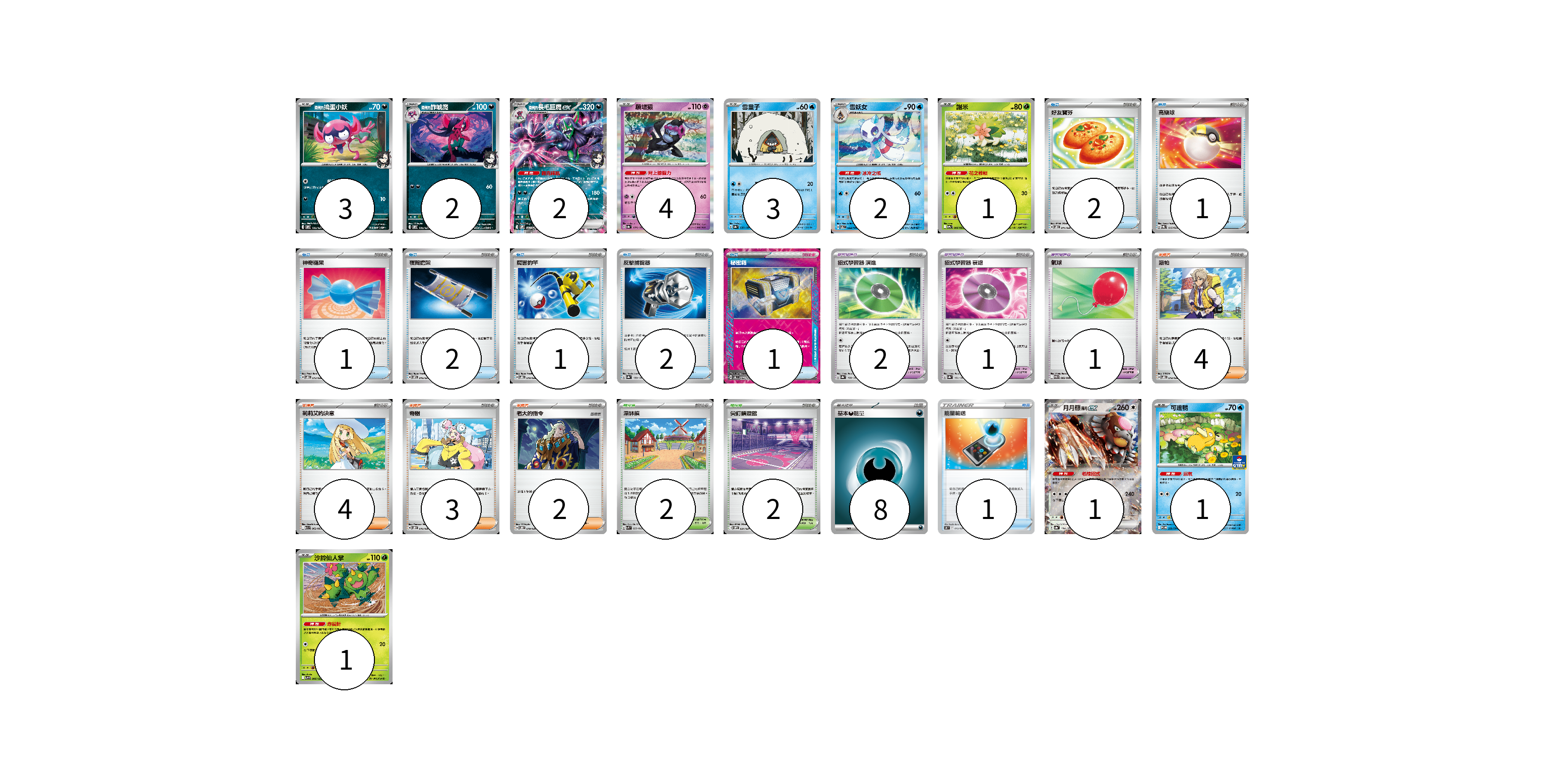 牌組構築方案 以此牌組為基礎新構築牌組 顯示卡面 顯示列表 寶可夢卡(20) 3 2 2 4 3 2 1 1 1 1 寶可夢道具(4) 2 1 1 物品卡(11) 2 1 1 2 1 2 1 1 支援者卡(13) 4 4 3 2 競技場卡(4) 2 2 能量卡(8) 8 寶可夢卡(20) 卡牌名稱 張數 卡牌名稱 張數 <瑪俐的>搗蛋小妖 SVOM 005/021 03 <瑪俐的>詐唬魔 SVOM 006/021 02 <瑪俐的>長毛巨魔ex SVOM 007/021 02 願增猿 SV8a 075/187 04 雪童子 SV8a 037/187 03 雪妖女 SV6 033/101 02 謝米 SV9a 006/063 01 月月熊 赫月ex SV8a 134/187 01 可達鴨 SV-P 220/SV-P 01 沙鈴仙人掌 SV9 006/100 01 寶可夢道具(4) 卡牌名稱 張數 卡牌名稱 張數 招式學習器 演進 SV8a 160/187 02 招式學習器 衰退 SV8a 161/187 01 氣球 SV11B 082/086 01 物品卡(11) 卡牌名稱 張數 卡牌名稱 張數 好友寶芬 SVOD 011/020 02 高級球 SVQL 015/022 01 神奇糖果 SVOD 013/020 01 夜間擔架 SVOM 016/021 02 厲害釣竿 SVOD 010/020 01 反擊捕捉器 SV8a 139/187 02 秘密箱 SV6 092/101 01 能量輸送 SN 013/024 01 支援者卡(13) 卡牌名稱 張數 卡牌名稱 張數 派帕 SVOD 018/020 04 莉莉艾的決意 M1L 062/063 04 奇樹 SVOD 016/020 03 老大的指令 SVOD 019/020 02 競技場卡(4) 卡牌名稱 張數 卡牌名稱 張數 深缽鎮 SVK 039/042 02 尖釘鎮道館 SVOM 021/021 02 能量卡(8) 卡牌名稱 張數 卡牌名稱 張數 基本惡能量 sv-p DAR 08 以此牌組為基礎新構築牌組 牌組編碼 fCkhjn-fmWVHT-iFgDtF copy 列印牌組單 牌組編碼已複製 分享至SNS