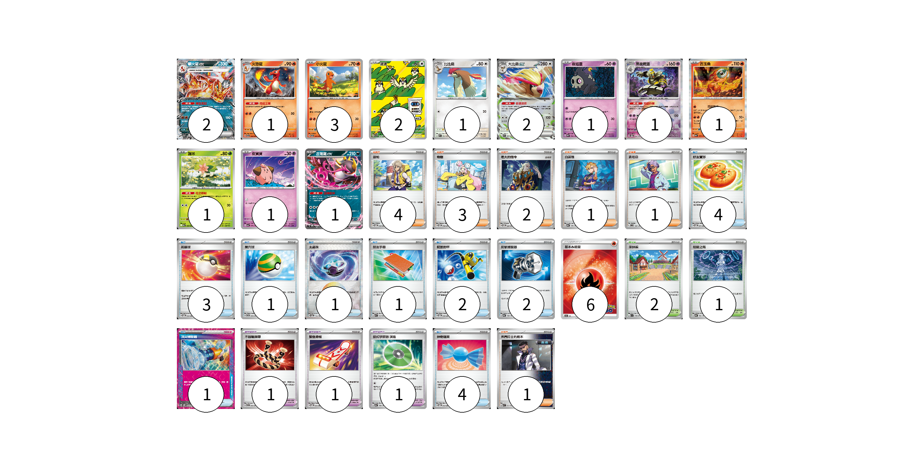 牌組構築方案 以此牌組為基礎新構築牌組 顯示卡面 顯示列表 寶可夢卡(17) 2 1 3 2 1 2 1 1 1 1 1 1 寶可夢道具(3) 1 1 1 物品卡(19) 4 3 1 1 1 2 2 1 4 支援者卡(12) 4 3 2 1 1 1 競技場卡(3) 2 1 能量卡(6) 6 寶可夢卡(17) 卡牌名稱 張數 卡牌名稱 張數 噴火龍ex SVTL 006/021 02 火恐龍 SVTL 002/021 01 小火龍 SVTL 001/021 03 波波 SV3 118/108 02 比比鳥 SVK 004/042 01 大比鳥ex SVK 005/042 02 夜巡靈 SV8a 064/187 01 黑夜魔靈 SV8a 066/187 01 古玉魚 SV8a 025/187 01 謝米 SV9a 006/063 01 皮寶寶 SV4a 077/190 01 吉雉雞ex SVOD 004/020 01 寶可夢道具(3) 卡牌名稱 張數 卡牌名稱 張數 不服輸頭帶 SVTL 016/021 01 緊急滑板 SVOD 015/020 01 招式學習器 演進 SV8a 160/187 01 物品卡(19) 卡牌名稱 張數 卡牌名稱 張數 好友寶芬 SVOD 011/020 04 高級球 SVOD 012/020 03 巢穴球 SVTH 010/018 01 太晶珠 SV8a 145/187 01 朋友手冊 SVK 014/042 01 厲害釣竿 SVOD 010/020 02 反擊捕捉器 SV8a 139/187 02 頂尖捕捉器 SV5M 062/071 01 神奇糖果 SVOD 013/020 04 支援者卡(12) 卡牌名稱 張數 卡牌名稱 張數 派帕 SVOD 018/020 04 奇樹 SVOM 018/021 03 老大的指令 SVOM 020/021 02 白蕾雅 SV8a 176/187 01 吉尼亞 SVD 129/139 01 弗圖博士的劇本 SVK 034/042 01 競技場卡(3) 卡牌名稱 張數 卡牌名稱 張數 深缽鎮 SV1a 070/073 02 阻礙之塔 SV8a 181/187 01 能量卡(6) 卡牌名稱 張數 卡牌名稱 張數 基本火能量 S10b FIR 06 以此牌組為基礎新構築牌組 牌組編碼 fCygtq-TzXQUL-AcBKeD copy 列印牌組單 牌組編碼已複製 分享至SNS