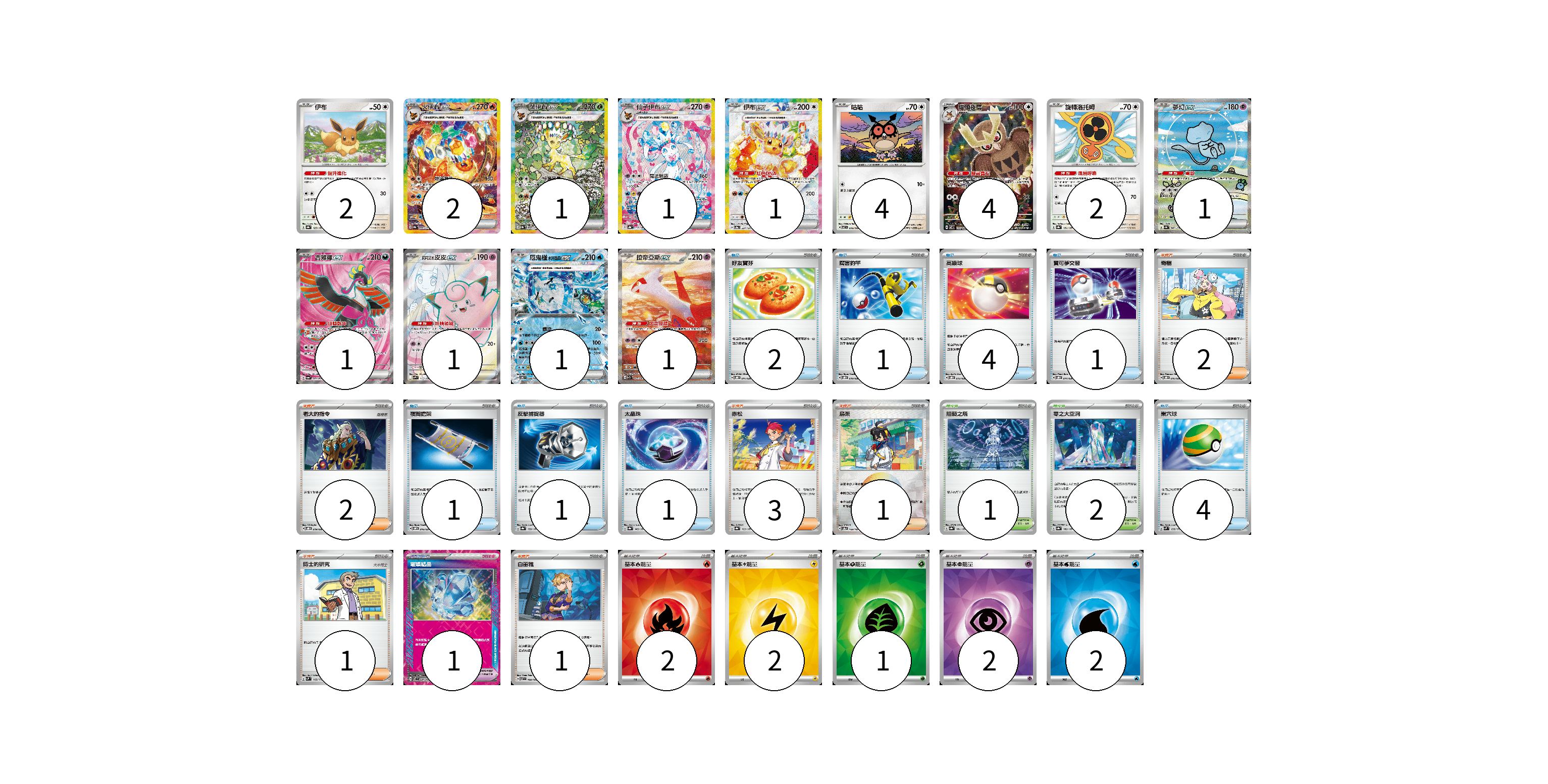 牌組構築方案 以此牌組為基礎新構築牌組 顯示卡面 顯示列表 寶可夢卡(22) 2 2 1 1 1 4 4 2 1 1 1 1 1 寶可夢道具(1) 1 物品卡(15) 2 1 4 1 1 1 1 4 支援者卡(10) 2 2 3 1 1 1 競技場卡(3) 1 2 能量卡(9) 2 2 1 2 2 寶可夢卡(22) 卡牌名稱 張數 卡牌名稱 張數 伊布 SV8a 125/187 02 火伊布ex SV8a 202/187 02 葉伊布ex SV8a 200/187 01 仙子伊布ex SV8a 212/187 01 伊布ex SV8a 224/187 01 咕咕 SV7 076/102 04 貓頭夜鷹 SV7 114/102 04 旋轉洛托姆 SV8a 131/187 02 夢幻ex SV4a 347/190 01 吉雉雞ex SV6a 081/064 01 莉莉艾的皮皮ex SV9 115/100 01 厄鬼椪 水井面具ex SV6 038/101 01 拉帝亞斯ex SV7a 087/064 01 寶可夢道具(1) 卡牌名稱 張數 卡牌名稱 張數 璀璨結晶 SV7 094/102 01 物品卡(15) 卡牌名稱 張數 卡牌名稱 張數 好友寶芬 SVOD 011/020 02 厲害釣竿 SVOD 010/020 01 高級球 SVOD 012/020 04 寶可夢交替 SVOD 014/020 01 夜間擔架 SVOM 016/021 01 反擊捕捉器 SV8a 139/187 01 太晶珠 SV8a 145/187 01 巢穴球 SVM 133/175 04 支援者卡(10) 卡牌名稱 張數 卡牌名稱 張數 奇樹 SVOD 016/020 02 老大的指令 SVOD 019/020 02 赤松 SV8a 163/187 03 烏栗 SV8a 169/187 01 博士的研究 SVM 162/175 01 白蕾雅 SV7 100/102 01 競技場卡(3) 卡牌名稱 張數 卡牌名稱 張數 阻礙之塔 SV8a 181/187 01 零之大空洞 SV8a 182/187 02 能量卡(9) 卡牌名稱 張數 卡牌名稱 張數 基本【火】能量 SVM FIR 02 基本【雷】能量 SVM LIG 02 基本【草】能量 SVM GRA 01 基本【超】能量 SVM PSY 02 基本【水】能量 SVM WAT 02 以此牌組為基礎新構築牌組 牌組編碼 fEEhpI-UGXzBR-NQvkPZ copy 列印牌組單 牌組編碼已複製 分享至SNS