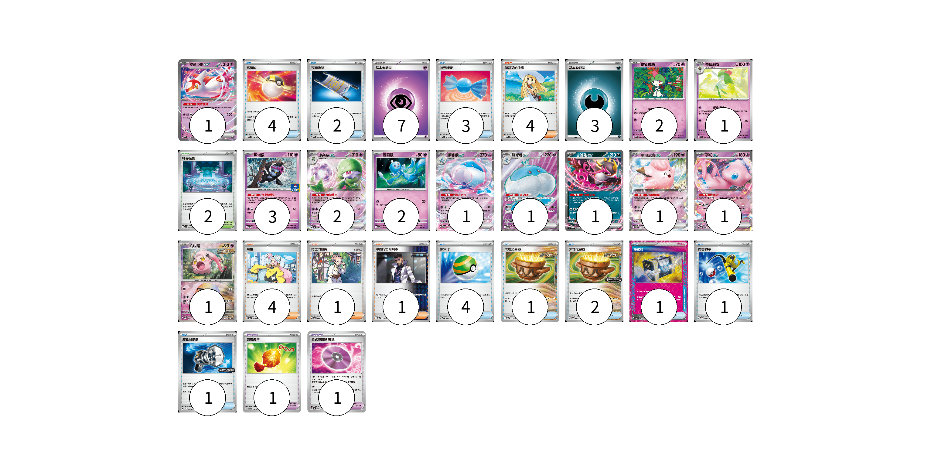 牌組構築方案 以此牌組為基礎新構築牌組 顯示卡面 顯示列表 寶可夢卡(17) 1 2 1 3 2 2 1 1 1 1 1 1 寶可夢道具(2) 1 1 物品卡(19) 4 2 3 4 1 2 1 1 1 支援者卡(10) 4 4 1 1 競技場卡(2) 2 能量卡(10) 7 3 寶可夢卡(17) 卡牌名稱 張數 卡牌名稱 張數 拉帝亞斯ex MBD 003/022 01 拉魯拉絲 M1S 040/063 02 奇魯莉安 M1S 041/063 01 願增猿 M-P 014/M-P 03 沙奈朵ex SV4a 082/190 02 輕飄飄 SV11W 041/086 02 胖嘟嘟ex SV11W 042/086 01 胖嘟嘟ex SV11W 162/086 01 吉雉雞ex SVOM 009/021 01 莉莉艾的皮皮ex SV9 033/100 01 夢幻ex SVK 001/042 01 吼叫尾 SV8a 071/187 01 寶可夢道具(2) 卡牌名稱 張數 卡牌名稱 張數 勇氣護符 SVTR 015/021 01 招式學習器 衰退 SV4K 063/066 01 物品卡(19) 卡牌名稱 張數 卡牌名稱 張數 高級球 MBD 014/022 04 夜間擔架 MBD 016/022 02 神奇糖果 MBG 013/022 03 巢穴球 SVM 133/175 04 大地之容器 SV8a 143/187 01 大地之容器 SV-P 137/SV-P 02 秘密箱 SV6 092/101 01 厲害釣竿 SVOD 010/020 01 反擊捕捉器 SV-P 136/SV-P 01 支援者卡(10) 卡牌名稱 張數 卡牌名稱 張數 莉莉艾的決意 MBG 022/022 04 奇樹 SVOD 016/020 04 博士的研究 SVOM 019/021 01 弗圖博士的劇本 SV8a 175/187 01 競技場卡(2) 卡牌名稱 張數 卡牌名稱 張數 神秘花園 M1S 063/063 02 能量卡(10) 卡牌名稱 張數 卡牌名稱 張數 基本【超】能量 MBD PSY 07 基本【惡】能量 MBG DAR 03 以此牌組為基礎新構築牌組 牌組編碼 fEpRRB-YmuVxS-xPotJR copy 列印牌組單 牌組編碼已複製 分享至SNS
