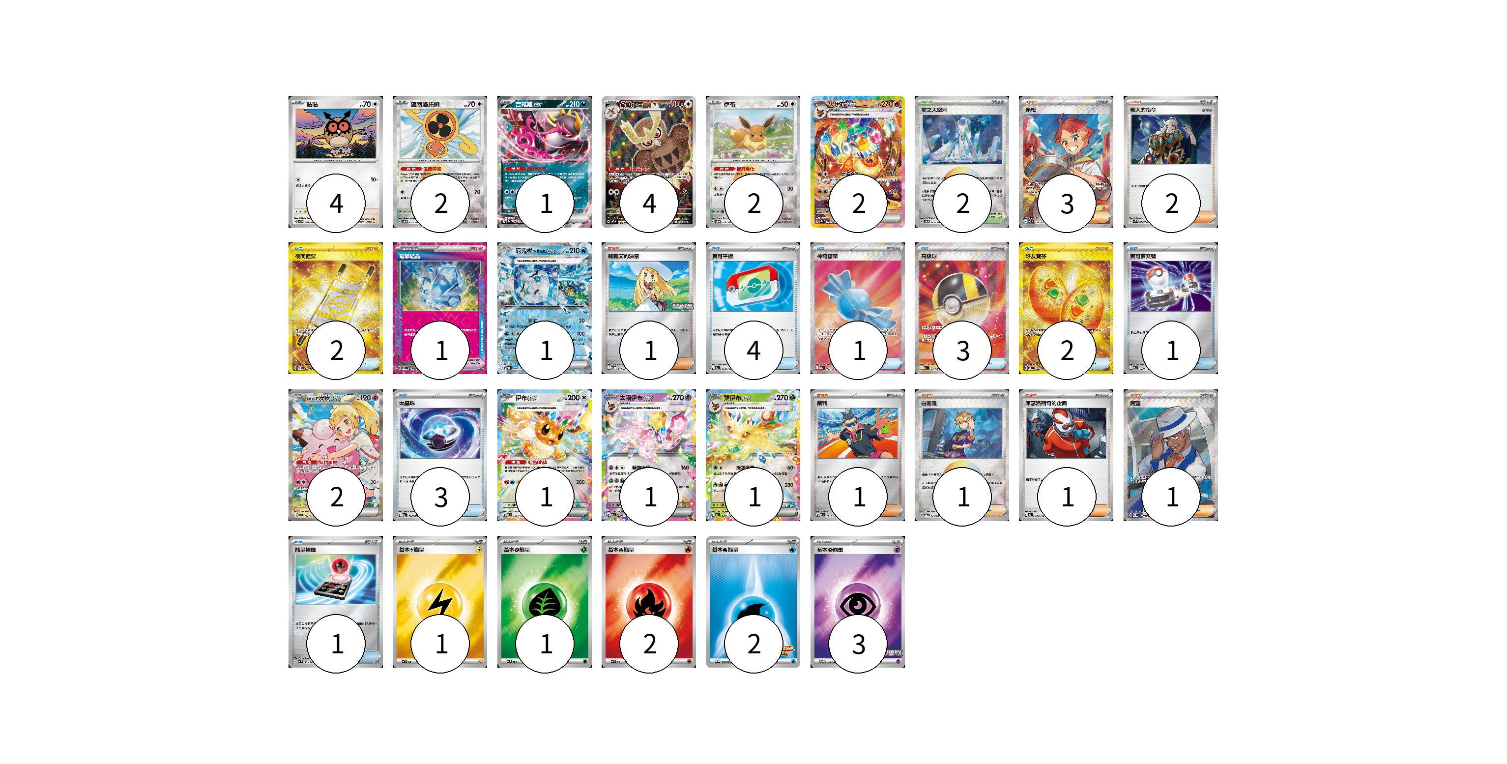 牌組構築方案 以此牌組為基礎新構築牌組 顯示卡面 顯示列表 寶可夢卡(21) 4 2 1 4 2 2 1 2 1 1 1 寶可夢道具(1) 1 物品卡(17) 2 4 1 3 2 1 3 1 支援者卡(10) 3 2 1 1 1 1 1 競技場卡(2) 2 能量卡(9) 1 1 2 2 3 寶可夢卡(21) 卡牌名稱 張數 卡牌名稱 張數 咕咕 SV7 076/102 04 旋轉洛托姆 SV8a 131/187 02 吉雉雞ex SV8a 104/187 01 貓頭夜鷹 SV7 114/102 04 伊布 SV8a 125/187 02 火伊布ex SV8a 202/187 02 厄鬼椪 水井面具ex SV8a 050/187 01 莉莉艾的皮皮ex MC 765/742 02 伊布ex MC 566/742 01 太陽伊布ex MC 298/742 01 葉伊布ex MC 038/742 01 寶可夢道具(1) 卡牌名稱 張數 卡牌名稱 張數 璀璨結晶 SV7 094/102 01 物品卡(17) 卡牌名稱 張數 卡牌名稱 張數 夜間擔架 SV8 137/106 02 寶可平板 MC 662/742 04 神奇糖果 M1S 082/063 01 高級球 M2a 216/193 03 好友寶芬 SV6 133/101 02 寶可夢交替 MC 663/742 01 太晶珠 M2a 152/193 03 能量輸送 MC 639/742 01 支援者卡(10) 卡牌名稱 張數 卡牌名稱 張數 赤松 SV7 123/102 03 老大的指令 SVK 036/042 02 莉莉艾的決意 M-P 011/M-P 01 裁判 MC 711/742 01 白蕾雅 SV8a 176/187 01 庫瑟洛斯奇的企圖 MC 705/742 01 席藍 SV8 127/106 01 競技場卡(2) 卡牌名稱 張數 卡牌名稱 張數 零之大空洞 SV8a 182/187 02 能量卡(9) 卡牌名稱 張數 卡牌名稱 張數 基本【雷】能量 MC LIG 01 基本【草】能量 MC GRA 01 基本【火】能量 MC FIR 02 基本【水】能量 SV-P 259/SV-P 02 基本【超】能量 M-P 033/M-P 03 以此牌組為基礎新構築牌組 牌組編碼 fFkVis-ZHyhrX-XfedMC copy 列印牌組單 牌組編碼已複製 分享至SNS