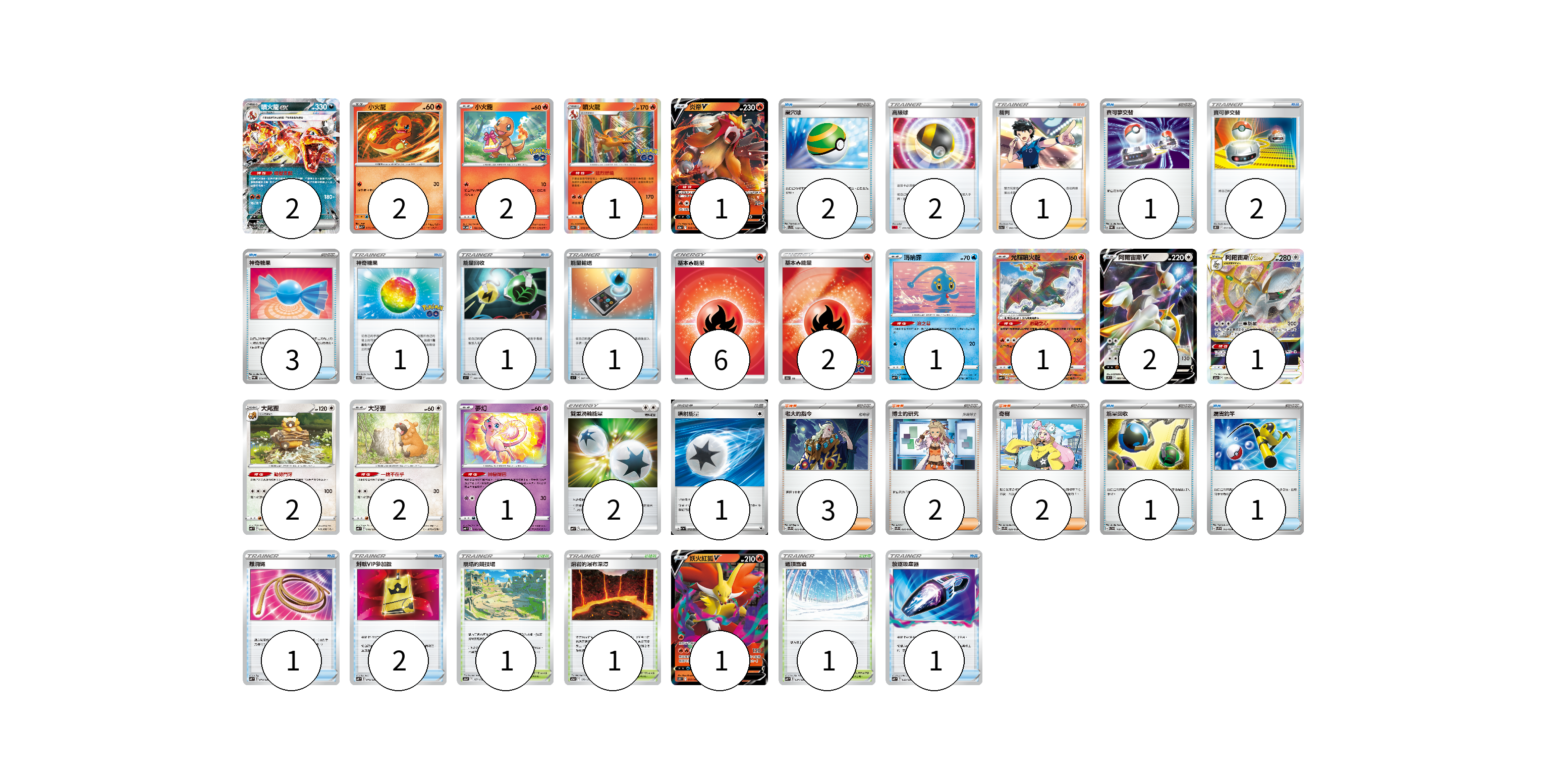 牌組構築方案 以此牌組為基礎新構築牌組 顯示卡面 顯示列表 寶可夢卡(19) 2 2 2 1 1 1 1 2 1 2 2 1 1 物品卡(19) 2 2 1 2 3 1 1 1 1 1 1 2 1 支援者卡(8) 1 3 2 2 競技場卡(3) 1 1 1 能量卡(11) 6 2 2 1 寶可夢卡(19) 卡牌名稱 張數 卡牌名稱 張數 噴火龍ex SV3 066/108 02 小火龍 SV3 012/108 02 小火龍 S-P 183/S-P 02 噴火龍 S10b 010/071 01 炎帝V S12a 019/172 01 瑪納霏 SVF 003/038 01 光輝噴火龍 SVF 001/038 01 阿爾宙斯V S9 083/100 02 阿爾宙斯VSTAR S12a 127/172 01 大尾狸 SVF 009/038 02 大牙狸 SVF 008/038 02 夢幻 SVF 005/038 01 妖火紅狐V S11 017/100 01 物品卡(19) 卡牌名稱 張數 卡牌名稱 張數 巢穴球 SVD 118/139 02 高級球 SDL 014/021 02 寶可夢交替 SVAL 016/021 01 寶可夢交替 SN 017/024 02 神奇糖果 SVAL 014/021 03 神奇糖果 S10b 066/071 01 能量回收 SI 365/414 01 能量輸送 SI 367/414 01 能量回收 SVD 110/139 01 厲害釣竿 SVF 013/038 01 離洞繩 SVF 010/038 01 對戰VIP參加證 SVF 018/038 02 放逐吸塵器 SVF 023/038 01 支援者卡(8) 卡牌名稱 張數 卡牌名稱 張數 裁判 S11a 063/068 01 老大的指令 SVF 032/038 03 博士的研究 SVF 030/038 02 奇樹 SVF 029/038 02 競技場卡(3) 卡牌名稱 張數 卡牌名稱 張數 崩塌的競技場 S12a 167/172 01 熔岩的瀑布深潭 S12a 170/172 01 通頂雪道 SVF 034/038 01 能量卡(11) 卡牌名稱 張數 卡牌名稱 張數 基本【炎】能量 SI FIR 06 基本火能量 S10b FIR 02 雙重渦輪能量 SVF 038/038 02 噴射能量 SV1a 072/073 01 以此牌組為基礎新構築牌組 牌組編碼 fFtxMe-SKDdqA-YPilFl copy 列印牌組單 牌組編碼已複製 分享至SNS