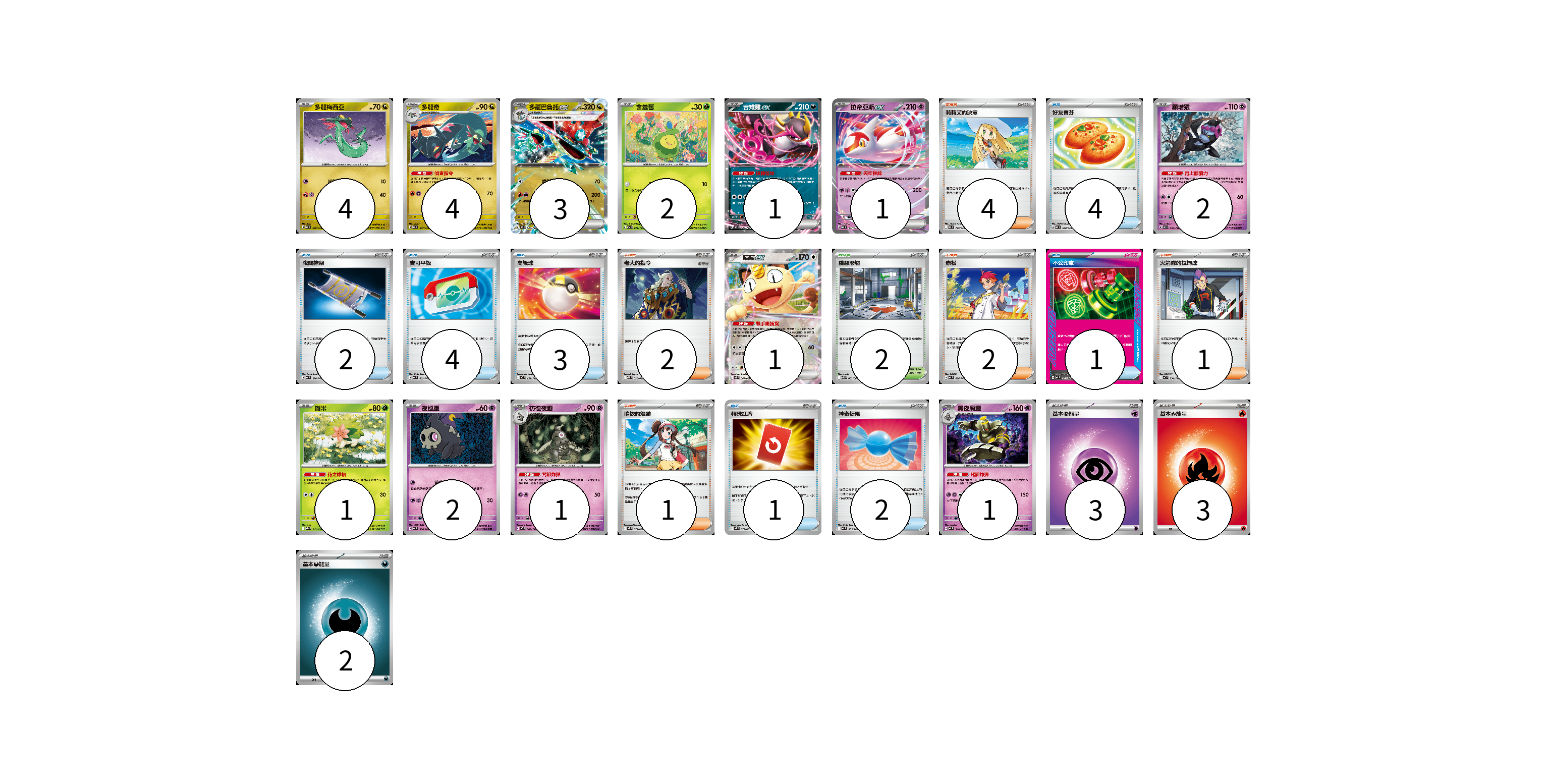 牌組構築方案 以此牌組為基礎新構築牌組 顯示卡面 顯示列表 寶可夢卡(23) 4 4 3 2 1 1 2 1 1 2 1 1 物品卡(17) 4 2 4 3 1 1 2 支援者卡(10) 4 2 2 1 1 競技場卡(2) 2 能量卡(8) 3 3 2 寶可夢卡(23) 卡牌名稱 張數 卡牌名稱 張數 多龍梅西亞 MC 546/742 04 多龍奇 MC 547/742 04 多龍巴魯托ex MC 548/742 03 含羞苞 M2a 011/193 02 吉雉雞ex MC 489/742 01 拉帝亞斯ex MC 312/742 01 願增猿 MC 358/742 02 喵喵ex M3 061/080 01 謝米 M2a 012/193 01 夜巡靈 MC 308/742 02 彷徨夜靈 MC 309/742 01 黑夜魔靈 MC 310/742 01 物品卡(17) 卡牌名稱 張數 卡牌名稱 張數 好友寶芬 MC 648/742 04 夜間擔架 MC 670/742 02 寶可平板 MC 662/742 04 高級球 MC 651/742 03 不公印章 MC 633/742 01 特殊紅牌 M4 072/083 01 神奇糖果 MC 655/742 02 支援者卡(10) 卡牌名稱 張數 卡牌名稱 張數 莉莉艾的決意 MC 729/742 04 老大的指令 MBD 020/022 02 赤松 MC 696/742 02 火箭隊的拉姆達 MC 734/742 01 鳴依的勉勵 M3 075/080 01 競技場卡(2) 卡牌名稱 張數 卡牌名稱 張數 險惡廢墟 M1L 063/063 02 能量卡(8) 卡牌名稱 張數 卡牌名稱 張數 基本【超】能量 MC PSY 03 基本【火】能量 MC FIR 03 基本【惡】能量 MC DAR 02 以此牌組為基礎新構築牌組 牌組編碼 fGmZBN-XUdwiV-SxHzdc copy 列印牌組單 牌組編碼已複製 分享至SNS