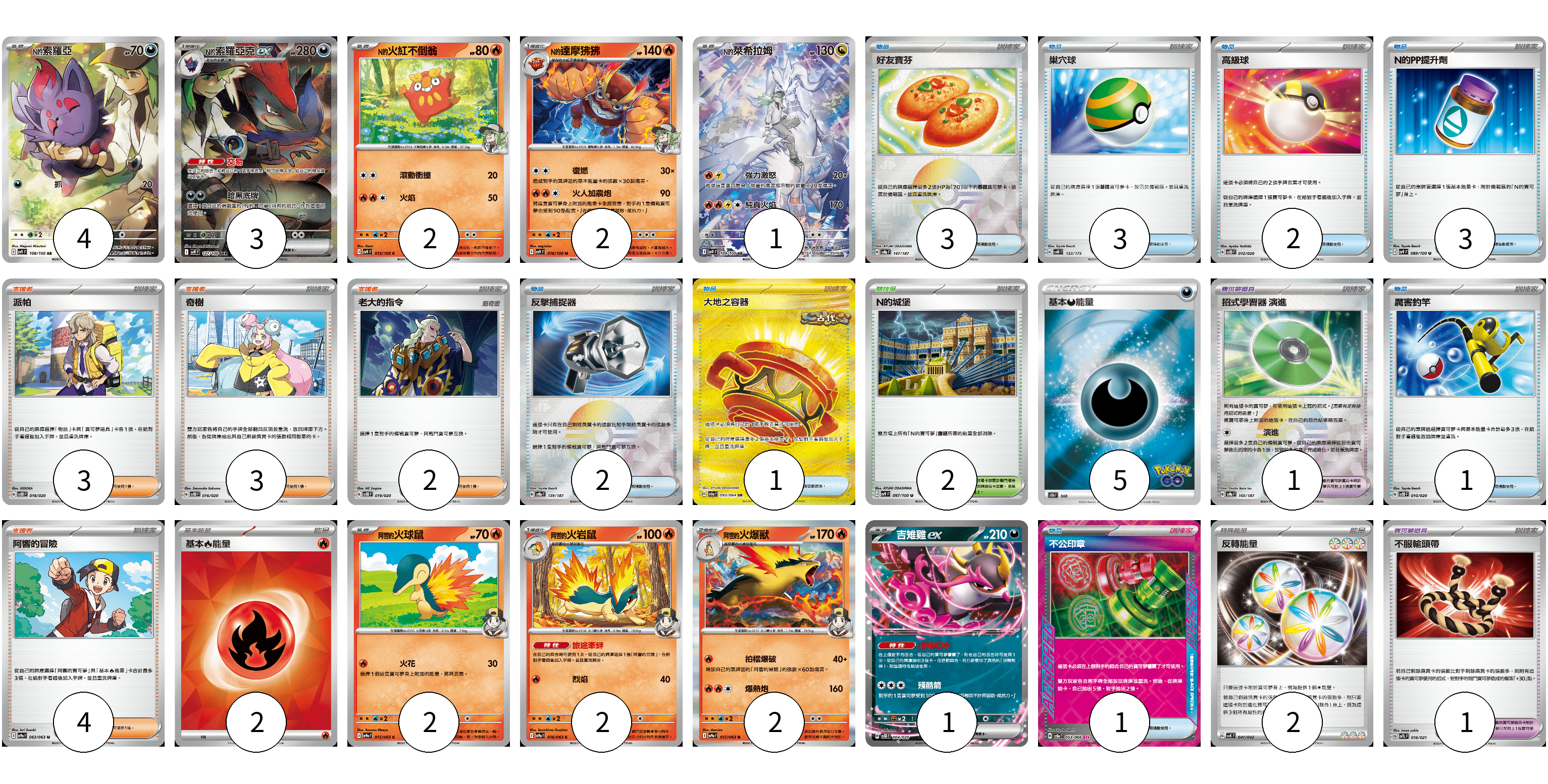 牌組構築方案 以此牌組為基礎新構築牌組 顯示卡面 顯示列表 寶可夢卡(19) 4 3 2 2 1 2 2 2 1 寶可夢道具(2) 1 1 物品卡(16) 3 3 2 3 2 1 1 1 支援者卡(12) 3 3 2 4 競技場卡(2) 2 能量卡(9) 5 2 2 寶可夢卡(19) 卡牌名稱 張數 卡牌名稱 張數 N的索羅亞 SV9 108/100 04 N的索羅亞克ex SV9 127/100 03 N的火紅不倒翁 SV9 015/100 02 N的達摩狒狒 SV9 016/100 02 N的萊希拉姆 SV9 109/100 01 <阿響的>火球鼠 SV9a 015/063 02 <阿響的>火岩鼠 SV9a 016/063 02 <阿響的>火爆獸 SV9a 017/063 02 吉雉雞ex SVOD 004/020 01 寶可夢道具(2) 卡牌名稱 張數 卡牌名稱 張數 招式學習器 演進 SV8a 160/187 01 不服輸頭帶 SVTL 016/021 01 物品卡(16) 卡牌名稱 張數 卡牌名稱 張數 好友寶芬 SV8a 147/187 03 巢穴球 SVM 133/175 03 高級球 SVOD 012/020 02 N的PP提升劑 SV9 089/100 03 反擊捕捉器 SV8a 139/187 02 大地之容器 SV6a 093/064 01 厲害釣竿 SVOD 010/020 01 不公印章 SV5a 053/066 01 支援者卡(12) 卡牌名稱 張數 卡牌名稱 張數 派帕 SVOD 018/020 03 奇樹 SVOD 016/020 03 老大的指令 SVOD 019/020 02 阿響的冒險 SV9a 063/063 04 競技場卡(2) 卡牌名稱 張數 卡牌名稱 張數 N的城堡 SV9 097/100 02 能量卡(9) 卡牌名稱 張數 卡牌名稱 張數 基本惡能量 S10b DAR 05 基本【火】能量 SVK FIR 02 反轉能量 SVK 041/042 02 以此牌組為基礎新構築牌組 牌組編碼 fLeEfM-KERYSf-rkdXCE copy 列印牌組單 牌組編碼已複製 分享至SNS