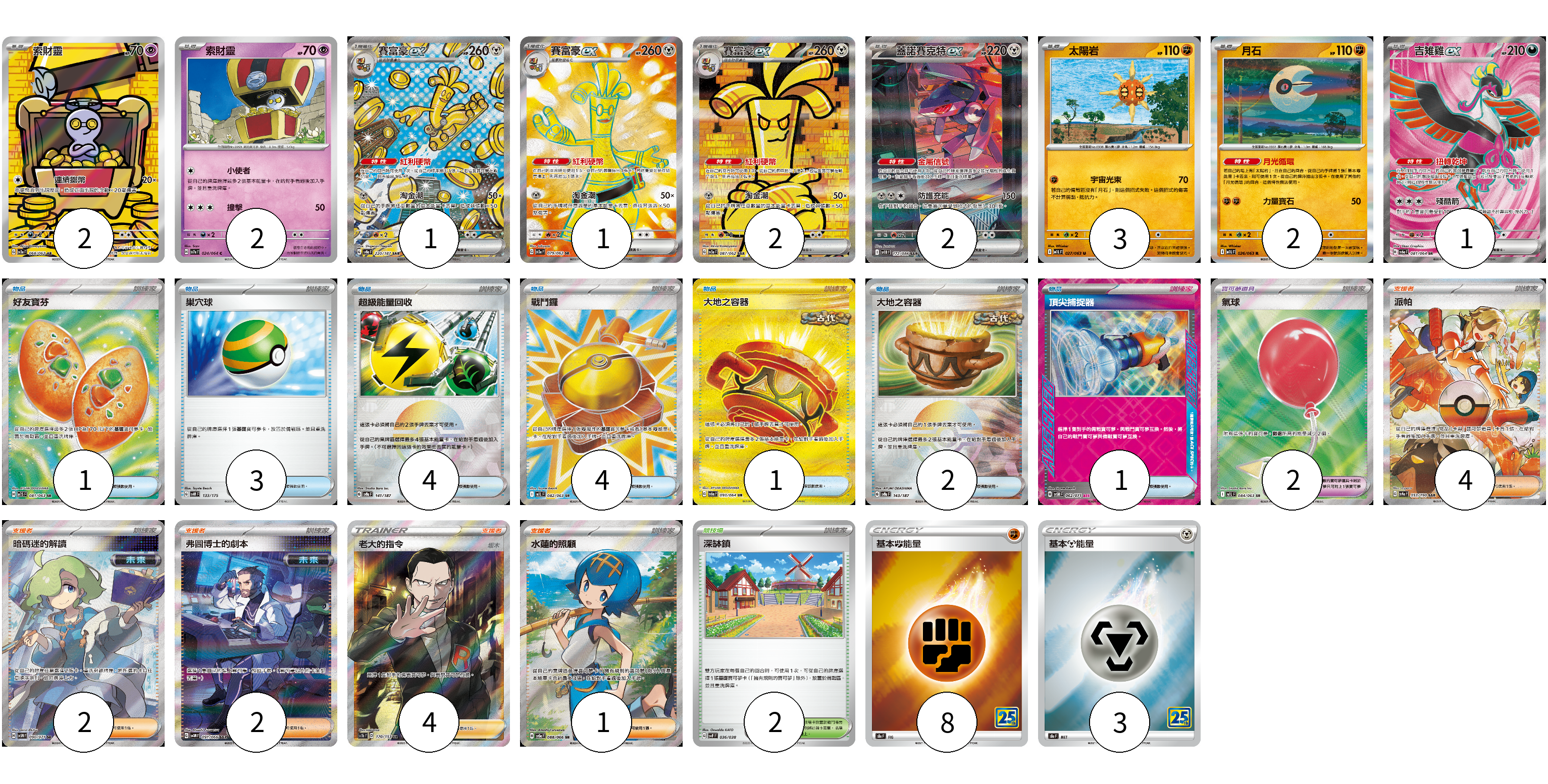 牌組構築方案 以此牌組為基礎新構築牌組 顯示卡面 顯示列表 寶可夢卡(16) 2 2 1 1 2 2 3 2 1 寶可夢道具(2) 2 物品卡(16) 1 3 4 4 1 2 1 支援者卡(13) 4 2 2 4 1 競技場卡(2) 2 能量卡(11) 8 3 寶可夢卡(16) 卡牌名稱 張數 卡牌名稱 張數 索財靈 SV3a 068/062 02 索財靈 SV7a 024/064 02 賽富豪ex SV8a 220/187 01 賽富豪ex SV3a 079/062 01 賽富豪ex SV3a 087/062 02 蓋諾賽克特ex SV11B 172/086 02 太陽岩 M1L 027/063 03 月石 M1L 026/063 02 吉雉雞ex SV6a 081/064 01 寶可夢道具(2) 卡牌名稱 張數 卡牌名稱 張數 氣球 M1L 084/063 02 物品卡(16) 卡牌名稱 張數 卡牌名稱 張數 好友寶芬 M1S 081/063 01 巢穴球 SVM 133/175 03 超級能量回收 SV8a 141/187 04 戰鬥鑼 M1L 082/063 04 大地之容器 SV6a 093/064 01 大地之容器 SV8a 143/187 02 頂尖捕捉器 SV5M 062/071 01 支援者卡(13) 卡牌名稱 張數 卡牌名稱 張數 派帕 SV4a 353/190 04 暗碼迷的解讀 SV5M 090/071 02 弗圖博士的劇本 SV4M 091/066 02 老大的指令(坂木) SC1b 170/153 04 水蓮的照顧 SV5a 088/066 01 競技場卡(2) 卡牌名稱 張數 卡牌名稱 張數 深缽鎮 SVF 036/038 02 能量卡(11) 卡牌名稱 張數 卡牌名稱 張數 基本鬥能量 S8a FIG 08 基本鋼能量 S8a MET 03 以此牌組為基礎新構築牌組 牌組編碼 fLeSSi-cUweaj-LEgKSJ copy 列印牌組單 牌組編碼已複製 分享至SNS