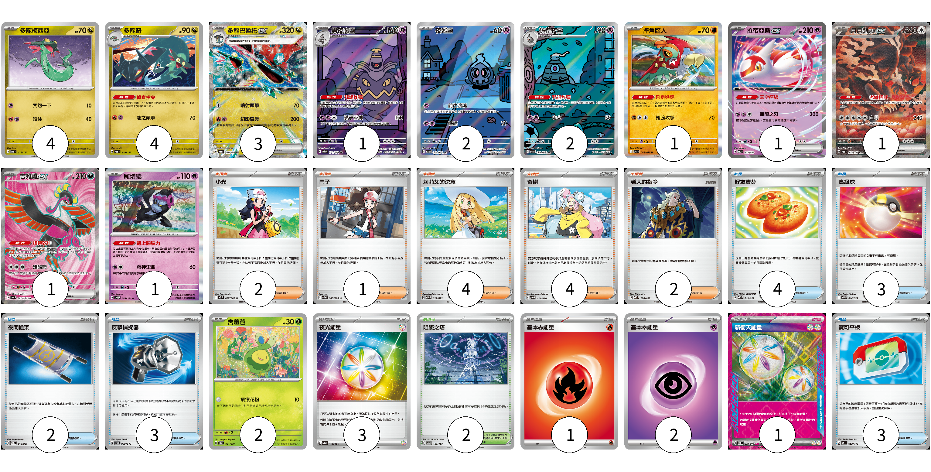牌組構築方案 以此牌組為基礎新構築牌組 顯示卡面 顯示列表 寶可夢卡(23) 4 4 3 1 2 2 1 1 1 1 1 2 物品卡(15) 4 3 2 3 3 支援者卡(13) 2 1 4 4 2 競技場卡(2) 2 能量卡(7) 3 1 2 1 寶可夢卡(23) 卡牌名稱 張數 卡牌名稱 張數 多龍梅西亞 SV8a 118/187 04 多龍奇 SV8a 119/187 04 多龍巴魯托ex SV8a 120/187 03 黑夜魔靈 SV6a 070/064 01 夜巡靈 SV6a 068/064 02 彷徨夜靈 SV6a 069/064 02 摔角鷹人 SV1S 045/078 01 拉帝亞斯ex MBD 003/022 01 月月熊 赫月ex SV8a 225/187 01 吉雉雞ex SV6a 081/064 01 願增猿 SV6 055/101 01 含羞苞 SV8a 001/187 02 物品卡(15) 卡牌名稱 張數 卡牌名稱 張數 好友寶芬 MBD 013/022 04 高級球 MBD 014/022 03 夜間擔架 SVOM 016/021 02 反擊捕捉器 SVK 009/042 03 寶可平板 MC 662/742 03 支援者卡(13) 卡牌名稱 張數 卡牌名稱 張數 小光 M2 077/080 02 鬥子 SV11W 085/086 01 莉莉艾的決意 MBG 022/022 04 奇樹 SVOD 016/020 04 老大的指令 MBD 020/022 02 競技場卡(2) 卡牌名稱 張數 卡牌名稱 張數 阻礙之塔 SV8a 181/187 02 能量卡(7) 卡牌名稱 張數 卡牌名稱 張數 夜光能量 SV4a 190/190 03 基本火能量 sv-p FIR 01 基本超能量 sv-p PSY 02 新衝天能量 SV5K 071/071 01 以此牌組為基礎新構築牌組 牌組編碼 fMbPFs-lhjodi-oojGHw copy 列印牌組單 牌組編碼已複製 分享至SNS