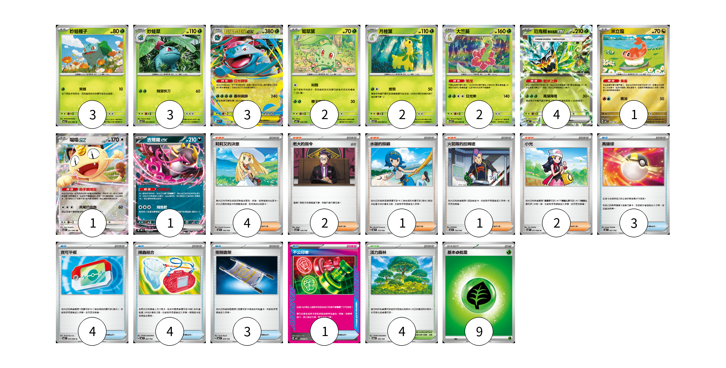牌組構築方案 以此牌組為基礎新構築牌組 顯示卡面 顯示列表 寶可夢卡(22) 3 3 3 2 2 2 4 1 1 1 物品卡(15) 3 4 4 3 1 支援者卡(10) 4 2 1 1 2 競技場卡(4) 4 能量卡(9) 9 寶可夢卡(22) 卡牌名稱 張數 卡牌名稱 張數 妙蛙種子 M1L 001/063 03 妙蛙草 M1L 002/063 03 超級妙蛙花ex M1L 003/063 03 菊草葉 MC 016/742 02 月桂葉 M1S 004/063 02 大竺葵 M1S 005/063 02 厄鬼椪 碧草面具ex MC 082/742 04 米立龍 MC 549/742 01 喵喵ex M3 061/080 01 吉雉雞ex MC 489/742 01 物品卡(15) 卡牌名稱 張數 卡牌名稱 張數 高級球 MC 651/742 03 寶可平板 M3 070/080 04 捕蟲組合 MC 667/742 04 夜間擔架 MC 670/742 03 不公印章 MC 633/742 01 支援者卡(10) 卡牌名稱 張數 卡牌名稱 張數 莉莉艾的決意 MC 729/742 04 老大的指令 MC 724/742 02 水蓮的照顧 MC 712/742 01 火箭隊的拉姆達 MC 734/742 01 小光 M2 077/080 02 競技場卡(4) 卡牌名稱 張數 卡牌名稱 張數 活力森林 M2a 182/193 04 能量卡(9) 卡牌名稱 張數 卡牌名稱 張數 基本【草】能量 MC GRA 09 以此牌組為基礎新構築牌組 牌組編碼 fMkbLh-MjWnxU-SfPBFm copy 列印牌組單 牌組編碼已複製 分享至SNS