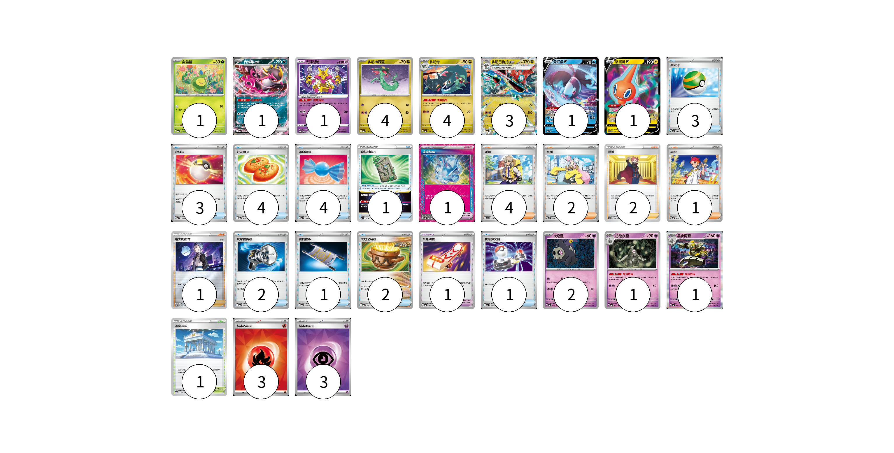牌組構築方案 以此牌組為基礎新構築牌組 顯示卡面 顯示列表 寶可夢卡(20) 1 1 1 4 4 3 1 1 2 1 1 寶可夢道具(2) 1 1 物品卡(21) 3 3 4 4 1 2 1 2 1 支援者卡(10) 4 2 2 1 1 競技場卡(1) 1 能量卡(6) 3 3 寶可夢卡(20) 卡牌名稱 張數 卡牌名稱 張數 含羞苞 SV8a 001/187 01 吉雉雞ex SV8a 104/187 01 光輝胡地 SVTM 006/022 01 多龍梅西亞 SV8a 118/187 04 多龍奇 SV8a 119/187 04 多龍巴魯托ex SV8a 120/187 03 霓虹魚V SVF 002/038 01 洛托姆V S11 037/100 01 夜巡靈 SV8a 064/187 02 彷徨夜靈 SV8a 065/187 01 黑夜魔靈 SV8a 066/187 01 寶可夢道具(2) 卡牌名稱 張數 卡牌名稱 張數 璀璨結晶 SV8a 152/187 01 緊急滑板 SV8a 153/187 01 物品卡(21) 卡牌名稱 張數 卡牌名稱 張數 巢穴球 SVM 133/175 03 高級球 SVM 134/175 03 好友寶芬 SV8a 147/187 04 神奇糖果 SVM 135/175 04 森林封印石 SVF 024/038 01 反擊捕捉器 SV8a 139/187 02 夜間擔架 SV8a 151/187 01 大地之容器 SV8a 143/187 02 寶可夢交替 SVM 136/175 01 支援者卡(10) 卡牌名稱 張數 卡牌名稱 張數 派帕 SVK 035/042 04 奇樹 SVM 160/175 02 阿渡 S12 096/098 02 赤松 SV8a 163/187 01 老大的指令(赤日) SO 028/030 01 競技場卡(1) 卡牌名稱 張數 卡牌名稱 張數 神奧神殿 S12a 169/172 01 能量卡(6) 卡牌名稱 張數 卡牌名稱 張數 基本【火】能量 SVK FIR 03 基本【超】能量 SVK PSY 03 以此牌組為基礎新構築牌組 牌組編碼 fODETF-IsLxfZ-dqcYnX copy 列印牌組單 牌組編碼已複製 分享至SNS