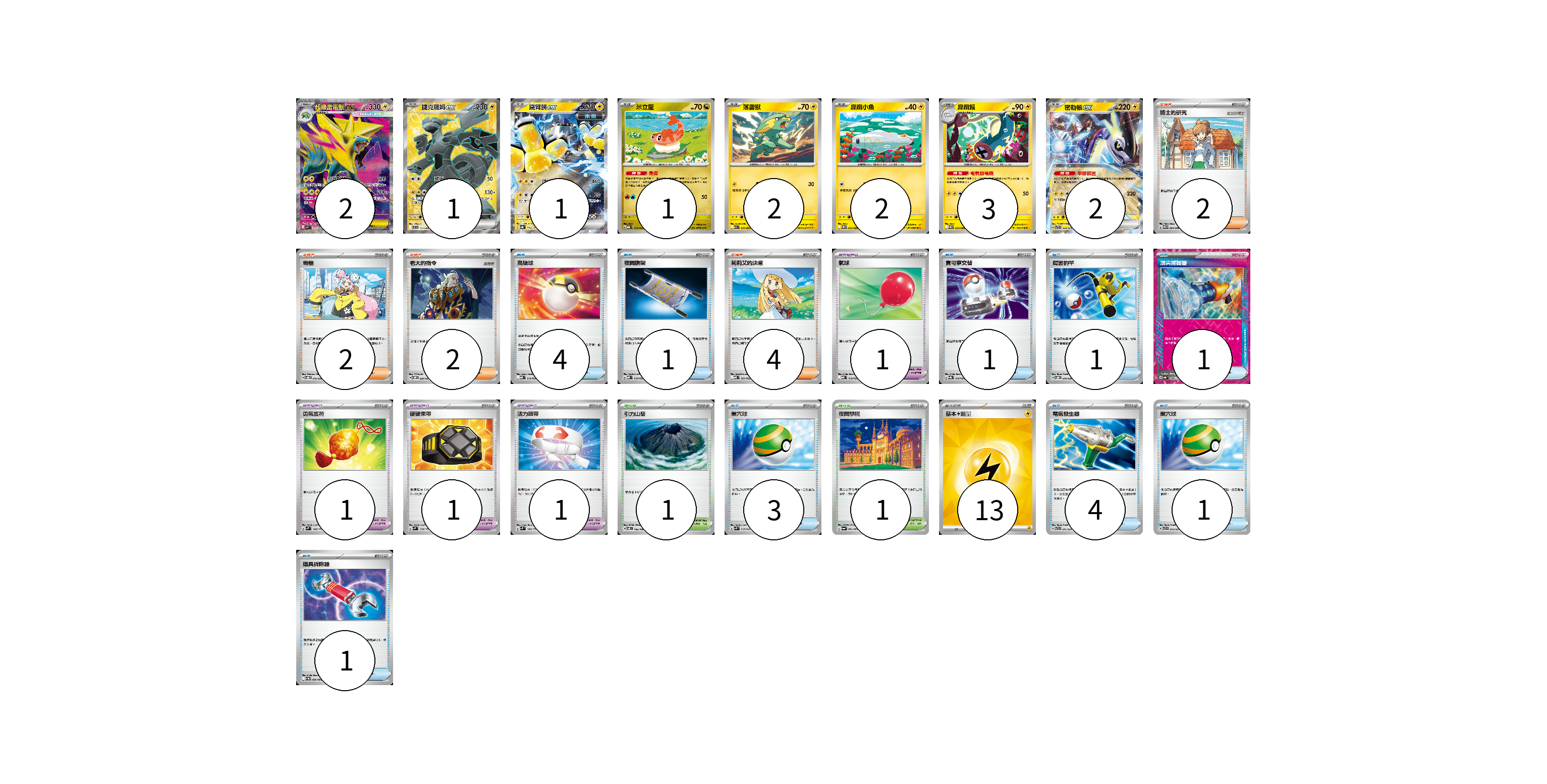 牌組構築方案 以此牌組為基礎新構築牌組 顯示卡面 顯示列表 寶可夢卡(14) 2 1 1 1 2 2 3 2 寶可夢道具(4) 1 1 1 1 物品卡(17) 4 1 1 1 1 3 4 1 1 支援者卡(10) 2 2 2 4 競技場卡(2) 1 1 能量卡(13) 13 寶可夢卡(14) 卡牌名稱 張數 卡牌名稱 張數 超級雷電獸ex M1S 077/063 02 捷克羅姆ex SV11B 161/086 01 鐵臂膀ex SV8a 054/187 01 米立龍 MBG 010/022 01 落雷獸 M1S 031/063 02 麻麻小魚 SV11B 033/086 02 麻麻鰻 SV11B 034/086 03 密勒頓ex SVTR 008/021 02 寶可夢道具(4) 卡牌名稱 張數 卡牌名稱 張數 氣球 MBD 018/022 01 勇氣護符 SVM 142/175 01 硬硬束帶 SVM 139/175 01 活力頭帶 SVM 140/175 01 物品卡(17) 卡牌名稱 張數 卡牌名稱 張數 高級球 MBD 014/022 04 夜間擔架 MBD 016/022 01 寶可夢交替 SVQL 016/022 01 厲害釣竿 SVOD 010/020 01 頂尖捕捉器 SV8a 148/187 01 巢穴球 SVK 016/042 03 電氣發生器 SVTR 011/021 04 巢穴球 SVTR 013/021 01 道具拆除器 SV11W 080/086 01 支援者卡(10) 卡牌名稱 張數 卡牌名稱 張數 博士的研究 SV11B 084/086 02 奇樹 SVOD 016/020 02 老大的指令 SVOM 020/021 02 莉莉艾的決意 MBD 021/022 04 競技場卡(2) 卡牌名稱 張數 卡牌名稱 張數 引力山岳 SV8 106/106 01 夜間學院 SV6a 064/064 01 能量卡(13) 卡牌名稱 張數 卡牌名稱 張數 基本【雷】能量 SVK LIG 13 以此牌組為基礎新構築牌組 牌組編碼 fOlzLB-kkCIkx-LGaWGk copy 列印牌組單 牌組編碼已複製 分享至SNS