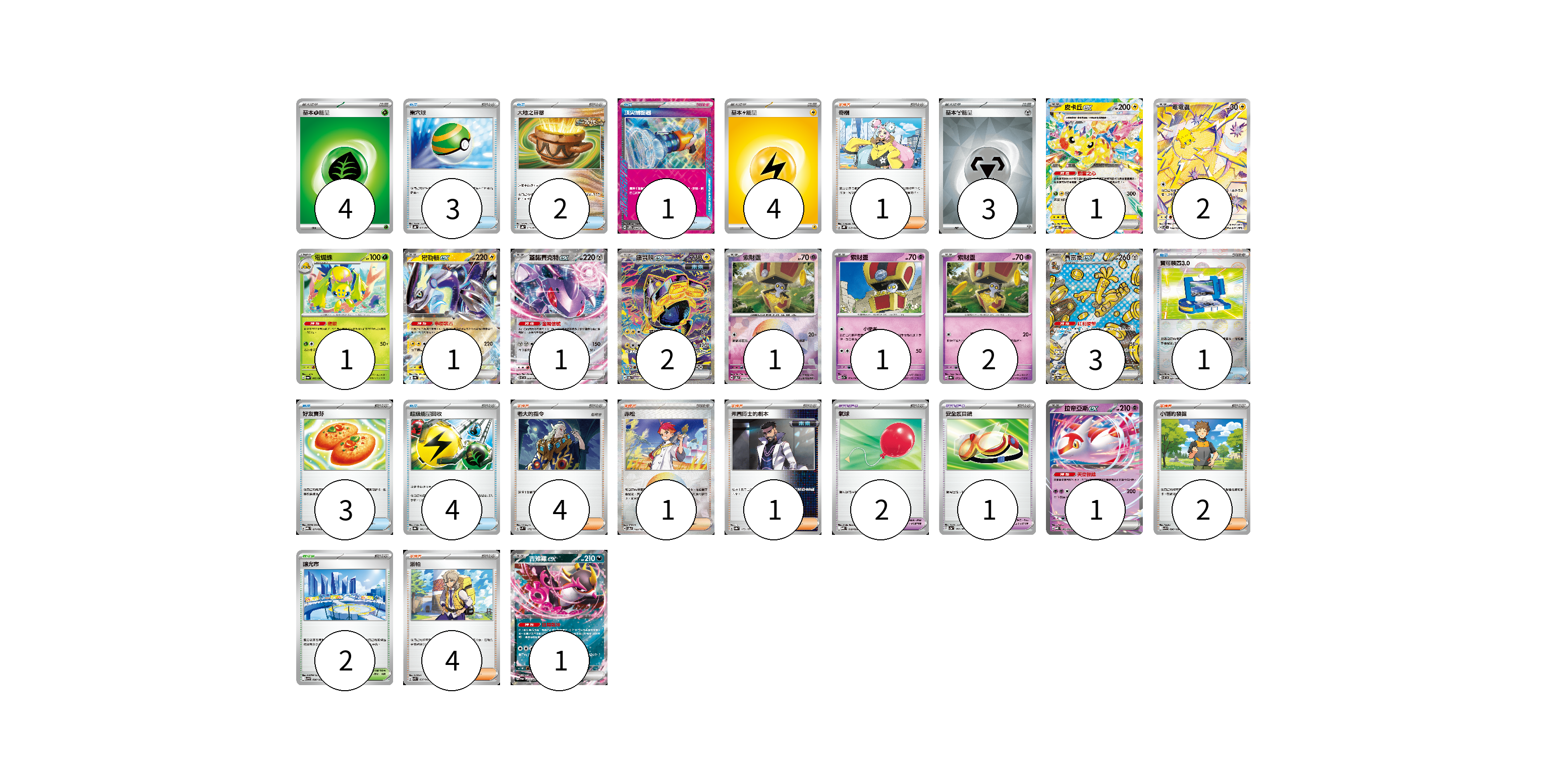 牌組構築方案 以此牌組為基礎新構築牌組 顯示卡面 顯示列表 寶可夢卡(17) 1 2 1 1 1 2 1 1 2 3 1 1 寶可夢道具(3) 2 1 物品卡(14) 3 2 1 1 3 4 支援者卡(13) 1 4 1 1 2 4 競技場卡(2) 2 能量卡(11) 4 4 3 寶可夢卡(17) 卡牌名稱 張數 卡牌名稱 張數 皮卡丘ex SV8 033/106 01 電電蟲 SV7 108/102 02 電蜘蛛 SV6a 002/064 01 密勒頓ex SV4a 071/190 01 蓋諾賽克特ex SV11B 069/086 01 鐵臂膀ex SV8a 210/187 02 索財靈 SV8a 073/187 01 索財靈 SV7a 024/064 01 索財靈 SV8a 073/187 02 賽富豪ex SV8a 220/187 03 拉帝亞斯ex MBD 003/022 01 吉雉雞ex SV6a 038/064 01 寶可夢道具(3) 卡牌名稱 張數 卡牌名稱 張數 氣球 MBD 018/022 02 安全護目鏡 SV2a 157/165 01 物品卡(14) 卡牌名稱 張數 卡牌名稱 張數 巢穴球 SVHK 012/022 03 大地之容器 SVHK 011/022 02 頂尖捕捉器 SV5M 062/071 01 寶可裝置3.0 SV11B 081/086 01 好友寶芬 MBG 011/022 03 超級能量回收 SV8a 141/187 04 支援者卡(13) 卡牌名稱 張數 卡牌名稱 張數 奇樹 SVHK 019/022 01 老大的指令 SVM 172/175 04 赤松 SV8a 163/187 01 弗圖博士的劇本 SV8a 175/187 01 小剛的發掘 SV9 096/100 02 派帕 SVK 035/042 04 競技場卡(2) 卡牌名稱 張數 卡牌名稱 張數 釀光市 SV9 098/100 02 能量卡(11) 卡牌名稱 張數 卡牌名稱 張數 基本草能量 sv-p GRA 04 基本雷能量 sv-p LIG 04 基本【鋼】能量 SVOD MET 03 以此牌組為基礎新構築牌組 牌組編碼 fPZIkz-kluCWc-MYWZmk copy 列印牌組單 牌組編碼已複製 分享至SNS