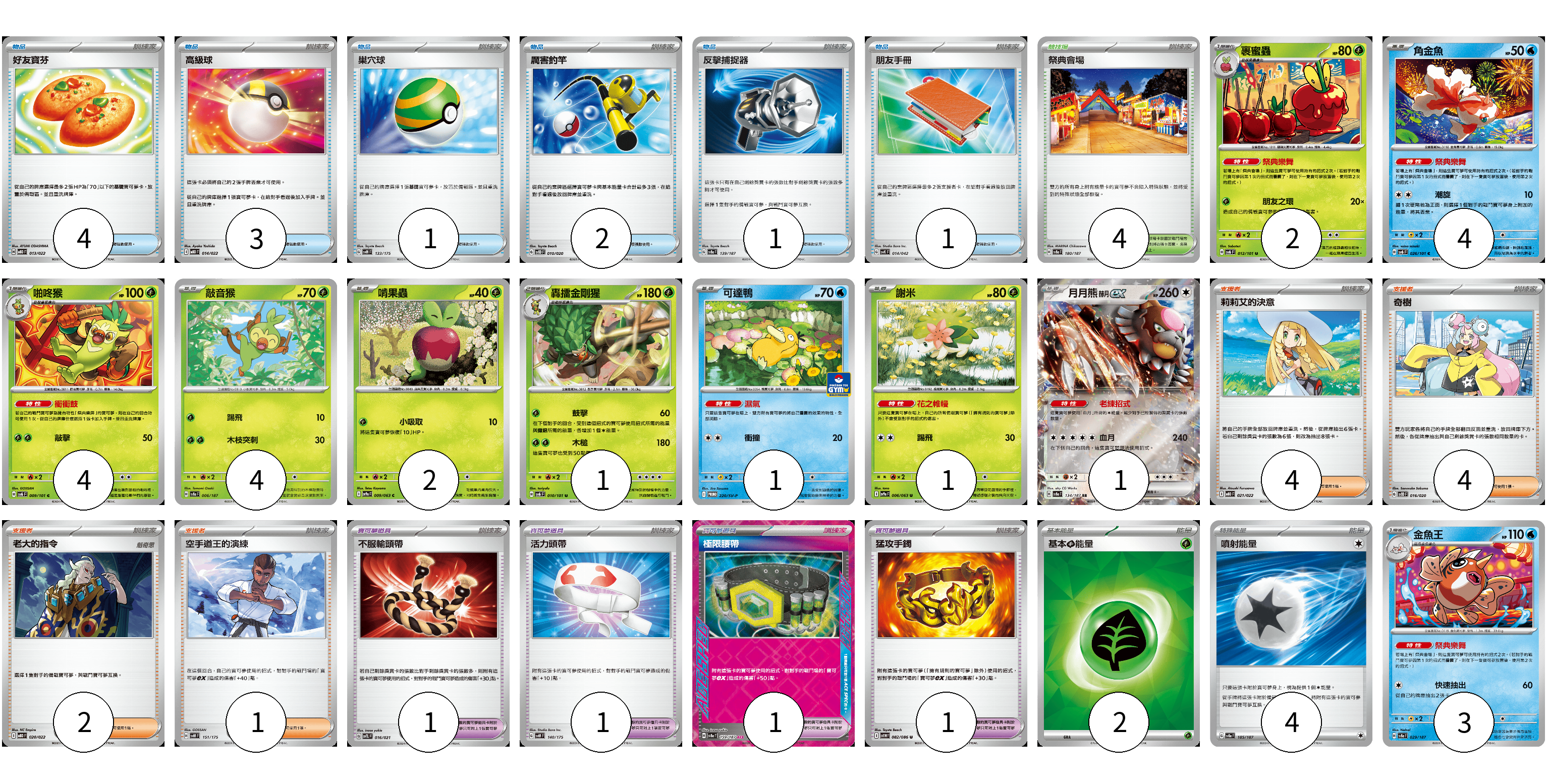 牌組構築方案 以此牌組為基礎新構築牌組 顯示卡面 顯示列表 寶可夢卡(23) 2 4 4 4 2 1 1 1 1 3 寶可夢道具(4) 1 1 1 1 物品卡(12) 4 3 1 2 1 1 支援者卡(11) 4 4 2 1 競技場卡(4) 4 能量卡(6) 2 4 寶可夢卡(23) 卡牌名稱 張數 卡牌名稱 張數 裹蜜蟲 SV6 012/101 02 角金魚 SV6 026/101 04 啪咚猴 SV6 009/101 04 敲音猴 SV8a 006/187 04 啃果蟲 SV9a 009/063 02 轟擂金剛猩 SV6 010/101 01 可達鴨 SV-P 220/SV-P 01 謝米 SV9a 006/063 01 月月熊 赫月ex SV8a 134/187 01 金魚王 SV8a 029/187 03 寶可夢道具(4) 卡牌名稱 張數 卡牌名稱 張數 不服輸頭帶 SVTL 016/021 01 活力頭帶 SVM 140/175 01 極限腰帶 SV8a 159/187 01 猛攻手鐲 SV11W 082/086 01 物品卡(12) 卡牌名稱 張數 卡牌名稱 張數 好友寶芬 MBD 013/022 04 高級球 MBD 014/022 03 巢穴球 SVM 133/175 01 厲害釣竿 SVOD 010/020 02 反擊捕捉器 SV8a 139/187 01 朋友手冊 SVK 014/042 01 支援者卡(11) 卡牌名稱 張數 卡牌名稱 張數 莉莉艾的決意 MBD 021/022 04 奇樹 SVOD 016/020 04 老大的指令 MBD 020/022 02 空手道王的演練 SVM 151/175 01 競技場卡(4) 卡牌名稱 張數 卡牌名稱 張數 祭典會場 SV8a 180/187 04 能量卡(6) 卡牌名稱 張數 卡牌名稱 張數 基本【草】能量 SVK GRA 02 噴射能量 SV8a 185/187 04 以此牌組為基礎新構築牌組 牌組編碼 fPbuhR-rZZJjI-MbLzZf copy 列印牌組單 牌組編碼已複製 分享至SNS