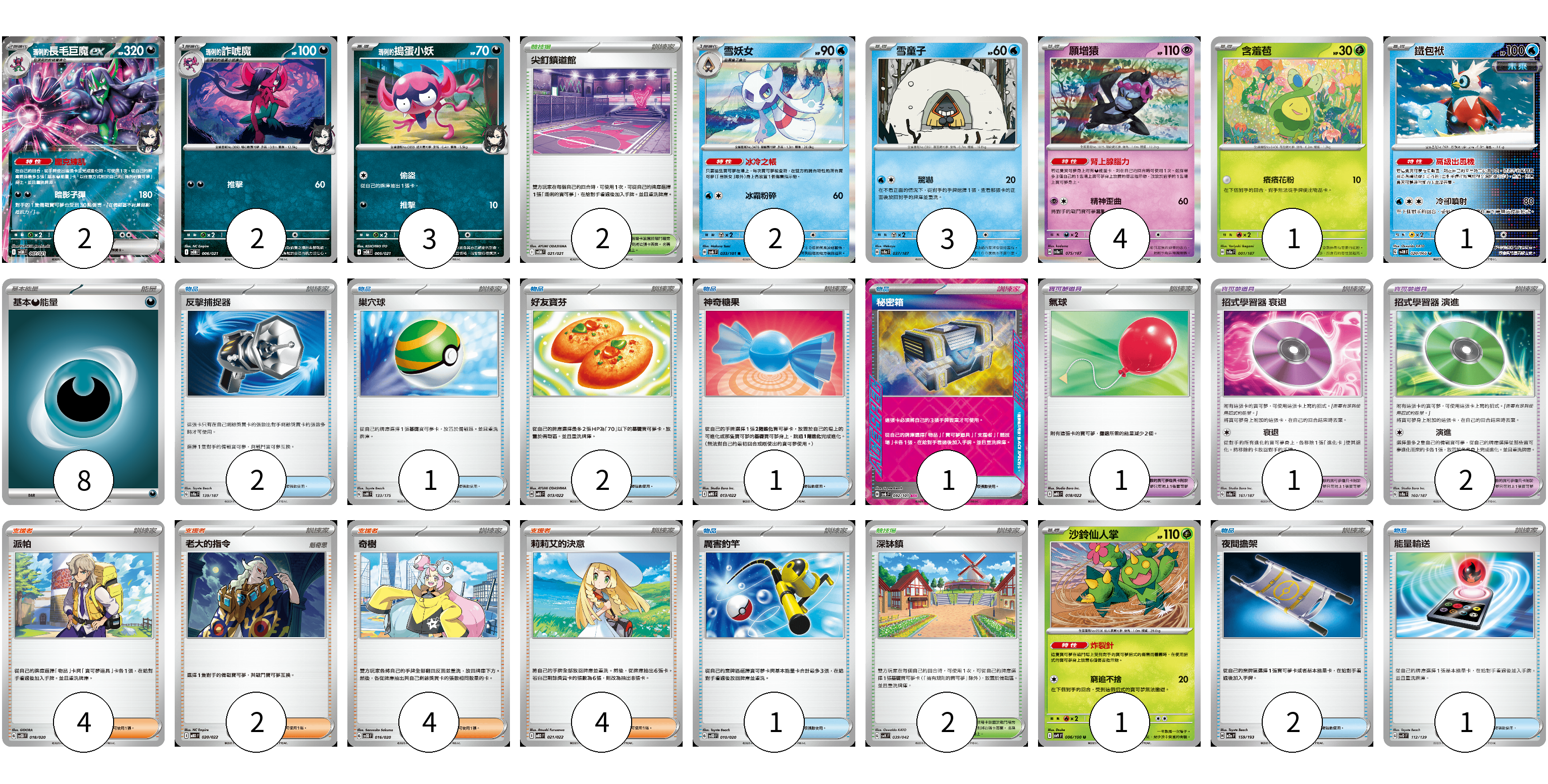 牌組構築方案 以此牌組為基礎新構築牌組 顯示卡面 顯示列表 寶可夢卡(19) 2 2 3 2 3 4 1 1 1 寶可夢道具(4) 1 1 2 物品卡(11) 2 1 2 1 1 1 2 1 支援者卡(14) 4 2 4 4 競技場卡(4) 2 2 能量卡(8) 8 寶可夢卡(19) 卡牌名稱 張數 卡牌名稱 張數 <瑪俐的>長毛巨魔ex SVOM 007/021 02 <瑪俐的>詐唬魔 SVOM 006/021 02 <瑪俐的>搗蛋小妖 SVOM 005/021 03 雪妖女 SV6 033/101 02 雪童子 SV8a 037/187 03 願增猿 SV8a 075/187 04 含羞苞 SV8a 001/187 01 鐵包袱 SV4M 020/066 01 沙鈴仙人掌 SV9 006/100 01 寶可夢道具(4) 卡牌名稱 張數 卡牌名稱 張數 氣球 MBD 018/022 01 招式學習器 衰退 SV8a 161/187 01 招式學習器 演進 SV8a 160/187 02 物品卡(11) 卡牌名稱 張數 卡牌名稱 張數 反擊捕捉器 SV8a 139/187 02 巢穴球 SVM 133/175 01 好友寶芬 MBD 013/022 02 神奇糖果 MBG 013/022 01 秘密箱 SV6 092/101 01 厲害釣竿 SVOD 010/020 01 夜間擔架 M2a 159/193 02 能量輸送 SVD 112/139 01 支援者卡(14) 卡牌名稱 張數 卡牌名稱 張數 派帕 SVOD 018/020 04 老大的指令 MBD 020/022 02 奇樹 SVOD 016/020 04 莉莉艾的決意 MBD 021/022 04 競技場卡(4) 卡牌名稱 張數 卡牌名稱 張數 尖釘鎮道館 SVOM 021/021 02 深缽鎮 SVK 039/042 02 能量卡(8) 卡牌名稱 張數 卡牌名稱 張數 基本惡能量 sv-p DAR 08 以此牌組為基礎新構築牌組 牌組編碼 fPeiSJ-UbIVLx-pKiqUc copy 列印牌組單 牌組編碼已複製 分享至SNS