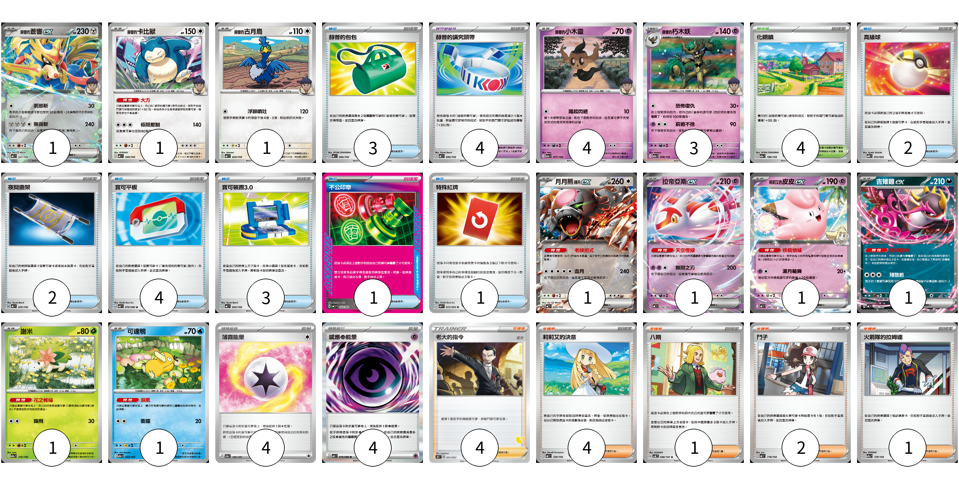 牌組構築方案 以此牌組為基礎新構築牌組 顯示卡面 顯示列表 寶可夢卡(16) 1 1 1 4 3 1 1 1 1 1 1 寶可夢道具(4) 4 物品卡(16) 3 2 2 4 3 1 1 支援者卡(12) 4 4 1 2 1 競技場卡(4) 4 能量卡(8) 4 4 寶可夢卡(16) 卡牌名稱 張數 卡牌名稱 張數 <赫普的>蒼響ex MC 527/742 01 赫普的卡比獸 MC 569/742 01 <赫普的>古月鳥 MC 624/742 01 赫普的小木靈 M2a 077/193 04 赫普的朽木妖 M2a 078/193 03 月月熊 赫月 ex MC 625/742 01 拉帝亞斯ex MC 312/742 01 <莉莉艾的>皮皮ex MC 287/742 01 吉雉雞ex MC 489/742 01 謝米 M2a 012/193 01 可達鴨 M2a 032/193 01 寶可夢道具(4) 卡牌名稱 張數 卡牌名稱 張數 赫普的講究頭帶 MC 690/742 04 物品卡(16) 卡牌名稱 張數 卡牌名稱 張數 赫普的包包 MC 666/742 03 高級球 MBG 012/022 02 夜間擔架 MC 670/742 02 寶可平板 M3 070/080 04 寶可裝置3.0 MC 660/742 03 不公印章 MC 633/742 01 特殊紅牌 M4 072/083 01 支援者卡(12) 卡牌名稱 張數 卡牌名稱 張數 老大的指令(坂木) SH 051/053 04 莉莉艾的決意 MC 729/742 04 八朔 SV6 098/101 01 鬥子 MC 718/742 02 火箭隊的拉姆達 M2a 179/193 01 競技場卡(4) 卡牌名稱 張數 卡牌名稱 張數 化朗鎮 M2a 186/193 04 能量卡(8) 卡牌名稱 張數 卡牌名稱 張數 薄霧能量 SV8a 186/187 04 感應【超】能量 M3 079/080 04 以此牌組為基礎新構築牌組 牌組編碼 fPjcLL-UFQjhZ-watYGq copy 列印牌組單 牌組編碼已複製 分享至SNS