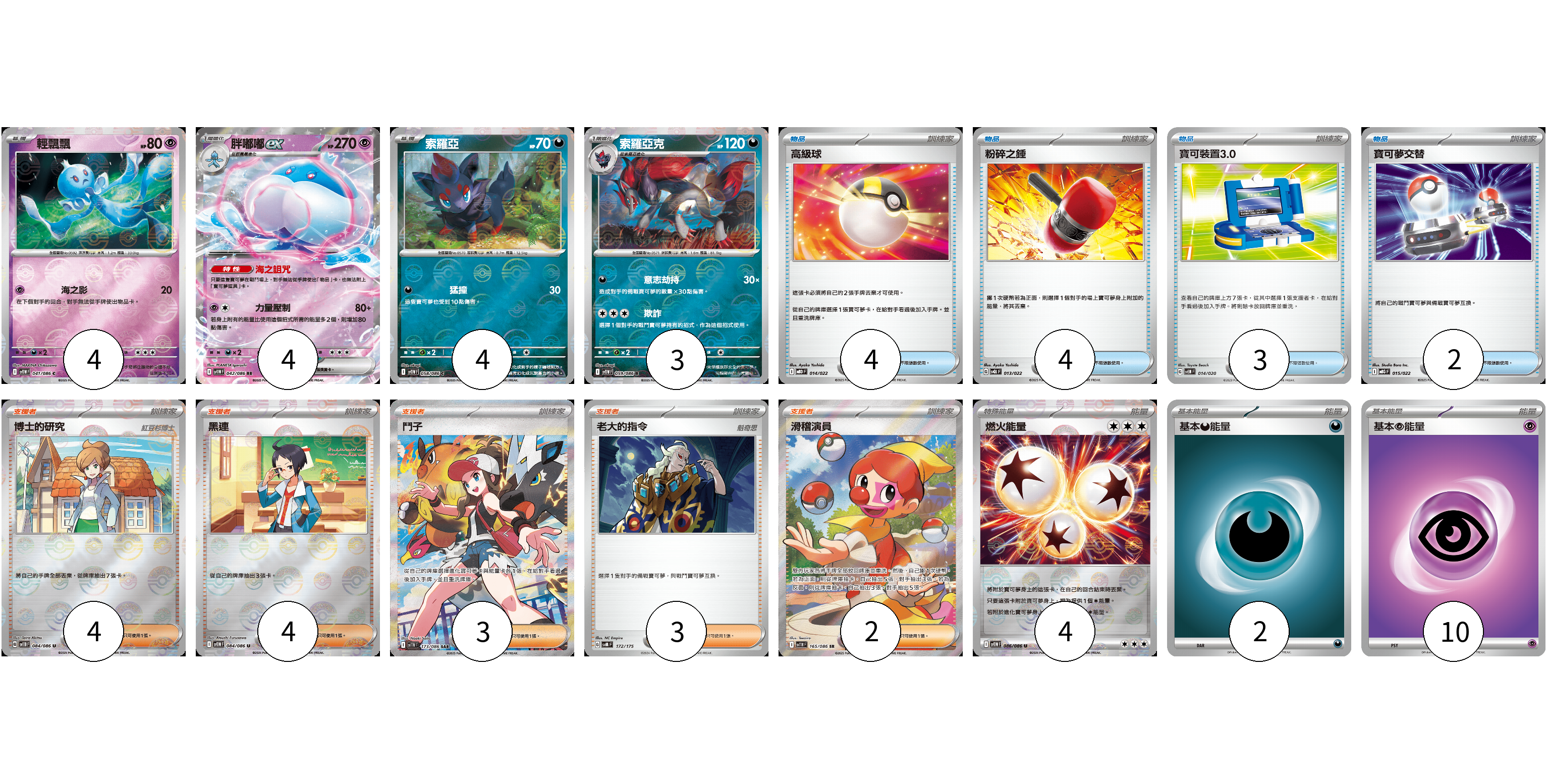 牌組構築方案 以此牌組為基礎新構築牌組 顯示卡面 顯示列表 寶可夢卡(15) 4 4 4 3 物品卡(13) 4 4 3 2 支援者卡(16) 4 4 3 3 2 能量卡(16) 4 2 10 寶可夢卡(15) 卡牌名稱 張數 卡牌名稱 張數 輕飄飄 SV11W 041/086 04 胖嘟嘟ex SV11W 042/086 04 索羅亞 SV11W 058/086 04 索羅亞克 SV11W 059/086 03 物品卡(13) 卡牌名稱 張數 卡牌名稱 張數 高級球 MBD 014/022 04 粉碎之錘 SVQL 013/022 04 寶可裝置3.0 SVEM 014/020 03 寶可夢交替 MBG 015/022 02 支援者卡(16) 卡牌名稱 張數 卡牌名稱 張數 博士的研究 SV11B 084/086 04 黑連 SV11W 084/086 04 鬥子 SV11W 173/086 03 老大的指令 SVM 172/175 03 滑稽演員 SV11W 165/086 02 能量卡(16) 卡牌名稱 張數 卡牌名稱 張數 燃火能量 SV11W 086/086 04 基本惡能量 sv-p DAR 02 基本超能量 sv-p PSY 10 以此牌組為基礎新構築牌組 牌組編碼 fQKeFi-gzHVSI-FbsIqZ copy 列印牌組單 牌組編碼已複製 分享至SNS