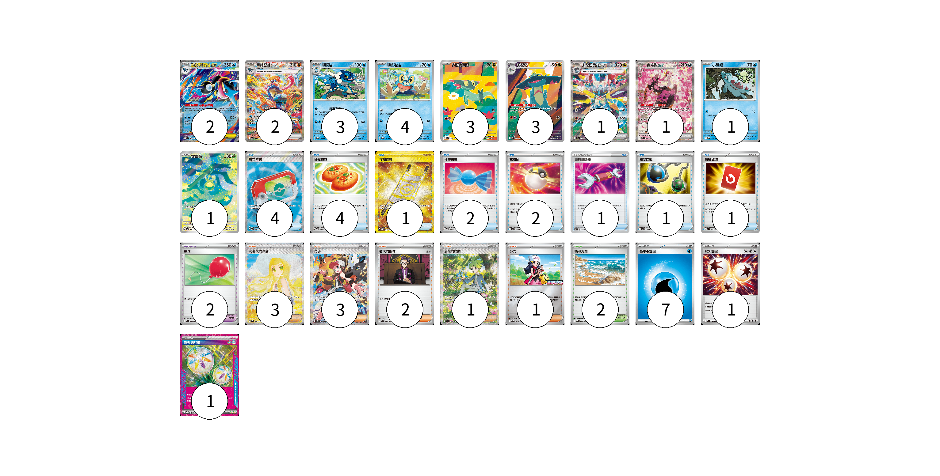 牌組構築方案 以此牌組為基礎新構築牌組 顯示卡面 顯示列表 寶可夢卡(21) 2 2 3 4 3 3 1 1 1 1 寶可夢道具(2) 2 物品卡(16) 4 4 1 2 2 1 1 1 支援者卡(10) 3 3 2 1 1 競技場卡(2) 2 能量卡(9) 7 1 1 寶可夢卡(21) 卡牌名稱 張數 卡牌名稱 張數 超級甲賀忍蛙ex M4 022/083 02 甲賀忍蛙ex SV5a 090/066 02 呱頭蛙 M4 021/083 03 呱呱泡蛙 M4 020/083 04 多龍梅西亞 M2a 211/193 03 多龍奇 M2a 212/193 03 多龍巴魯托ex SV8a 221/187 01 吉雉雞ex M2a 244/193 01 小鋸鱷 SV5K 013/071 01 含羞苞 M2a 196/193 01 寶可夢道具(2) 卡牌名稱 張數 卡牌名稱 張數 氣球 MC 688/742 02 物品卡(16) 卡牌名稱 張數 卡牌名稱 張數 寶可平板 M3 103/080 04 好友寶芬 MC 648/742 04 夜間擔架 SV8 137/106 01 神奇糖果 MC 655/742 02 高級球 MC 651/742 02 道具拆除器 S8b 138/184 01 能量回收 MC 636/742 01 特殊紅牌 M4 072/083 01 支援者卡(10) 卡牌名稱 張數 卡牌名稱 張數 莉莉艾的決意 M1L 091/063 03 鬥子 SV11W 173/086 03 老大的指令 MC 724/742 02 滿充的體貼 M1S 091/063 01 小光 M-P 028/M-P 01 競技場卡(2) 卡牌名稱 張數 卡牌名稱 張數 衝浪海灘 M1S 062/063 02 能量卡(9) 卡牌名稱 張數 卡牌名稱 張數 基本【水】能量 MC WAT 07 燃火能量 MC 736/742 01 新衝天能量 SV5K 071/071 01 以此牌組為基礎新構築牌組 牌組編碼 fQTviO-Bnqczo-xVNJVB copy 列印牌組單 牌組編碼已複製 分享至SNS