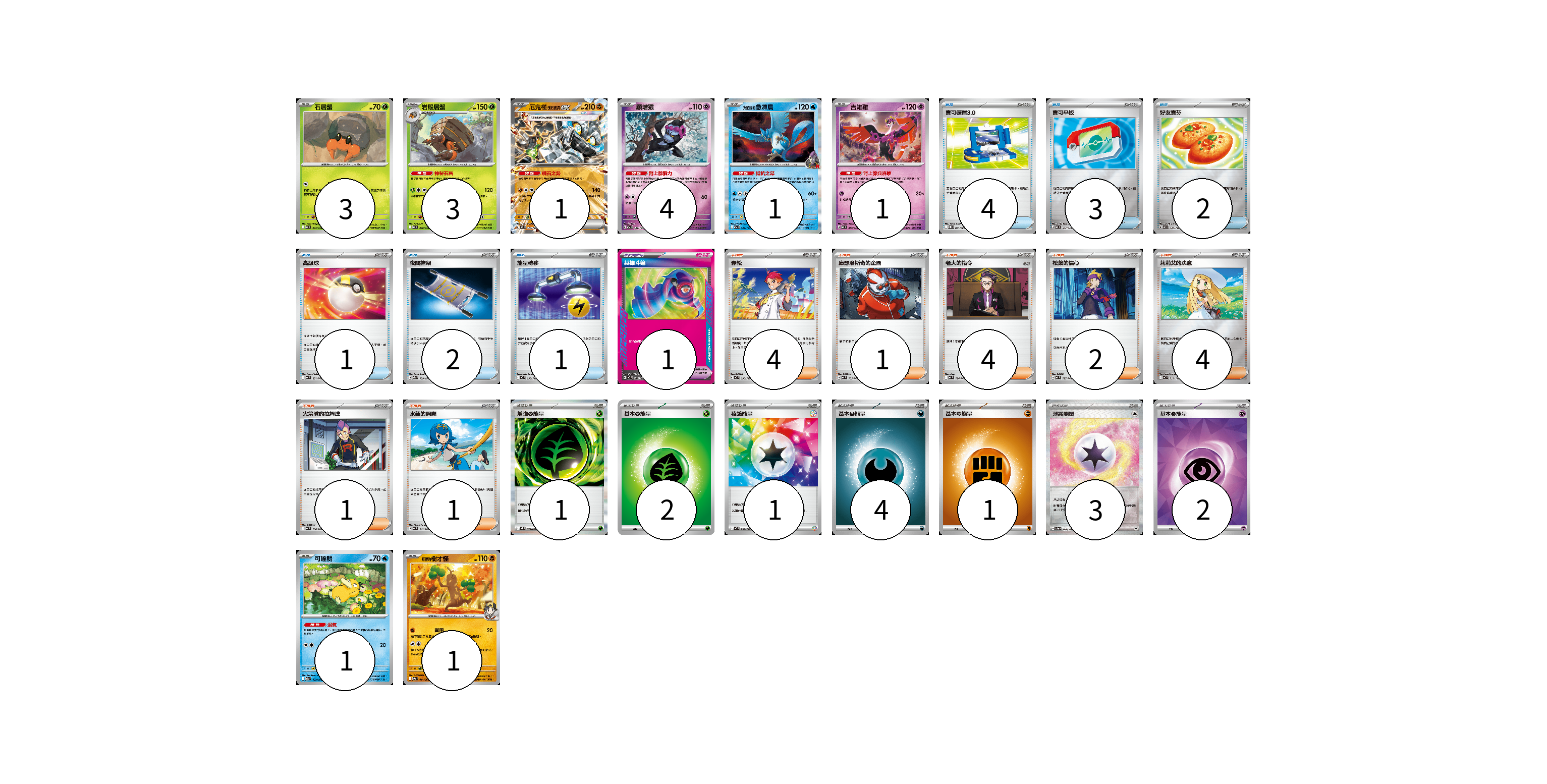牌組構築方案 以此牌組為基礎新構築牌組 顯示卡面 顯示列表 寶可夢卡(15) 3 3 1 4 1 1 1 1 寶可夢道具(1) 1 物品卡(13) 4 3 2 1 2 1 支援者卡(17) 4 1 4 2 4 1 1 能量卡(14) 1 2 1 4 1 3 2 寶可夢卡(15) 卡牌名稱 張數 卡牌名稱 張數 石居蟹 MC 045/742 03 岩殿居蟹 MC 046/742 03 厄鬼椪 礎石面具ex MC 428/742 01 願增猿 M2a 081/193 04 <火箭隊的>急凍鳥 M2a 034/193 01 吉雉雞 MC 359/742 01 可達鴨 M2a 032/193 01 <阿響的>樹才怪 SV9a 041/063 01 寶可夢道具(1) 卡牌名稱 張數 卡牌名稱 張數 英雄斗篷 MC 687/742 01 物品卡(13) 卡牌名稱 張數 卡牌名稱 張數 寶可裝置3.0 SV11B 081/086 04 寶可平板 MC 662/742 03 好友寶芬 MC 648/742 02 高級球 MC 651/742 01 夜間擔架 M2a 159/193 02 能量轉移 MC 638/742 01 支援者卡(17) 卡牌名稱 張數 卡牌名稱 張數 赤松 MC 696/742 04 庫瑟洛斯奇的企圖 MC 705/742 01 老大的指令 MC 724/742 04 松葉的信心 MC 727/742 02 莉莉艾的決意 MC 729/742 04 火箭隊的拉姆達 MC 734/742 01 水蓮的照顧 MC 712/742 01 能量卡(14) 卡牌名稱 張數 卡牌名稱 張數 增強【草】能量 M3 078/080 01 基本【草】能量 MJ GRA 02 稜鏡能量 MC 739/742 01 基本【惡】能量 MC DAR 04 基本【鬥】能量 MC FIG 01 薄霧能量 SV8a 186/187 03 基本【超】能量 SVOD PSY 02 以此牌組為基礎新構築牌組 牌組編碼 fTcmBs-ZmVBHj-LdoHfQ copy 列印牌組單 牌組編碼已複製 分享至SNS
