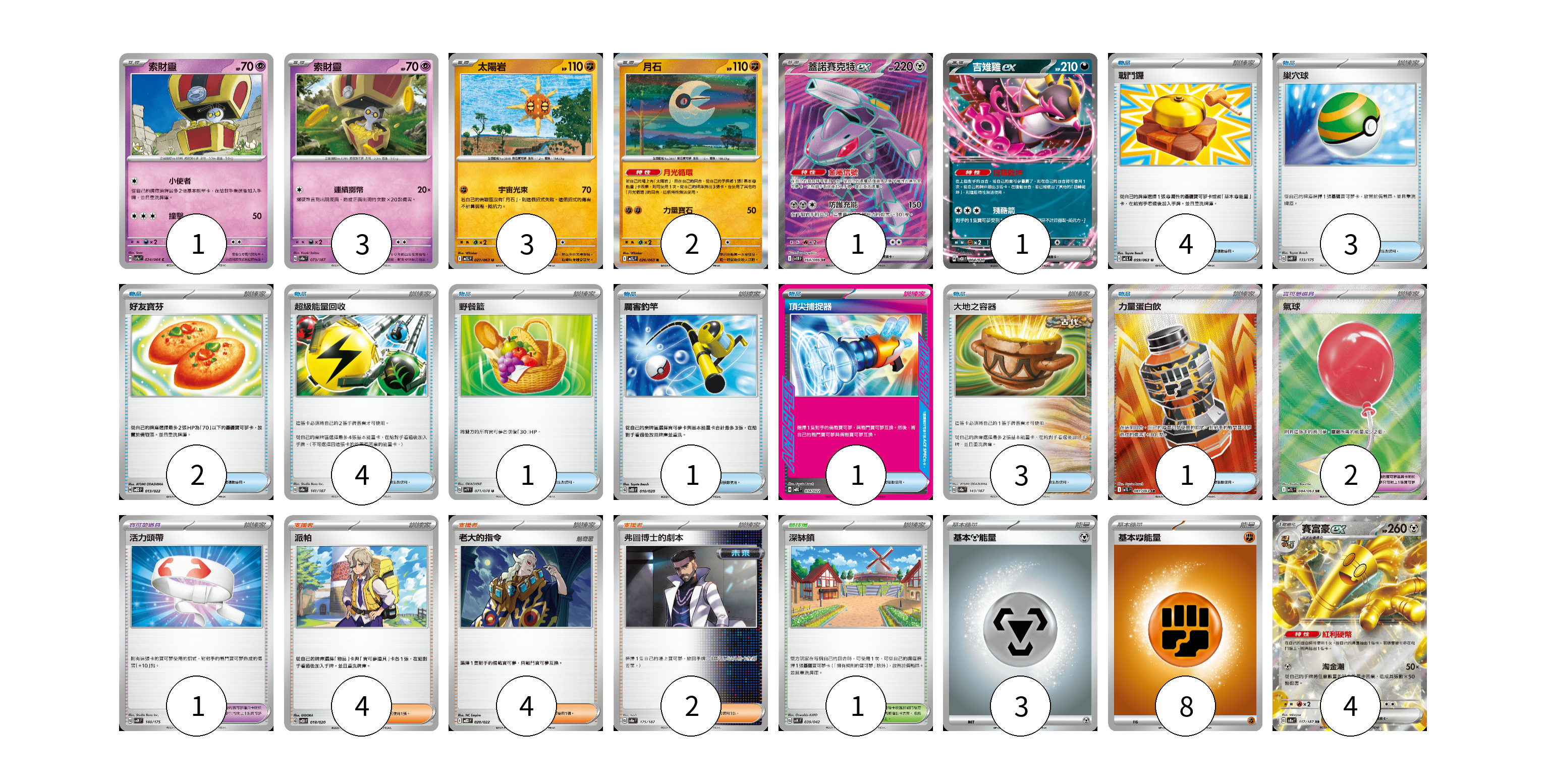 牌組構築方案 以此牌組為基礎新構築牌組 顯示卡面 顯示列表 寶可夢卡(15) 1 3 3 2 1 1 4 寶可夢道具(3) 2 1 物品卡(20) 4 3 2 4 1 1 1 3 1 支援者卡(10) 4 4 2 競技場卡(1) 1 能量卡(11) 3 8 寶可夢卡(15) 卡牌名稱 張數 卡牌名稱 張數 索財靈 SV7a 024/064 01 索財靈 SV8a 073/187 03 太陽岩 M1L 027/063 03 月石 M1L 026/063 02 蓋諾賽克特ex SV11B 164/086 01 吉雉雞ex SVOD 004/020 01 賽富豪ex SV8a 117/187 04 寶可夢道具(3) 卡牌名稱 張數 卡牌名稱 張數 氣球 M1L 084/063 02 活力頭帶 SVM 140/175 01 物品卡(20) 卡牌名稱 張數 卡牌名稱 張數 戰鬥鑼 M1L 059/063 04 巢穴球 SVM 133/175 03 好友寶芬 MBD 013/022 02 超級能量回收 SV8a 141/187 04 野餐籃 SV1V 071/078 01 厲害釣竿 SVOD 010/020 01 頂尖捕捉器 MBG 014/022 01 大地之容器 SV8a 143/187 03 力量蛋白飲 M1L 081/063 01 支援者卡(10) 卡牌名稱 張數 卡牌名稱 張數 派帕 SVOD 018/020 04 老大的指令 MBD 020/022 04 弗圖博士的劇本 SV8a 175/187 02 競技場卡(1) 卡牌名稱 張數 卡牌名稱 張數 深缽鎮 SVK 039/042 01 能量卡(11) 卡牌名稱 張數 卡牌名稱 張數 基本【鋼】能量 M-P MET 03 基本【鬥】能量 M-P FIG 08 以此牌組為基礎新構築牌組 牌組編碼 fTrSpR-InVWxZ-UqOuXC copy 列印牌組單 牌組編碼已複製 分享至SNS