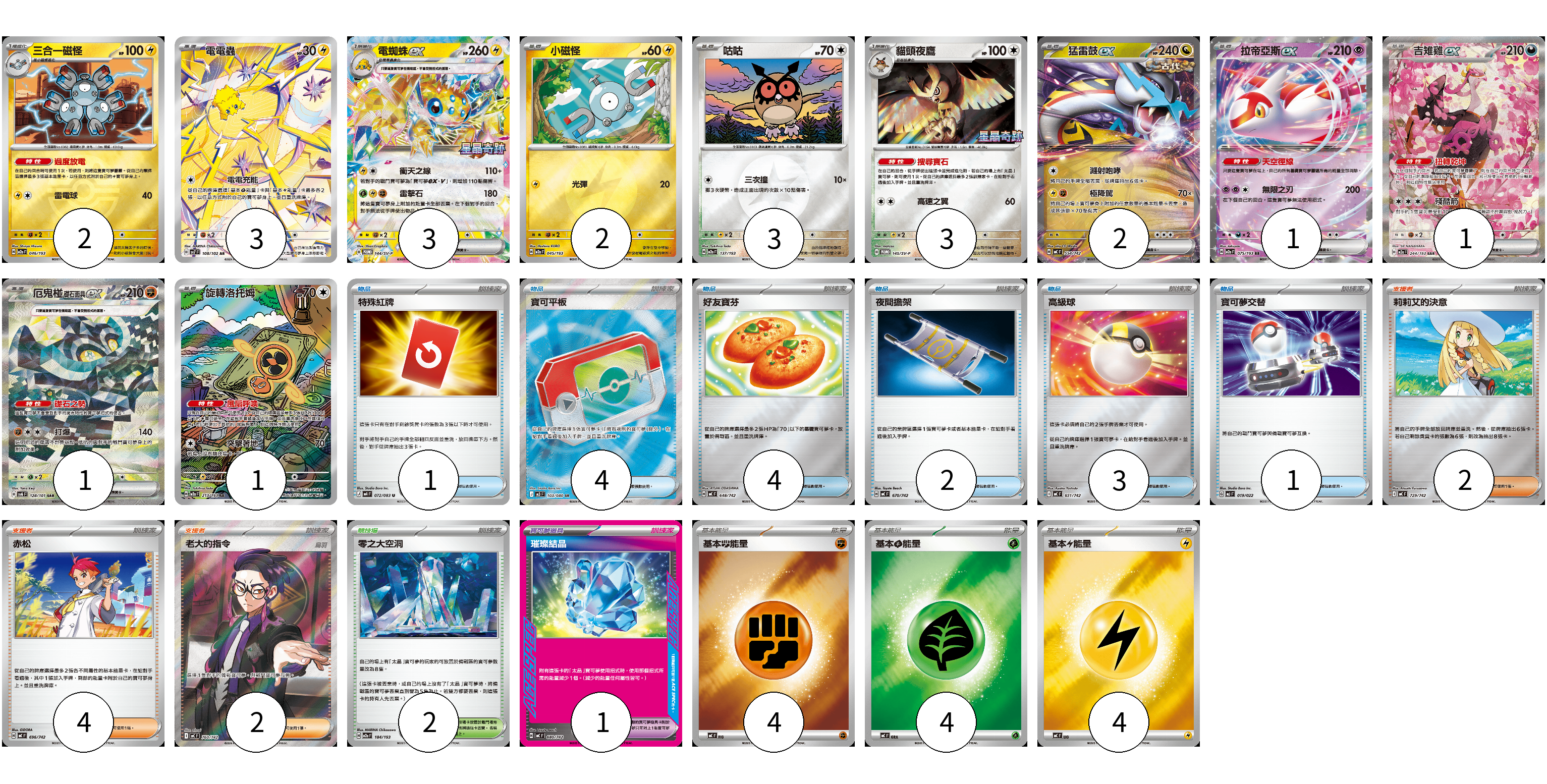 牌組構築方案 以此牌組為基礎新構築牌組 顯示卡面 顯示列表 寶可夢卡(22) 2 3 3 2 3 3 2 1 1 1 1 寶可夢道具(1) 1 物品卡(15) 1 4 4 2 3 1 支援者卡(8) 2 4 2 競技場卡(2) 2 能量卡(12) 4 4 4 寶可夢卡(22) 卡牌名稱 張數 卡牌名稱 張數 三合一磁怪 M2a 046/193 02 電電蟲 SV7 108/102 03 電蜘蛛ex SV-P 144/SV-P 03 小磁怪 M2a 045/193 02 咕咕 M2a 137/193 03 貓頭夜鷹 SV-P 145/SV-P 03 猛雷鼓ex MC 554/742 02 拉帝亞斯ex M2a 075/193 01 吉雉雞ex M2a 244/193 01 厄鬼椪 礎石面具ex SV6 128/101 01 旋轉洛托姆 M2a 213/193 01 寶可夢道具(1) 卡牌名稱 張數 卡牌名稱 張數 璀璨結晶 MC 680/742 01 物品卡(15) 卡牌名稱 張數 卡牌名稱 張數 特殊紅牌 M4 072/083 01 寶可平板 M3 103/080 04 好友寶芬 MC 648/742 04 夜間擔架 MC 670/742 02 高級球 MC 651/742 03 寶可夢交替 MJ 019/022 01 支援者卡(8) 卡牌名稱 張數 卡牌名稱 張數 莉莉艾的決意 MC 729/742 02 赤松 MC 696/742 04 老大的指令(烏羽) MC 760/742 02 競技場卡(2) 卡牌名稱 張數 卡牌名稱 張數 零之大空洞 M2a 184/193 02 能量卡(12) 卡牌名稱 張數 卡牌名稱 張數 基本【鬥】能量 MC FIG 04 基本【草】能量 MC GRA 04 基本【雷】能量 MC LIG 04 以此牌組為基礎新構築牌組 牌組編碼 fTydkx-PBuMcn-rToEsZ copy 列印牌組單 牌組編碼已複製 分享至SNS