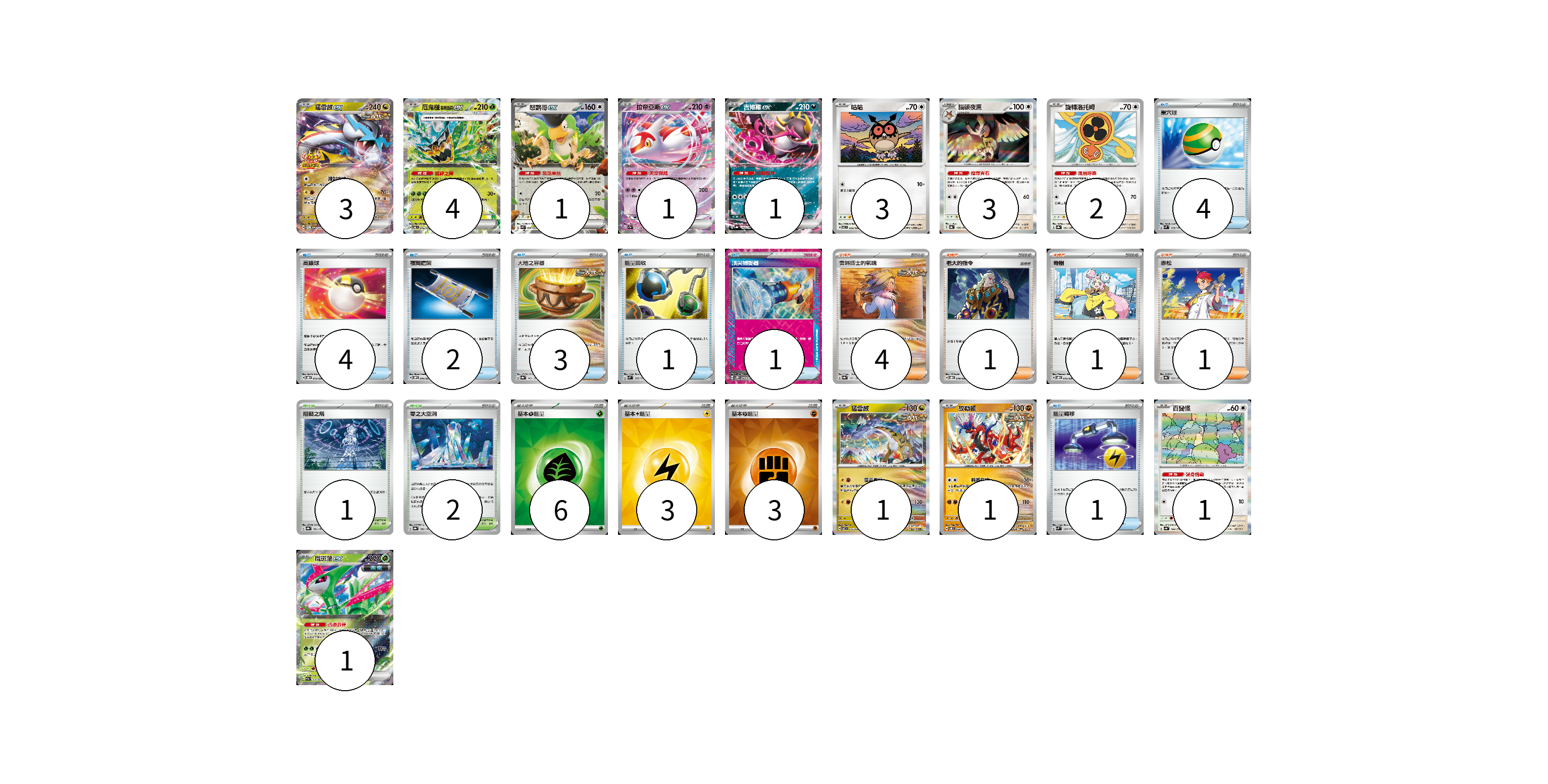 牌組構築方案 以此牌組為基礎新構築牌組 顯示卡面 顯示列表 寶可夢卡(22) 3 4 1 1 1 3 3 2 1 1 1 1 物品卡(16) 4 4 2 3 1 1 1 支援者卡(7) 4 1 1 1 競技場卡(3) 1 2 能量卡(12) 6 3 3 寶可夢卡(22) 卡牌名稱 張數 卡牌名稱 張數 猛雷鼓ex SV-P 081/SV-P 03 厄鬼椪 碧草面具ex SV6 016/101 04 怒鸚哥ex SVK 006/042 01 拉帝亞斯ex SV7a 019/064 01 吉雉雞ex SV8a 104/187 01 咕咕 SV7 076/102 03 貓頭夜鷹 SV8a 128/187 03 旋轉洛托姆 SV8a 131/187 02 猛雷鼓 SV7 075/102 01 故勒頓 SV8 069/106 01 百變怪 SV4a 144/190 01 鐵斑葉ex SV5M 016/071 01 物品卡(16) 卡牌名稱 張數 卡牌名稱 張數 巢穴球 SVM 133/175 04 高級球 SVOD 012/020 04 夜間擔架 SVOM 016/021 02 大地之容器 SV8a 143/187 03 能量回收 SVM 125/175 01 頂尖捕捉器 SV5M 062/071 01 能量轉移 SVM 127/175 01 支援者卡(7) 卡牌名稱 張數 卡牌名稱 張數 奧琳博士的氣魄 SV8a 167/187 04 老大的指令 SVOD 019/020 01 奇樹 SVOD 016/020 01 赤松 SV8a 163/187 01 競技場卡(3) 卡牌名稱 張數 卡牌名稱 張數 阻礙之塔 SV8a 181/187 01 零之大空洞 SV8a 182/187 02 能量卡(12) 卡牌名稱 張數 卡牌名稱 張數 基本【草】能量 SVM GRA 06 基本【雷】能量 SVM LIG 03 基本【鬥】能量 SVM FIG 03 以此牌組為基礎新構築牌組 牌組編碼 fVoBul-ZpnbJD-SsXhzR copy 列印牌組單 牌組編碼已複製 分享至SNS