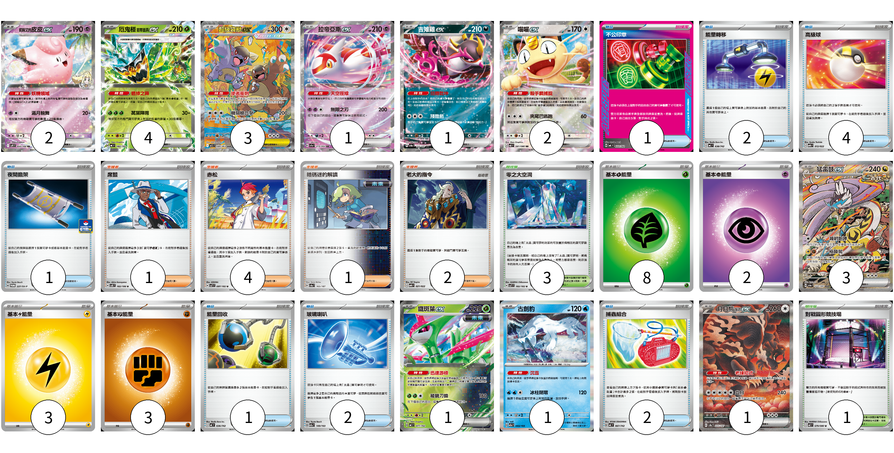 牌組構築方案 以此牌組為基礎新構築牌組 顯示卡面 顯示列表 寶可夢卡(19) 2 4 3 1 1 2 3 1 1 1 物品卡(13) 1 2 4 1 1 2 2 支援者卡(8) 1 4 1 2 競技場卡(4) 3 1 能量卡(16) 8 2 3 3 寶可夢卡(19) 卡牌名稱 張數 卡牌名稱 張數 莉莉艾的皮皮ex SV9 033/100 02 厄鬼椪 碧草面具ex MC 082/742 04 超級袋獸ex M1S 089/063 03 拉帝亞斯ex SV7a 019/064 01 吉雉雞ex SV8a 104/187 01 喵喵ex M3 061/080 02 猛雷鼓ex SV8a 222/187 03 鐵斑葉ex MC 077/742 01 古劍豹 M2a 043/193 01 月月熊 赫月ex SV8a 225/187 01 物品卡(13) 卡牌名稱 張數 卡牌名稱 張數 不公印章 MC 633/742 01 能量轉移 MC 638/742 02 高級球 MBG 012/022 04 夜間擔架 SV-P 227/SV-P 01 能量回收 MC 636/742 01 玻璃喇叭 M2a 149/193 02 捕蟲組合 MC 667/742 02 支援者卡(8) 卡牌名稱 張數 卡牌名稱 張數 席藍 SV8 102/106 01 赤松 SV7 097/102 04 暗碼迷的解讀 SV8a 165/187 01 老大的指令 MBG 021/022 02 競技場卡(4) 卡牌名稱 張數 卡牌名稱 張數 零之大空洞 SV7 102/102 03 對戰圓形競技場 M2 079/080 01 能量卡(16) 卡牌名稱 張數 卡牌名稱 張數 基本【草】能量 MJ GRA 08 基本【超】能量 M-P PSY 02 基本【雷】能量 MJ LIG 03 基本【鬥】能量 MC FIG 03 以此牌組為基礎新構築牌組 牌組編碼 fXwThP-slOcak-dnTFnD copy 列印牌組單 牌組編碼已複製 分享至SNS
