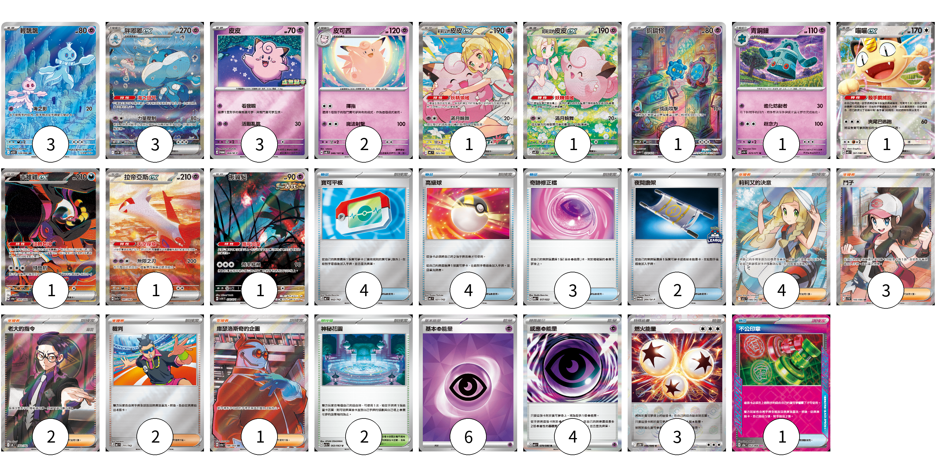 牌組構築方案 以此牌組為基礎新構築牌組 顯示卡面 顯示列表 寶可夢卡(19) 3 3 3 2 1 1 1 1 1 1 1 1 物品卡(14) 4 4 3 2 1 支援者卡(12) 4 3 2 2 1 競技場卡(2) 2 能量卡(13) 6 4 3 寶可夢卡(19) 卡牌名稱 張數 卡牌名稱 張數 輕飄飄 SV11W 124/086 03 胖嘟嘟ex SV11W 170/086 03 皮皮 M-P 068/M-P 03 皮可西 SV6 046/101 02 莉莉艾的皮皮ex MC 765/742 01 莉莉艾的皮皮ex SV9 126/100 01 銅鏡怪 SV5K 074/071 01 青銅鐘 SV5K 029/071 01 喵喵ex M3 061/080 01 吉雉雞ex SV6a 089/064 01 拉帝亞斯ex SV7a 087/064 01 振翼髮 SV5K 076/071 01 物品卡(14) 卡牌名稱 張數 卡牌名稱 張數 寶可平板 MC 662/742 04 高級球 MC 651/742 04 奇跡修正檔 MBD 017/022 03 夜間擔架 SV-P 204/SV-P 02 不公印章 SV5a 053/066 01 支援者卡(12) 卡牌名稱 張數 卡牌名稱 張數 莉莉艾的決意 M1L 086/063 04 鬥子 SV11W 166/086 03 老大的指令(烏羽) MC 760/742 02 裁判 MC 711/742 02 庫瑟洛斯奇的企圖 SV6a 086/064 01 競技場卡(2) 卡牌名稱 張數 卡牌名稱 張數 神秘花園 M1S 063/063 02 能量卡(13) 卡牌名稱 張數 卡牌名稱 張數 基本【超】能量 SVOD PSY 06 感應【超】能量 M3 079/080 04 燃火能量 SV11W 086/086 03 以此牌組為基礎新構築牌組 牌組編碼 fbcZIn-KNYMzB-hYmPAt copy 列印牌組單 牌組編碼已複製 分享至SNS