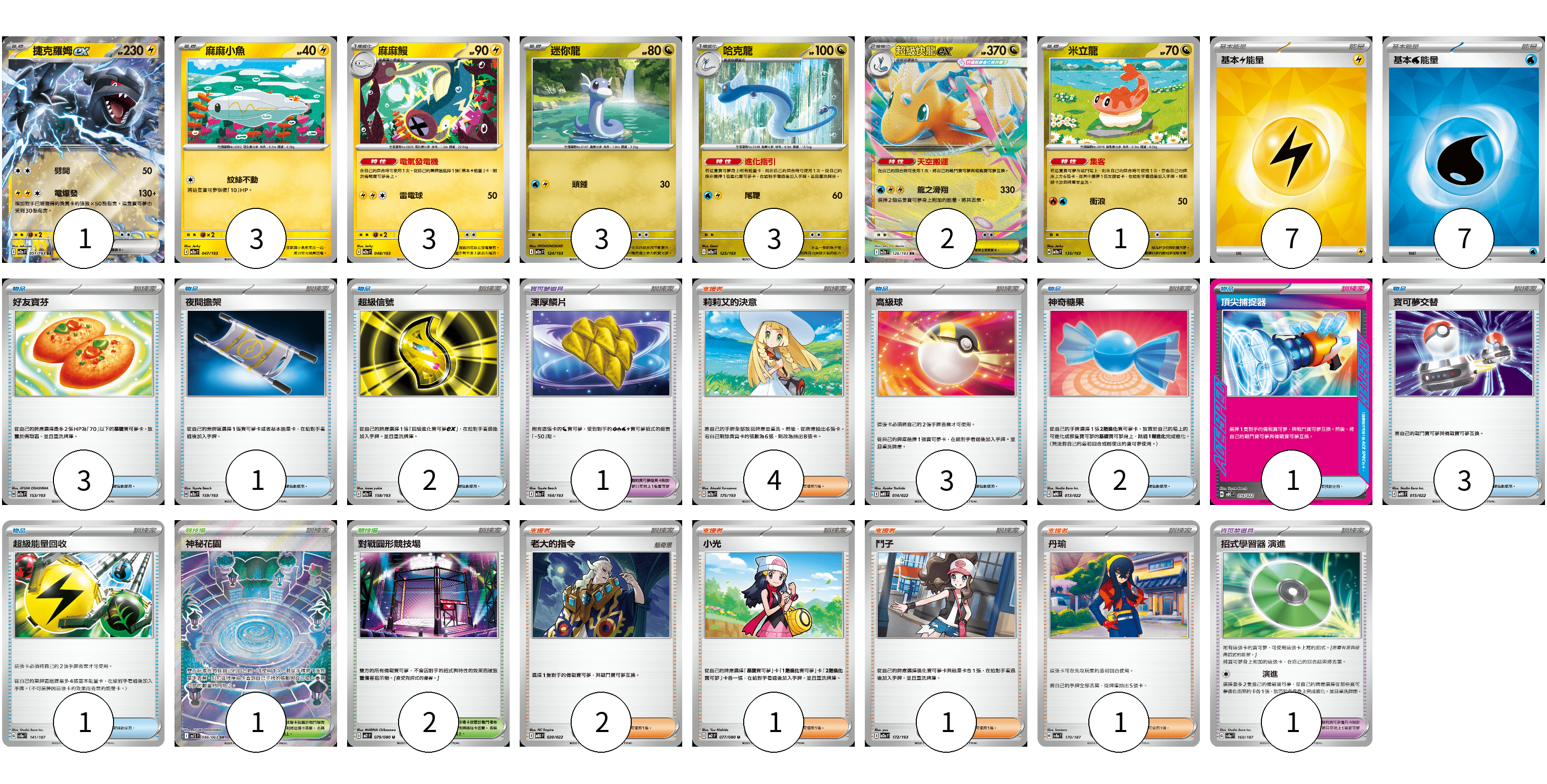牌組構築方案 以此牌組為基礎新構築牌組 顯示卡面 顯示列表 寶可夢卡(16) 1 3 3 3 3 2 1 寶可夢道具(2) 1 1 物品卡(16) 3 1 2 3 2 1 3 1 支援者卡(9) 4 2 1 1 1 競技場卡(3) 1 2 能量卡(14) 7 7 寶可夢卡(16) 卡牌名稱 張數 卡牌名稱 張數 捷克羅姆ex M2a 051/193 01 麻麻小魚 M2a 047/193 03 麻麻鰻 M2a 048/193 03 迷你龍 M2a 124/193 03 哈克龍 M2a 125/193 03 超級快龍ex M2a 126/193 02 米立龍 M2a 135/193 01 寶可夢道具(2) 卡牌名稱 張數 卡牌名稱 張數 渾厚鱗片 M2a 164/193 01 招式學習器 演進 SV8a 160/187 01 物品卡(16) 卡牌名稱 張數 卡牌名稱 張數 好友寶芬 M2a 153/193 03 夜間擔架 M2a 159/193 01 超級信號 M2a 158/193 02 高級球 MBD 014/022 03 神奇糖果 MBG 013/022 02 頂尖捕捉器 MBG 014/022 01 寶可夢交替 MBG 015/022 03 超級能量回收 SV8a 141/187 01 支援者卡(9) 卡牌名稱 張數 卡牌名稱 張數 莉莉艾的決意 M2a 175/193 04 老大的指令 MBD 020/022 02 小光 M2 077/080 01 鬥子 M2a 172/193 01 丹瑜 SV8a 170/187 01 競技場卡(3) 卡牌名稱 張數 卡牌名稱 張數 神秘花園 M1S 086/063 01 對戰圓形競技場 M2 079/080 02 能量卡(14) 卡牌名稱 張數 卡牌名稱 張數 基本【雷】能量 SVM LIG 07 基本【水】能量 SVM WAT 07 以此牌組為基礎新構築牌組 牌組編碼 fePeuU-YQJdwa-iQPPNo copy 列印牌組單 牌組編碼已複製 分享至SNS