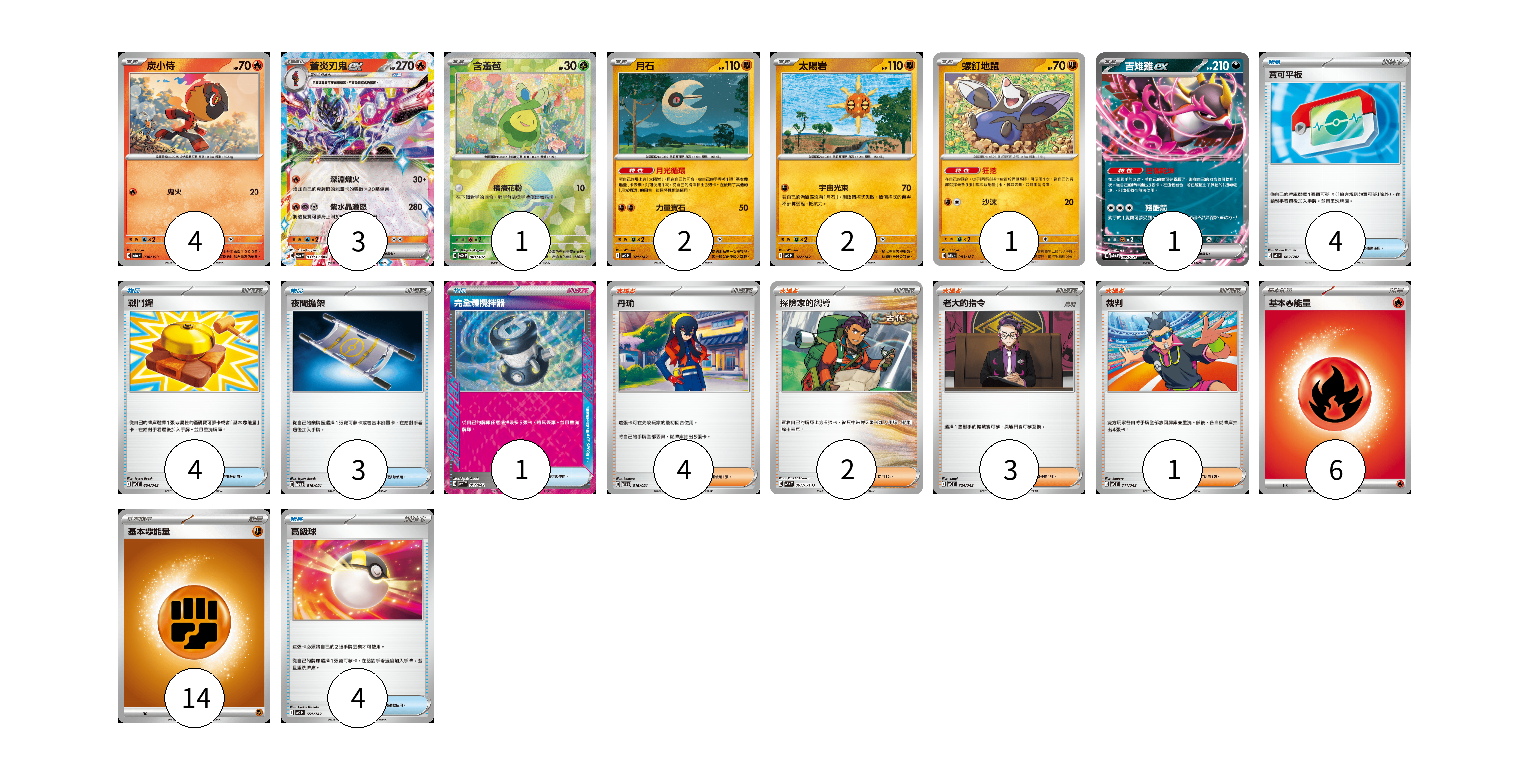牌組構築方案 以此牌組為基礎新構築牌組 顯示卡面 顯示列表 寶可夢卡(14) 4 3 1 2 2 1 1 物品卡(16) 4 4 3 1 4 支援者卡(10) 4 2 3 1 能量卡(20) 6 14 寶可夢卡(14) 卡牌名稱 張數 卡牌名稱 張數 炭小侍 M2a 030/193 04 蒼炎刃鬼ex M2a 031/193 03 含羞苞 SV8a 001/187 01 月石 MC 371/742 02 太陽岩 MC 372/742 02 螺釘地鼠 SV8a 083/187 01 吉雉雞ex SVOM 009/021 01 物品卡(16) 卡牌名稱 張數 卡牌名稱 張數 寶可平板 MC 662/742 04 戰鬥鑼 MC 654/742 04 夜間擔架 SVOM 016/021 03 完全體攪拌器 SVK 017/042 01 高級球 MC 651/742 04 支援者卡(10) 卡牌名稱 張數 卡牌名稱 張數 丹瑜 SVTR 016/021 04 探險家的嚮導 SV5K 067/071 02 老大的指令 MC 724/742 03 裁判 MC 711/742 01 能量卡(20) 卡牌名稱 張數 卡牌名稱 張數 基本【火】能量 MC FIR 06 基本【鬥】能量 MC FIG 14 以此牌組為基礎新構築牌組 牌組編碼 fepDtR-DcVXSN-mviSlV copy 列印牌組單 牌組編碼已複製 分享至SNS