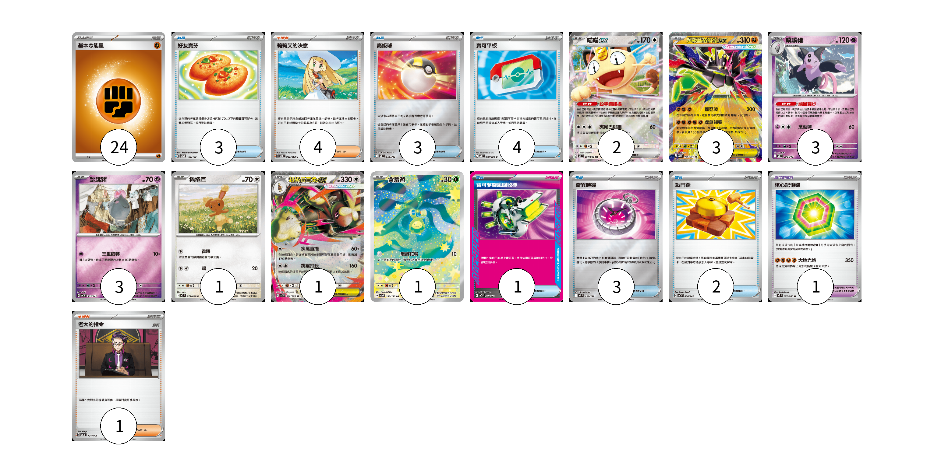 牌組構築方案 以此牌組為基礎新構築牌組 顯示卡面 顯示列表 寶可夢卡(14) 2 3 3 3 1 1 1 寶可夢道具(1) 1 物品卡(16) 3 3 4 1 3 2 支援者卡(5) 4 1 能量卡(24) 24 寶可夢卡(14) 卡牌名稱 張數 卡牌名稱 張數 喵喵ex M3 061/080 02 超級基格爾德ex M3 046/080 03 噗噗豬 MC 306/742 03 跳跳豬 MC 305/742 03 捲捲耳 M2 071/080 01 超級長耳兔ex M2 072/080 01 含羞苞 M2a 196/193 01 寶可夢道具(1) 卡牌名稱 張數 卡牌名稱 張數 核心記憶碟 M3 072/080 01 物品卡(16) 卡牌名稱 張數 卡牌名稱 張數 好友寶芬 M2a 153/193 03 高級球 MC 651/742 03 寶可平板 M3 070/080 04 寶可夢旋風回收機 MC 664/742 01 奇異時鐘 MC 632/742 03 戰鬥鑼 MC 654/742 02 支援者卡(5) 卡牌名稱 張數 卡牌名稱 張數 莉莉艾的決意 M1L 062/063 04 老大的指令 MC 724/742 01 能量卡(24) 卡牌名稱 張數 卡牌名稱 張數 基本【鬥】能量 M-P FIG 24 以此牌組為基礎新構築牌組 牌組編碼 fhnfHA-gRZOZz-aIlXDo copy 列印牌組單 牌組編碼已複製 分享至SNS