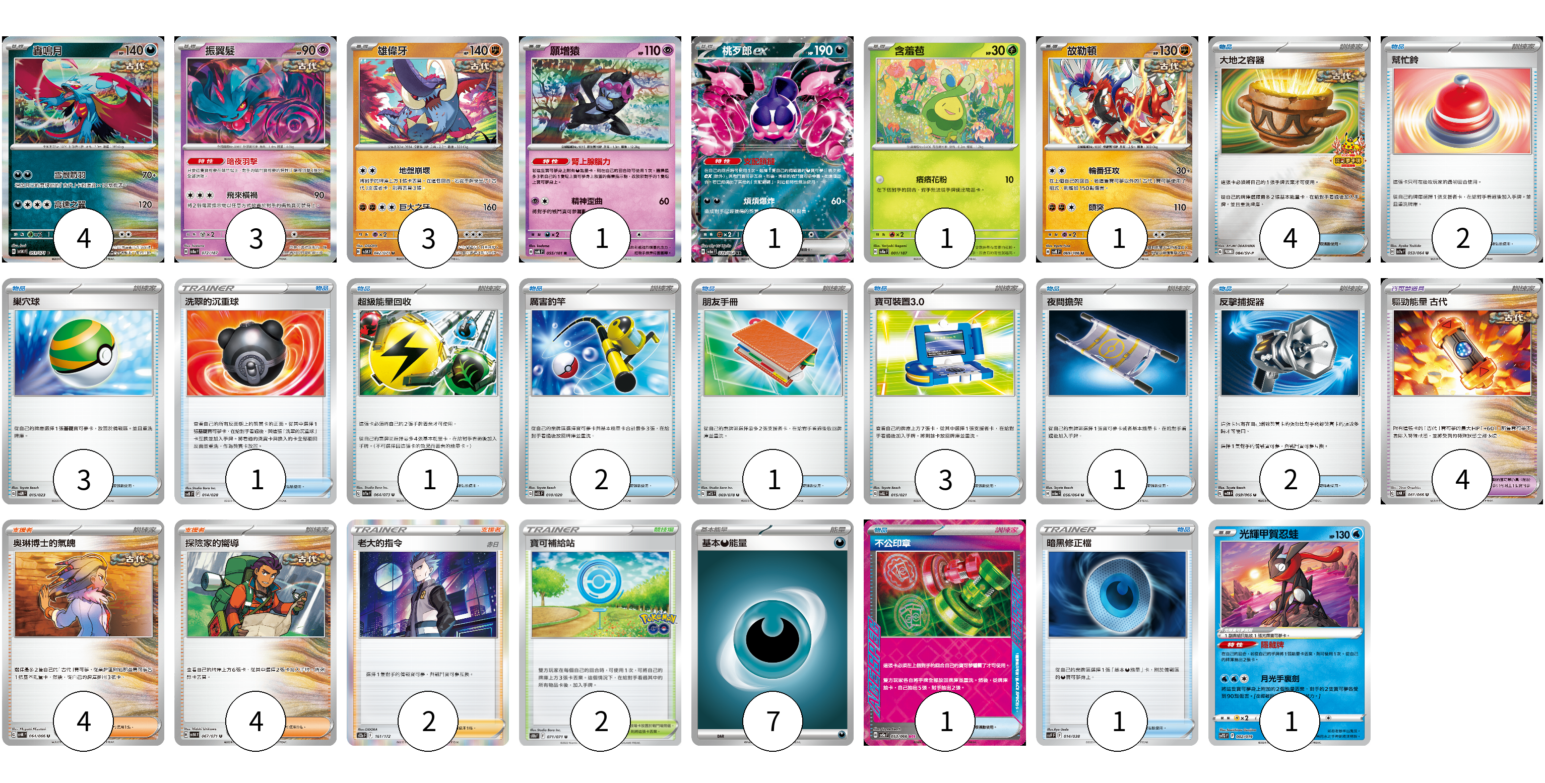 牌組構築方案 以此牌組為基礎新構築牌組 顯示卡面 顯示列表 寶可夢卡(17) 4 3 3 1 1 1 1 2 1 寶可夢道具(4) 4 物品卡(20) 4 2 3 1 1 1 3 1 2 1 1 支援者卡(10) 4 4 2 競技場卡(2) 2 能量卡(7) 7 寶可夢卡(17) 卡牌名稱 張數 卡牌名稱 張數 轟鳴月 SV5K 051/071 04 振翼髮 SV8a 072/187 03 雄偉牙 SV5K 042/071 03 願增猿 SV6 055/101 01 桃歹郎ex SV6a 039/064 01 含羞苞 SV8a 001/187 01 故勒頓 SV8 069/106 01 厲害釣竿 SVEL 010/020 02 光輝甲賀忍蛙 SVTG 002/019 01 寶可夢道具(4) 卡牌名稱 張數 卡牌名稱 張數 驅勁能量 古代 SV4K 061/066 04 物品卡(20) 卡牌名稱 張數 卡牌名稱 張數 大地之容器 SV-P 084/SV-P 04 幫忙鈴 SV7a 053/064 02 巢穴球 SVAM 015/023 03 洗翠的沉重球 SVB 014/028 01 超級能量回收 SV1a 064/073 01 朋友手冊 SV1S 069/078 01 寶可裝置3.0 SVAL 015/021 03 夜間擔架 SV6a 056/064 01 反擊捕捉器 SV4M 059/066 02 不公印章 SV5a 053/066 01 暗黑修正檔 SVF 014/038 01 支援者卡(10) 卡牌名稱 張數 卡牌名稱 張數 奧琳博士的氣魄 SV4K 064/066 04 探險家的嚮導 SV5K 067/071 04 老大的指令(赤日) S12a 161/172 02 競技場卡(2) 卡牌名稱 張數 卡牌名稱 張數 寶可補給站 S10b 071/071 02 能量卡(7) 卡牌名稱 張數 卡牌名稱 張數 基本【惡】能量 SVF DAR 07 以此牌組為基礎新構築牌組 牌組編碼 fiCTyP-uAZIDS-KTRJrD copy 列印牌組單 牌組編碼已複製 分享至SNS
