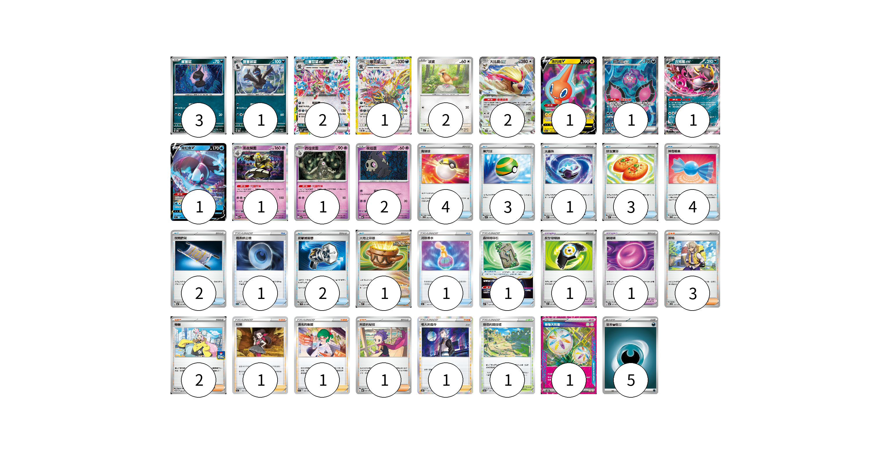 牌組構築方案 以此牌組為基礎新構築牌組 顯示卡面 顯示列表 寶可夢卡(19) 3 1 2 1 2 2 1 1 1 1 1 1 2 寶可夢道具(2) 1 1 物品卡(23) 4 3 1 3 4 2 1 2 1 1 1 支援者卡(9) 3 2 1 1 1 1 競技場卡(1) 1 能量卡(6) 1 5 寶可夢卡(19) 卡牌名稱 張數 卡牌名稱 張數 單首龍 SV8 070/106 03 雙首暴龍 SV8 071/106 01 三首惡龍ex SV8 072/106 02 三首惡龍ex SV8 124/106 01 波波 SV3 087/108 02 大比鳥ex SV3 089/108 02 洛托姆V S11 037/100 01 桃歹郎ex SV6a 082/064 01 吉雉雞ex SV6a 038/064 01 霓虹魚V S9 030/100 01 黑夜魔靈 SV6a 020/064 01 彷徨夜靈 SV6a 019/064 01 夜巡靈 SV6a 018/064 02 寶可夢道具(2) 卡牌名稱 張數 卡牌名稱 張數 反擊增幅器 SV7a 059/064 01 鎖鏈糬 SV6a 057/064 01 物品卡(23) 卡牌名稱 張數 卡牌名稱 張數 高級球 SVB 002/028 04 巢穴球 SV1S 070/078 03 太晶珠 SVK 013/042 01 好友寶芬 SVK 015/042 03 神奇糖果 SVB 003/028 04 夜間擔架 SV6a 056/064 02 暗黑修正檔 SLD 012/020 01 反擊捕捉器 SV4M 059/066 02 大地之容器 SVK 012/042 01 消除香水 S9a 063/067 01 森林封印石 SVF 024/038 01 支援者卡(9) 卡牌名稱 張數 卡牌名稱 張數 派帕 SVD 137/139 03 奇樹 SV-P 106/SV-P 02 杜娟 S9a 065/067 01 濱名的後援 S9 096/100 01 阿杏的秘招 SV6a 060/064 01 老大的指令(赤日) S12a 161/172 01 競技場卡(1) 卡牌名稱 張數 卡牌名稱 張數 崩塌的競技場 S12a 167/172 01 能量卡(6) 卡牌名稱 張數 卡牌名稱 張數 新衝天能量 SV5K 071/071 01 基本惡能量 sv-p DAR 05 以此牌組為基礎新構築牌組 牌組編碼 fjwSAj-QEBCNB-FlbgxC copy 列印牌組單 牌組編碼已複製 分享至SNS