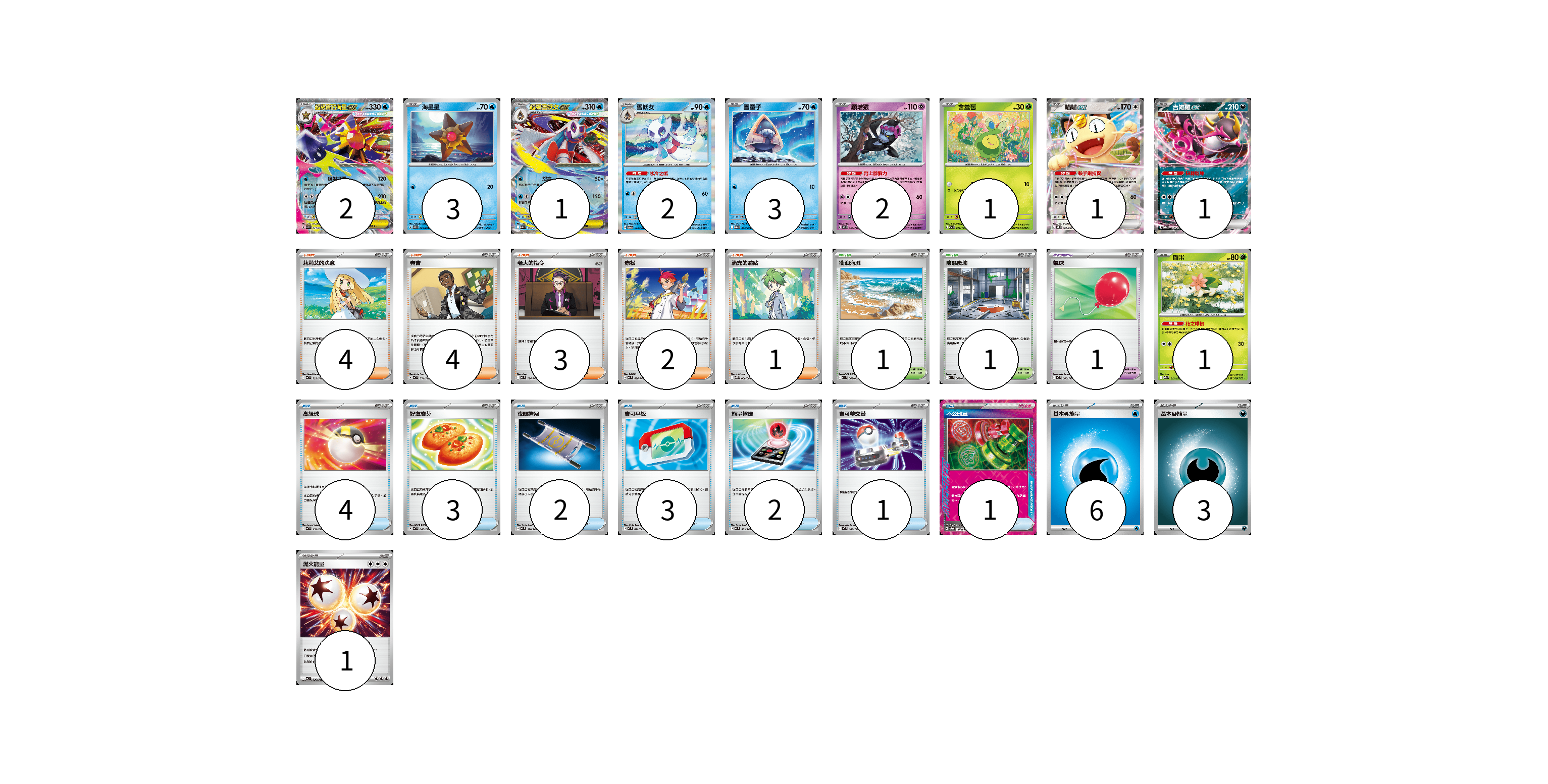牌組構築方案 以此牌組為基礎新構築牌組 顯示卡面 顯示列表 寶可夢卡(17) 2 3 1 2 3 2 1 1 1 1 寶可夢道具(1) 1 物品卡(16) 4 3 2 3 2 1 1 支援者卡(14) 4 4 3 2 1 競技場卡(2) 1 1 能量卡(10) 6 3 1 寶可夢卡(17) 卡牌名稱 張數 卡牌名稱 張數 超級寶石海星ex M3 021/080 02 海星星 M3 020/080 03 超級雪妖女ex M2a 036/193 01 雪妖女 SV6 033/101 02 雪童子 M2a 035/193 03 願增猿 MC 358/742 02 含羞苞 M2a 011/193 01 喵喵ex M3 061/080 01 吉雉雞ex M2a 114/193 01 謝米 M2a 012/193 01 寶可夢道具(1) 卡牌名稱 張數 卡牌名稱 張數 氣球 MC 688/742 01 物品卡(16) 卡牌名稱 張數 卡牌名稱 張數 高級球 MC 651/742 04 好友寶芬 MC 648/742 03 夜間擔架 MC 670/742 02 寶可平板 M3 070/080 03 能量輸送 MC 639/742 02 寶可夢交替 MC 663/742 01 不公印章 SV5a 053/066 01 支援者卡(14) 卡牌名稱 張數 卡牌名稱 張數 莉莉艾的決意 MC 729/742 04 賽吉 MC 714/742 04 老大的指令 MC 724/742 03 赤松 MC 696/742 02 滿充的體貼 M1S 060/063 01 競技場卡(2) 卡牌名稱 張數 卡牌名稱 張數 衝浪海灘 M1S 062/063 01 險惡廢墟 M1L 063/063 01 能量卡(10) 卡牌名稱 張數 卡牌名稱 張數 基本【水】能量 MC WAT 06 基本【惡】能量 MC DAR 03 燃火能量 MC 736/742 01 以此牌組為基礎新構築牌組 牌組編碼 fkXiaM-bmKaut-QuhUwZ copy 列印牌組單 牌組編碼已複製 分享至SNS