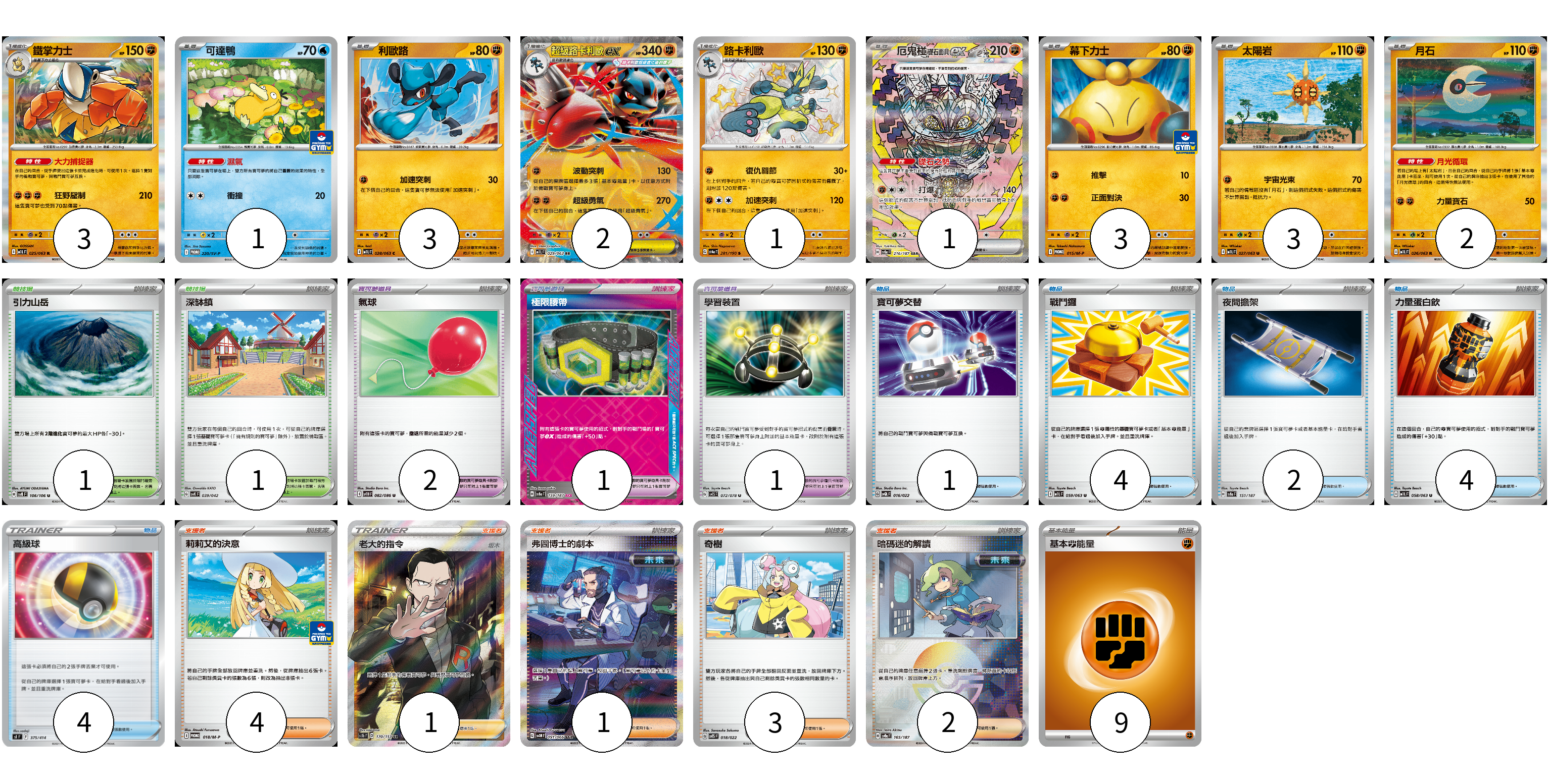 牌組構築方案 以此牌組為基礎新構築牌組 顯示卡面 顯示列表 寶可夢卡(19) 3 1 3 2 1 1 3 3 2 寶可夢道具(4) 2 1 1 物品卡(15) 1 4 2 4 4 支援者卡(11) 4 1 1 3 2 競技場卡(2) 1 1 能量卡(9) 9 寶可夢卡(19) 卡牌名稱 張數 卡牌名稱 張數 鐵掌力士 M1L 025/063 03 可達鴨 SV-P 220/SV-P 01 利歐路 M1L 028/063 03 超級路卡利歐ex M1L 029/063 02 路卡利歐 SV4a 281/190 01 厄鬼椪 礎石面具ex SV8a 216/187 01 幕下力士 M-P 015/M-P 03 太陽岩 M1L 027/063 03 月石 M1L 026/063 02 寶可夢道具(4) 卡牌名稱 張數 卡牌名稱 張數 氣球 SV11B 082/086 02 極限腰帶 SV8a 159/187 01 學習裝置 SV1S 072/078 01 物品卡(15) 卡牌名稱 張數 卡牌名稱 張數 寶可夢交替 SVQL 016/022 01 戰鬥鑼 M1L 059/063 04 夜間擔架 SV8a 151/187 02 力量蛋白飲 M1L 058/063 04 高級球 SI 375/414 04 支援者卡(11) 卡牌名稱 張數 卡牌名稱 張數 莉莉艾的決意 M-P 018/M-P 04 老大的指令(坂木) SC1b 170/153 01 弗圖博士的劇本 SV4M 091/066 01 奇樹 SVTS 018/022 03 暗碼迷的解讀 SV8a 165/187 02 競技場卡(2) 卡牌名稱 張數 卡牌名稱 張數 引力山岳 SV8 106/106 01 深缽鎮 SVK 039/042 01 能量卡(9) 卡牌名稱 張數 卡牌名稱 張數 基本鬥能量 sv-p FIG 09 以此牌組為基礎新構築牌組 牌組編碼 flFXLs-kohpjR-NbPzJW copy 列印牌組單 牌組編碼已複製 分享至SNS