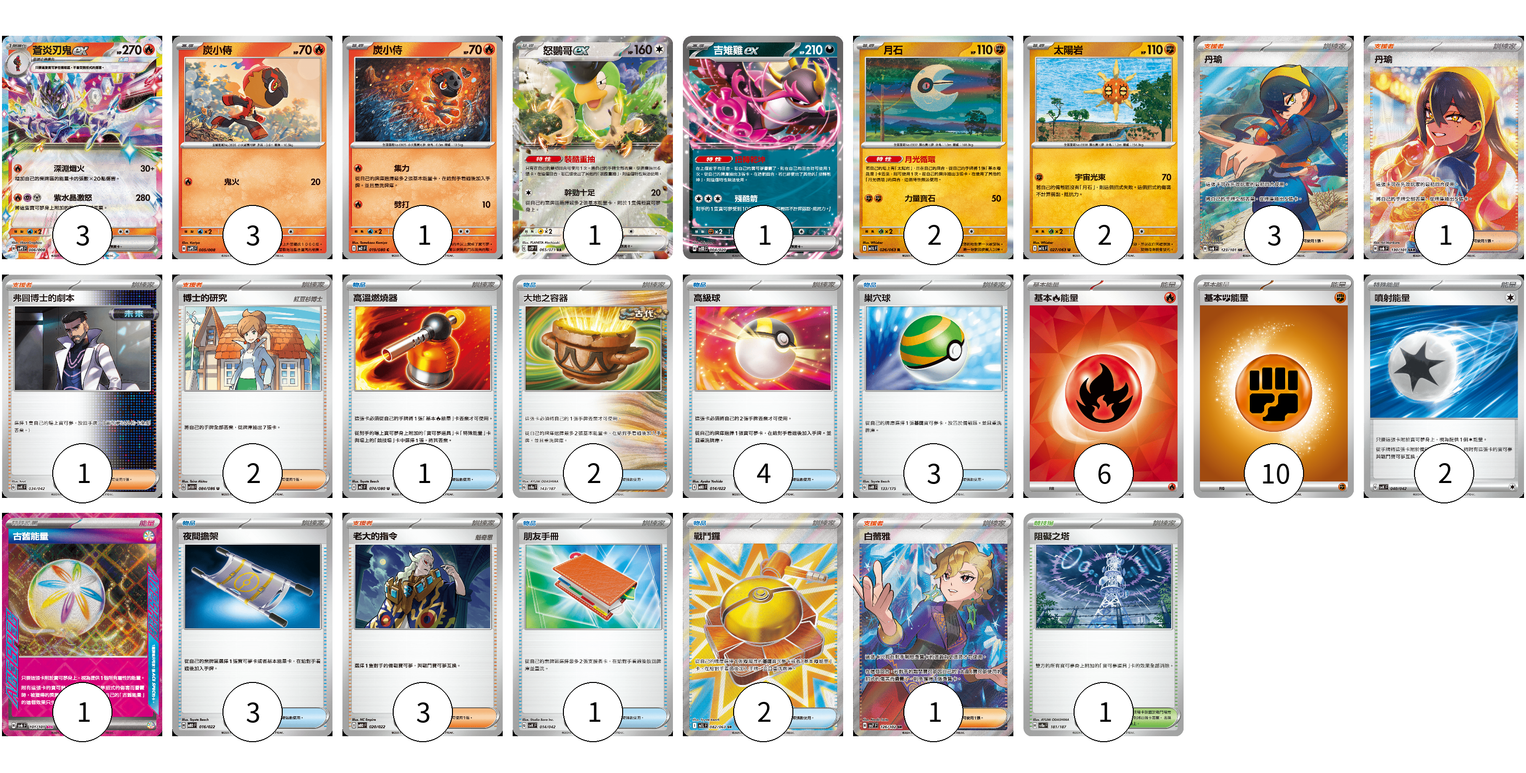 牌組構築方案 以此牌組為基礎新構築牌組 顯示卡面 顯示列表 寶可夢卡(13) 3 3 1 1 1 2 2 物品卡(16) 1 2 4 3 3 1 2 支援者卡(11) 3 1 1 2 3 1 競技場卡(1) 1 能量卡(19) 6 10 2 1 寶可夢卡(13) 卡牌名稱 張數 卡牌名稱 張數 蒼炎刃鬼ex SVPS 006/008 03 炭小侍 SVPS 005/008 03 炭小侍 M2 019/080 01 怒鸚哥ex SV2P 065/071 01 吉雉雞ex SVOD 004/020 01 月石 M1L 026/063 02 太陽岩 M1L 027/063 02 物品卡(16) 卡牌名稱 張數 卡牌名稱 張數 高溫燃燒器 M2 074/080 01 大地之容器 SV8a 143/187 02 高級球 MBD 014/022 04 巢穴球 SVM 133/175 03 夜間擔架 MBD 016/022 03 朋友手冊 SVK 014/042 01 戰鬥鑼 M1L 082/063 02 支援者卡(11) 卡牌名稱 張數 卡牌名稱 張數 丹瑜 SV6 123/101 03 丹瑜 SV6 130/101 01 弗圖博士的劇本 SVK 034/042 01 博士的研究 SV11B 084/086 02 老大的指令 MBD 020/022 03 白蕾雅 SV7 126/102 01 競技場卡(1) 卡牌名稱 張數 卡牌名稱 張數 阻礙之塔 SV8a 181/187 01 能量卡(19) 卡牌名稱 張數 卡牌名稱 張數 基本【火】能量 SVQL FIR 06 基本【鬥】能量 M-P FIG 10 噴射能量 SVK 040/042 02 古舊能量 SV6 101/101 01 以此牌組為基礎新構築牌組 牌組編碼 fsRyYG-RvtrTF-RIOkxz copy 列印牌組單 牌組編碼已複製 分享至SNS