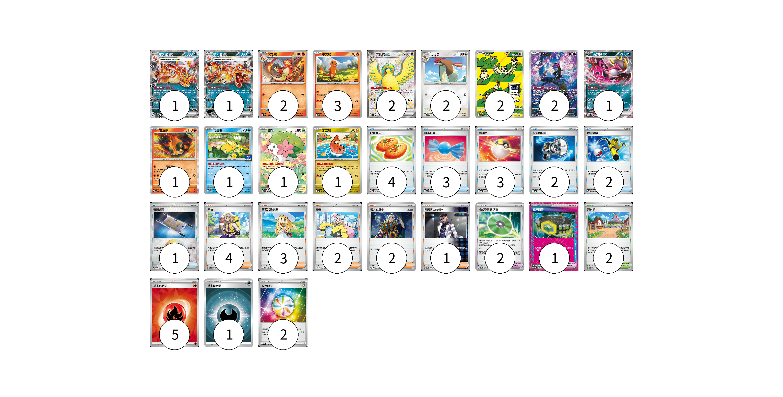 牌組構築方案 以此牌組為基礎新構築牌組 顯示卡面 顯示列表 寶可夢卡(20) 1 1 2 3 2 2 2 2 1 1 1 1 1 寶可夢道具(3) 2 1 物品卡(15) 4 3 3 2 2 1 支援者卡(12) 4 3 2 2 1 競技場卡(2) 2 能量卡(8) 5 1 2 寶可夢卡(20) 卡牌名稱 張數 卡牌名稱 張數 噴火龍ex SVTL 006/021 01 噴火龍ex SV4a 115/190 01 火恐龍 M2 012/080 02 小火龍 SVTL 001/021 03 大比鳥ex SV4a 335/190 02 比比鳥 SVK 004/042 02 波波 SV3 118/108 02 願增猿 SV6 107/101 02 吉雉雞ex SV8a 104/187 01 古玉魚 SV4K 016/066 01 可達鴨 SV-P 220/SV-P 01 謝米 SV9a 066/063 01 米立龍 SV8a 121/187 01 寶可夢道具(3) 卡牌名稱 張數 卡牌名稱 張數 招式學習器 演進 SV8a 160/187 02 極限腰帶 SV8a 159/187 01 物品卡(15) 卡牌名稱 張數 卡牌名稱 張數 好友寶芬 MBD 013/022 04 神奇糖果 MBG 013/022 03 高級球 MBD 014/022 03 反擊捕捉器 SV8a 139/187 02 厲害釣竿 SVOD 010/020 02 夜間擔架 SV8a 151/187 01 支援者卡(12) 卡牌名稱 張數 卡牌名稱 張數 派帕 SVK 035/042 04 莉莉艾的決意 M1L 062/063 03 奇樹 SVOD 016/020 02 老大的指令 SVOD 019/020 02 弗圖博士的劇本 SV8a 175/187 01 競技場卡(2) 卡牌名稱 張數 卡牌名稱 張數 深缽鎮 SVK 039/042 02 能量卡(8) 卡牌名稱 張數 卡牌名稱 張數 基本【火】能量 SVQL FIR 05 基本惡能量 SLD DAR 01 夜光能量 SVK 042/042 02 以此牌組為基礎新構築牌組 牌組編碼 fstAgz-nkGhJW-IelWml copy 列印牌組單 牌組編碼已複製 分享至SNS